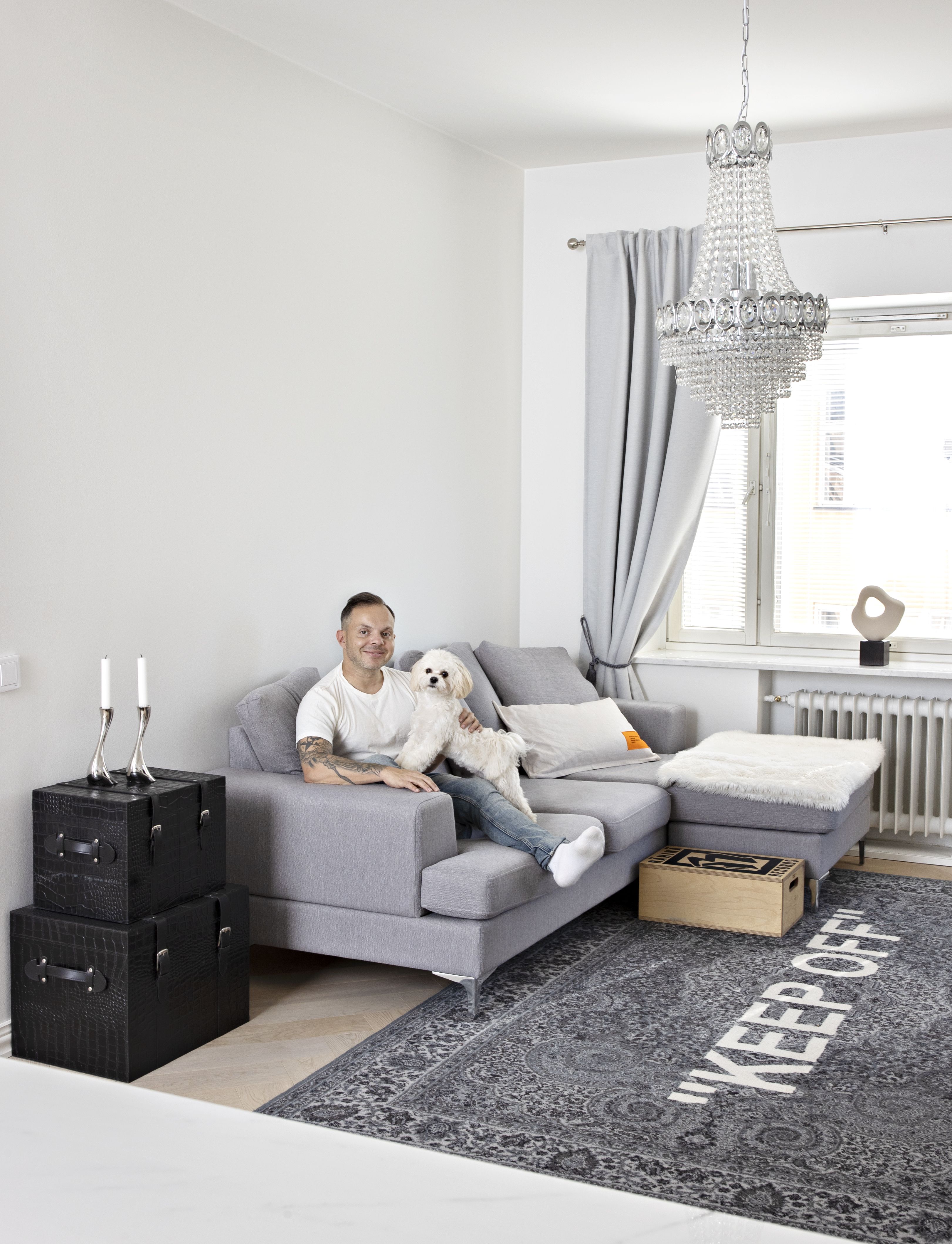Tullessani kotiin vaihdan ensimmäisenä verkkarit jalkaan, peuhaan Milo-koiran kanssa ja otan rennosti. Olen sekä työn että vapaa-ajan puitteissa paljon liikenteessä, joten vastapainoksi tykkään viettää aikaa kotona. Sohvannurkka on hyvä paikka tuijotella kaupunkimaisemaa, vastapäisiä kauniita jugendtaloja ja iltaisin fiilistellä kulmaikkunasta siintävää auringonlaskua. Asunnossamme parasta on valoisuus ja tilan tuntu sekä meille kodikkaat tavarat. Neliömääräkin on kahdelle aikuiselle ja pikkukoiralle oikein sopiva.