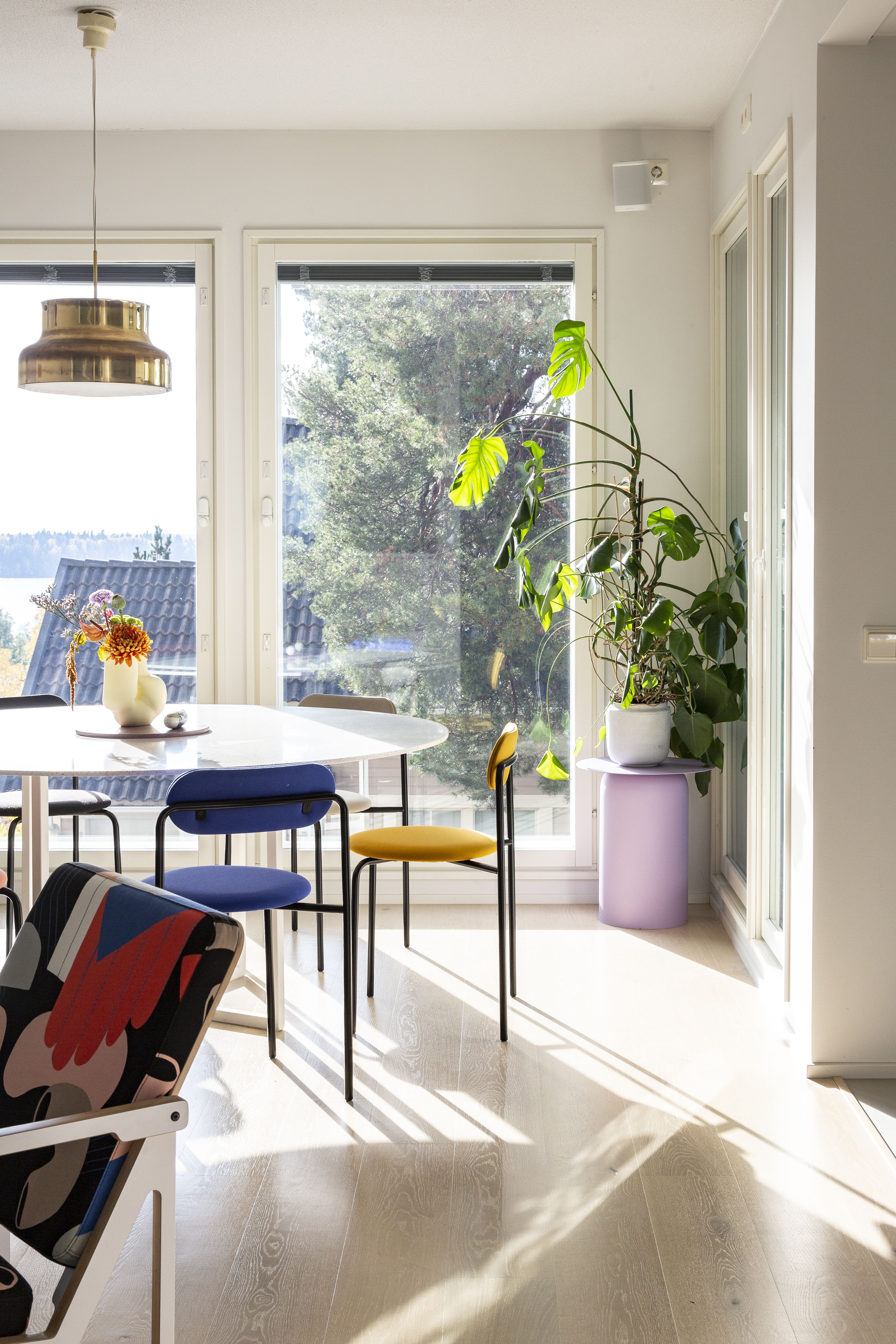 Tässä asunnossa rakastuin ensimmäiseksi valoon, joka tulee vapaasti sisään koko seinän mittaisista päätyikkunoista. Asumme korkealla Pispalanharjun kupeessa, ja ikkunoistamme avautuu maisema kattojen ja puiden latvojen yli Pyhäjärvelle. Näkymä lisää avaruuden tuntua entisestään.