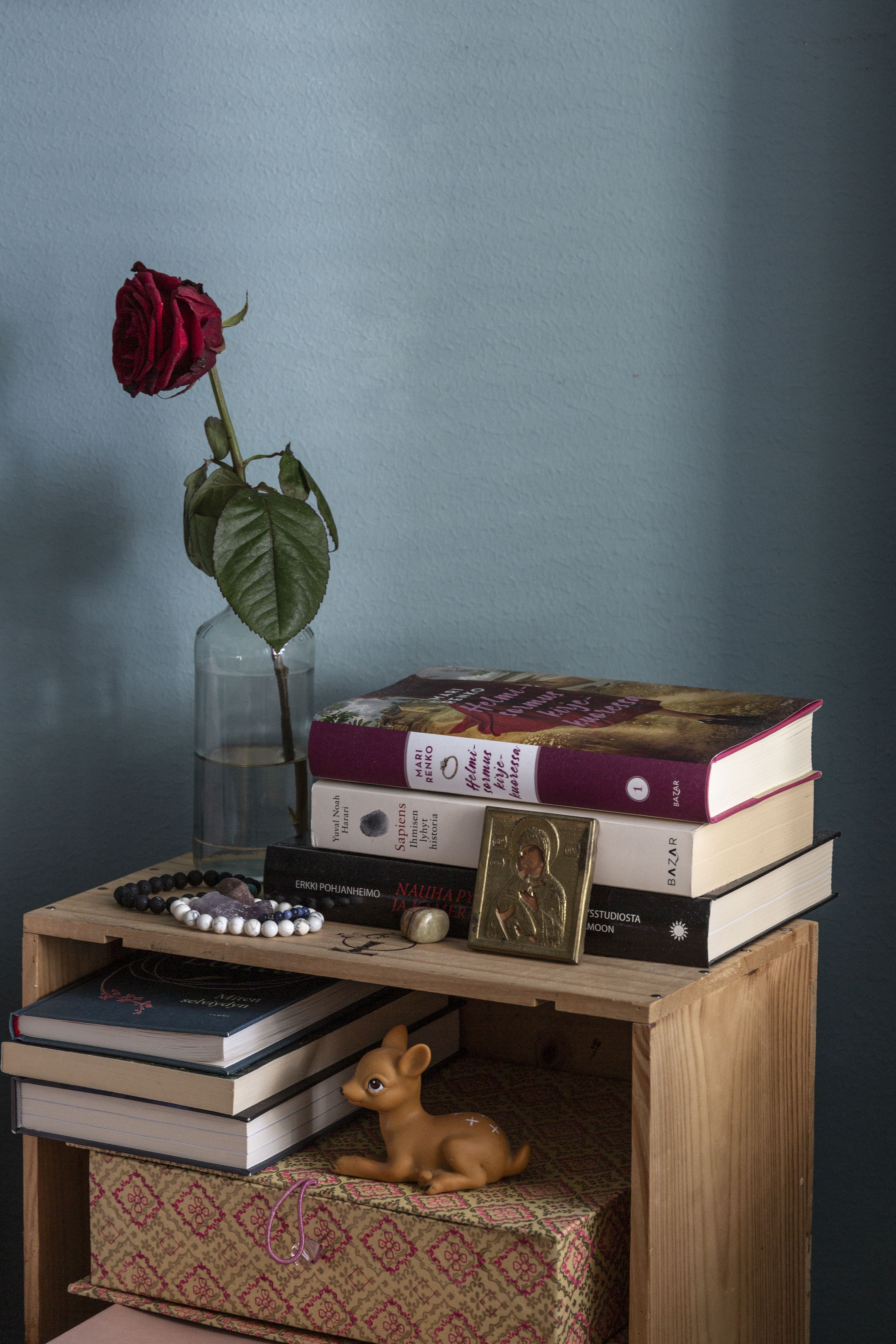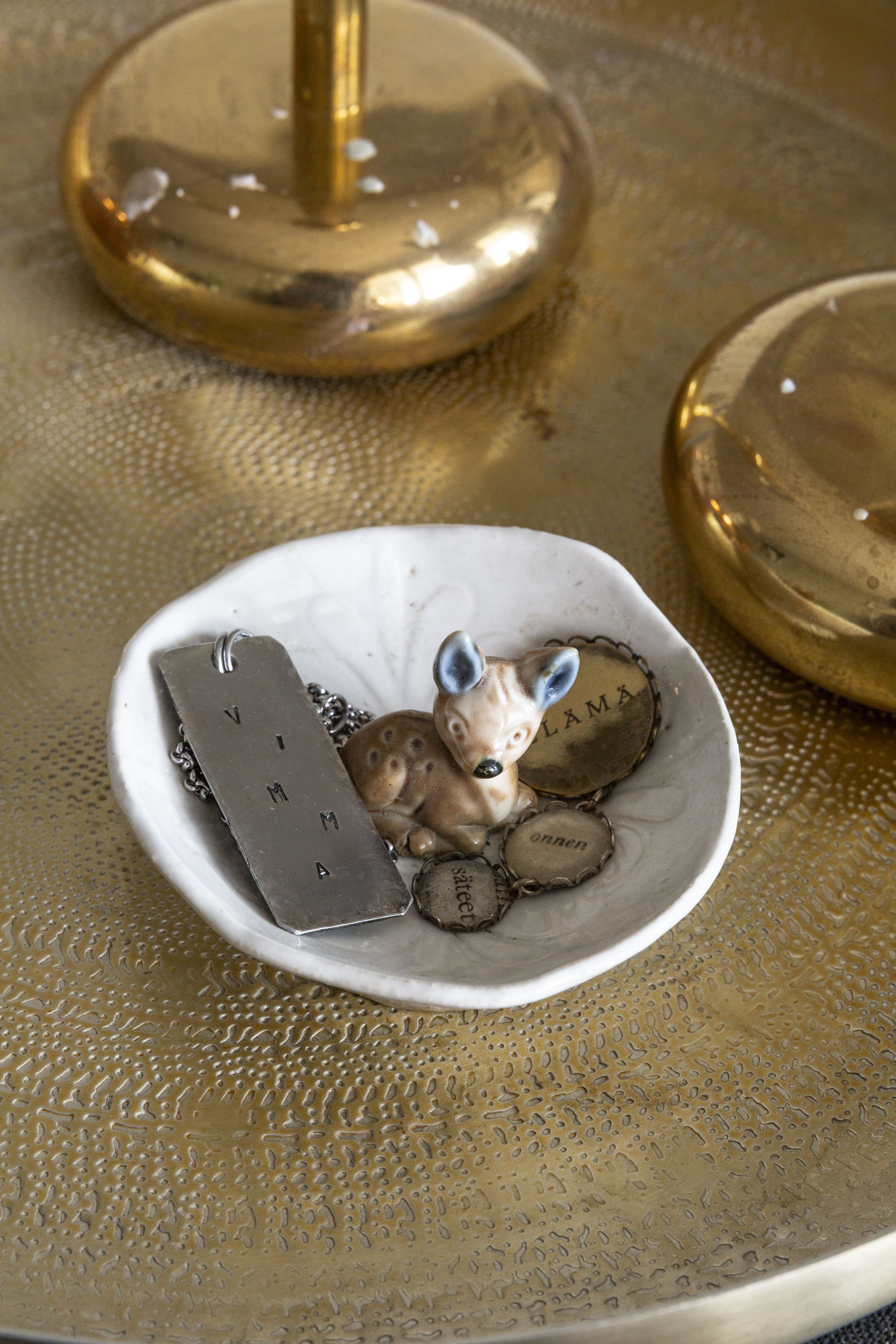 Moniin esineistäni liittyy merkityksellisiä sukupolvelta toiselle siirtyneitä tarinoita. Olen kuitenkin päättänyt, ettei minun tarvitse pitää kaikkia suvussa kulkeneita asioita esillä. Hiljattain olen opetellut luopumaan asioista ja antanut perimiäni juttuja eteenpäin lapsilleni ja sisaruksilleni. Iän myötä huomaan myös kiinnostuvani uudenlaisista asioista. Aiemmin suomalainen muotoilu ei puhutellut minua lainkaan. Nyt olen kuitenkin hankkinut klassikoita, joista tulee toivottavasti seuraavien sukupolvien sukuaarteita.