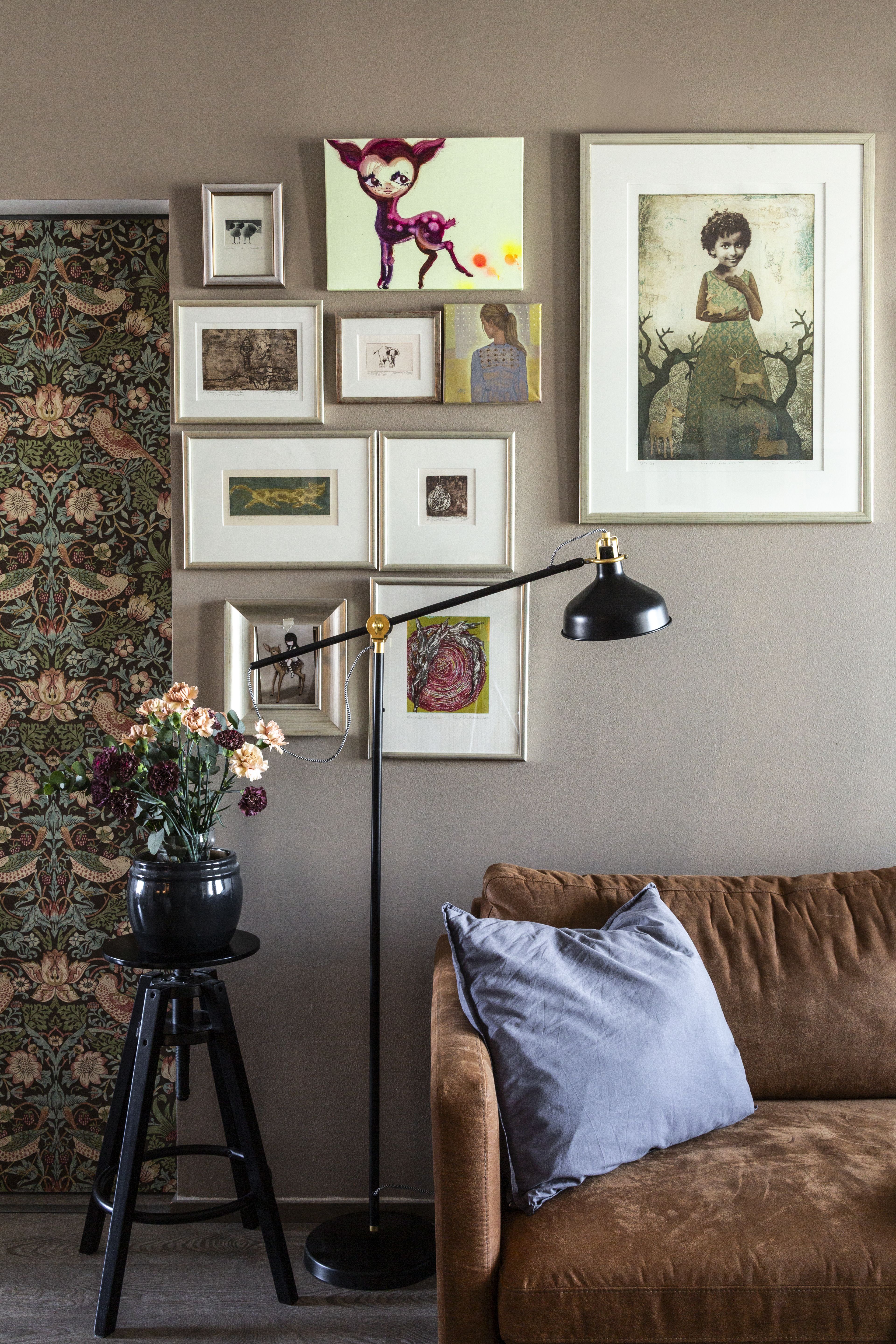 Olen sisustajana impulsiivinen ja myös melko suurpiirteinen. Saan sisustuskohtauksia tyypillisesti öisin, kun pitäisi mennä nukkumaan. Silloin seinän väri tai kalustuksen järjestys vaihtuu hetkessä. Kaikkien kalusteiden pitää tästä syystä olla sellaisia, että pystyn liikuttamaan niitä yksin. Viimeisen kahden kuukauden aikana sohva ja sen myötä koko olohuoneen kalustus on mennyt uusiksi viisi kertaa. En kuitenkaan ostele uusia kalusteita, vaan nautin olemassa olevien järjestämisestä uudella tavalla. Alkuvuodesta oivalsin haluavani punaisen eteisen, kun istuin sohvalla ja katselin kelim-mattoni punaista raitaa. Lähdin siltä istumalta K-rautaan maaliostoksille ja maalasin seinän vielä samana iltana. Sisustuksen vapaa muunteleminen tuo arkeen kaipaamaani piristystä.