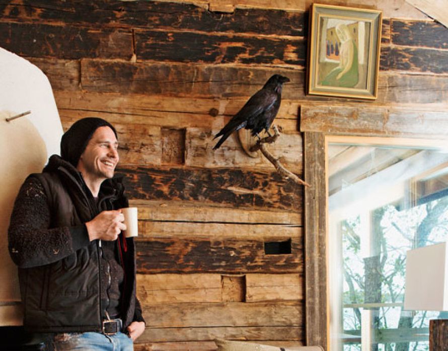 Muusikko Lauri Tähkän piilopirtti on yhtä särmikäs kuin isäntänsä. Tölliin mahtuu korppi, kitaroita ja elokuvateatterin penkit. Katso kuvat!
