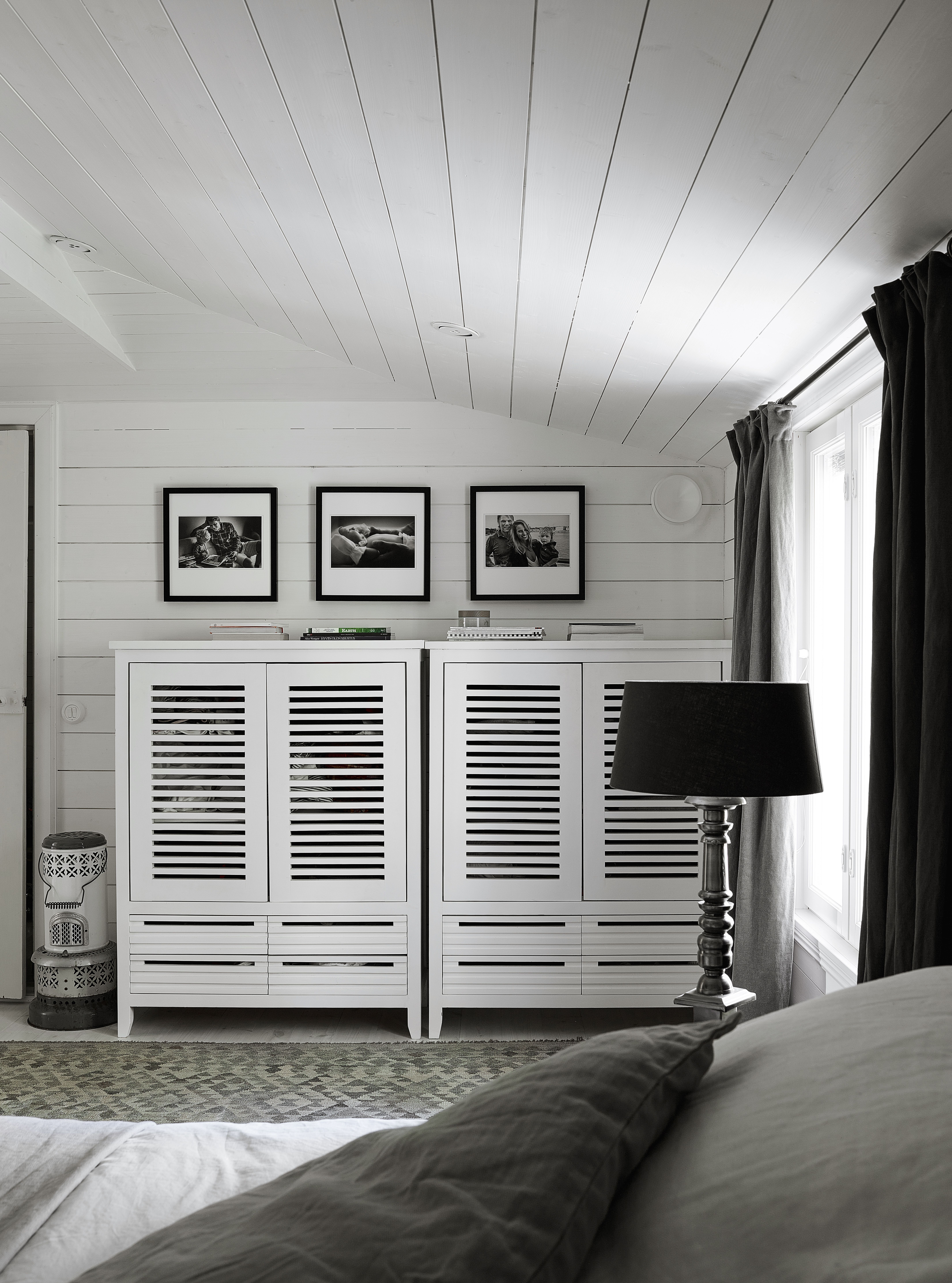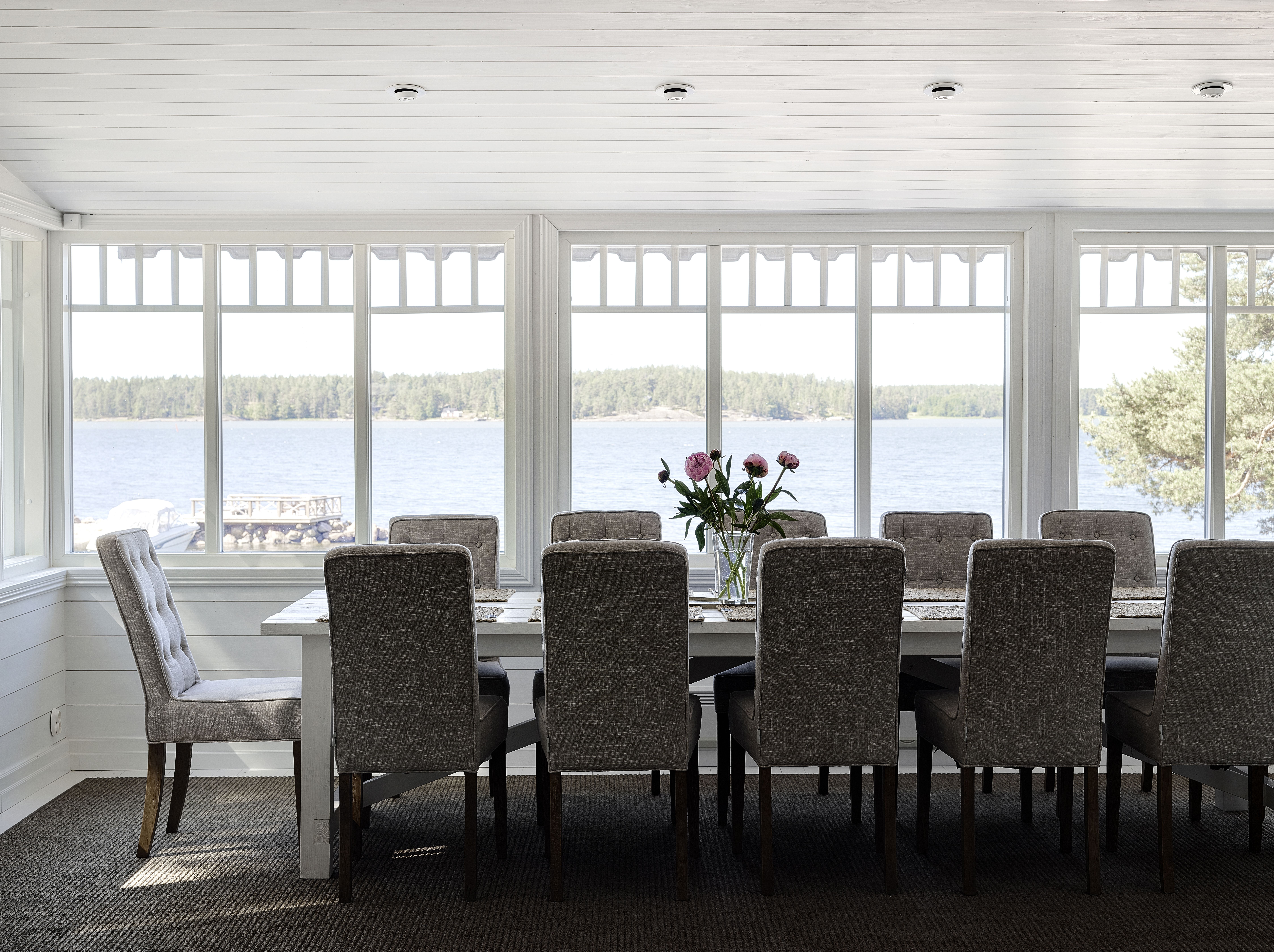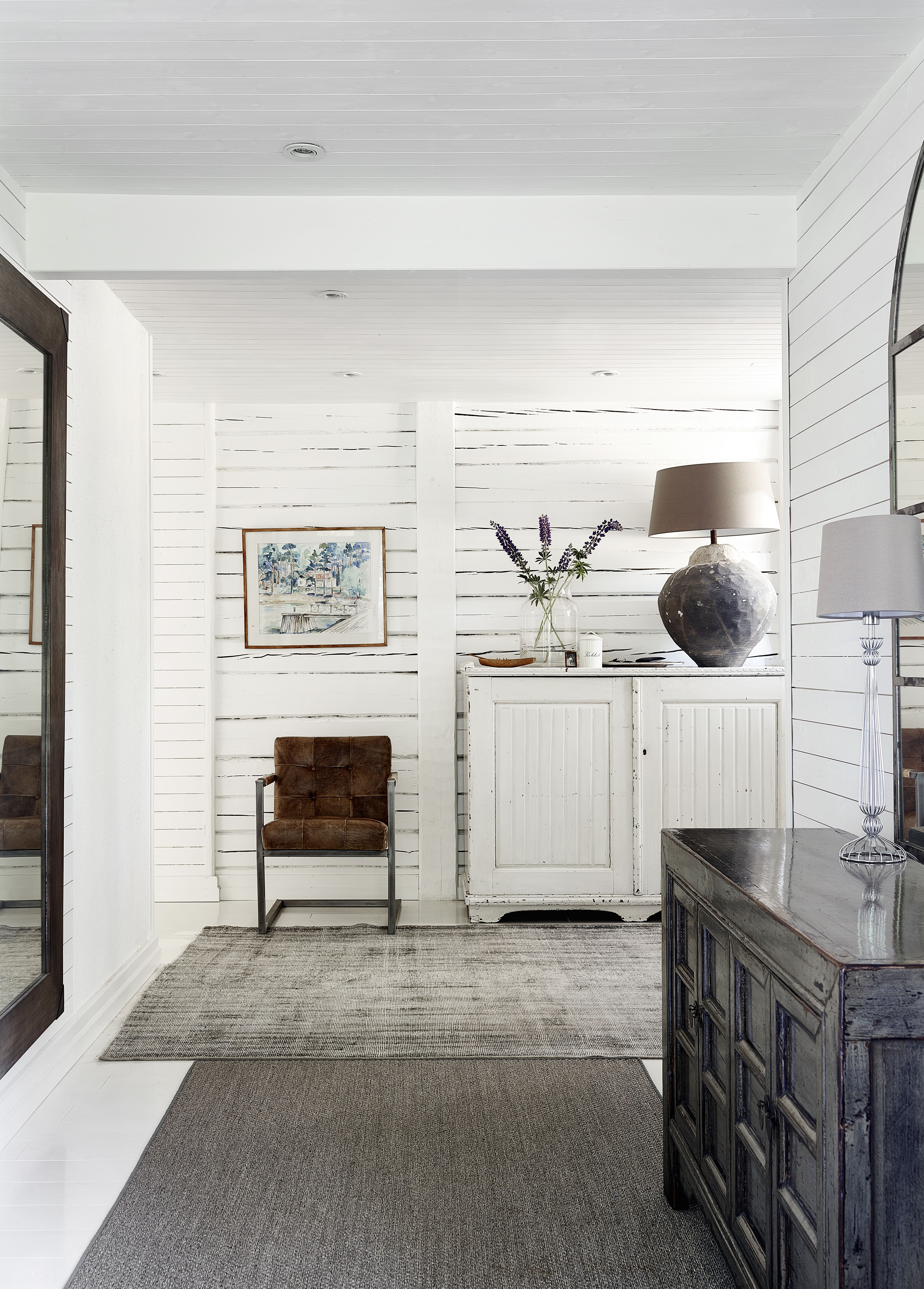 Sean: Halusin tavoitella menneiden aikojen tunnelmaa ja ottaa siihen ripauksen amerikkalaista Hamptons-henkeä mukaan. Siksi valitsin vaakalaudoituksen kaikkiin sisäpintoihin. Olemme asuneet pitkään Amerikassa, ja tunnelma tuntui meille luontevalta valinnalta. Huvilan sijainti meren rannalla sopii hyvin tyyliin.
