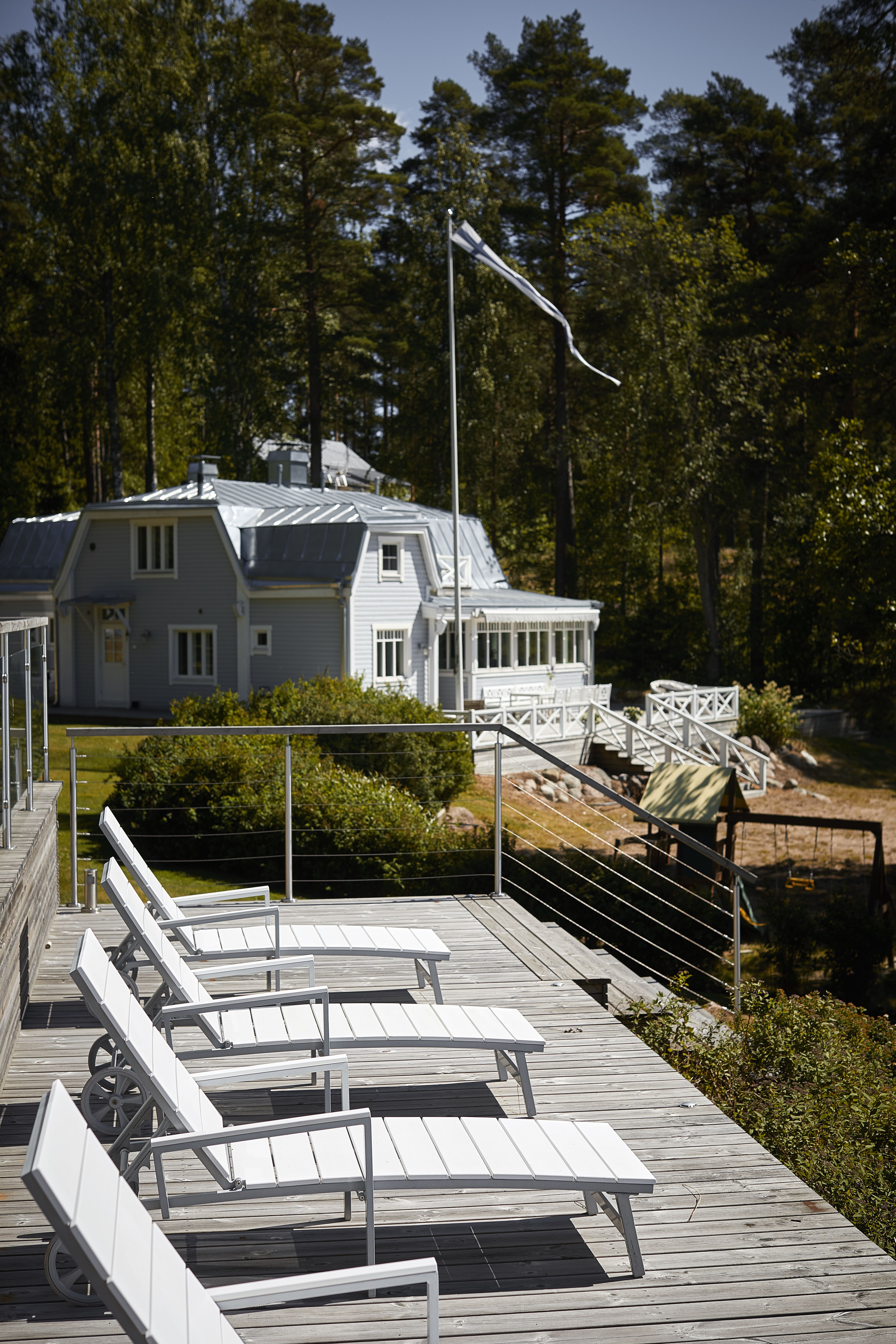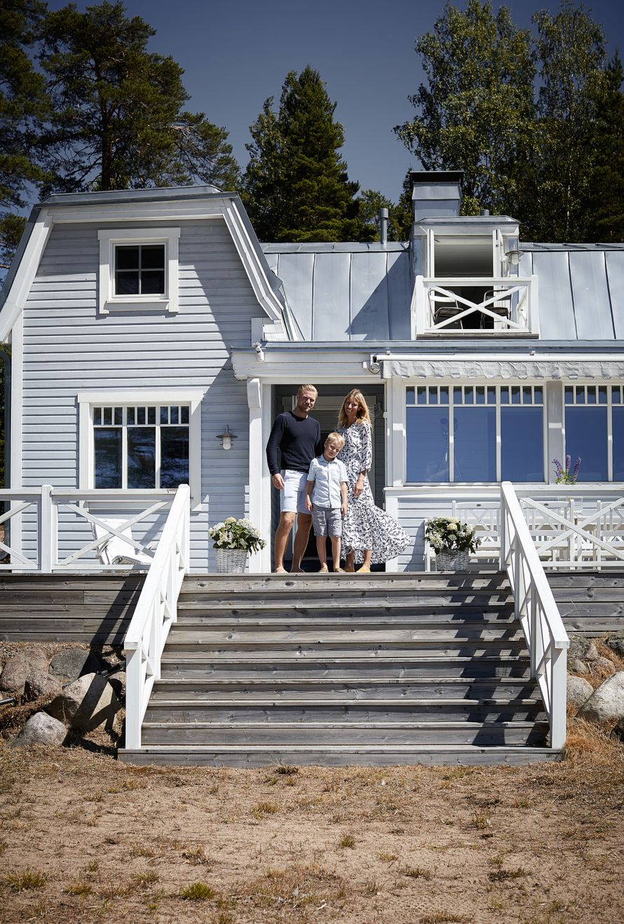Isoäitini päätti lähteä katsomaan tätä paikkaa 1960-luvulla, vaikka he olivat isoisäni kanssa suunnitelleet hankkivansa kesätilan lännestä. Hän rakastui paikkaan ensisilmäyksellä, joten isovanhempani ostivat paikan neljä tonttia sekä läheisen saaren. Tämä harmaa huvila on rakennuksista vanhin, vuodelta 1917. Huvila oli pitkään isäni veljen omistuksessa, kunnes se siirtyi vanhemmilleni 90-luvun puolivälissä. Vierailin kuitenkin jo varhaislapsuudessani usein serkkujeni luona tässä huvilassa, sillä minun perheeni omisti talon viereiseltä tontilta. Juoksimme talosta toiseen, urheilimme, uimme, leikimme ja nautimme huolettomista kesäpäivistä lähisuvun kesken. Vuonna 2012 ostimme Vilman kanssa huvilan vanhemmiltani, ja he puolestaan siirtyivät viereiseen taloon. On mahtavaa, että poikamme Tyson voi juosta isovanhempiensa luokse aina kun haluaa.