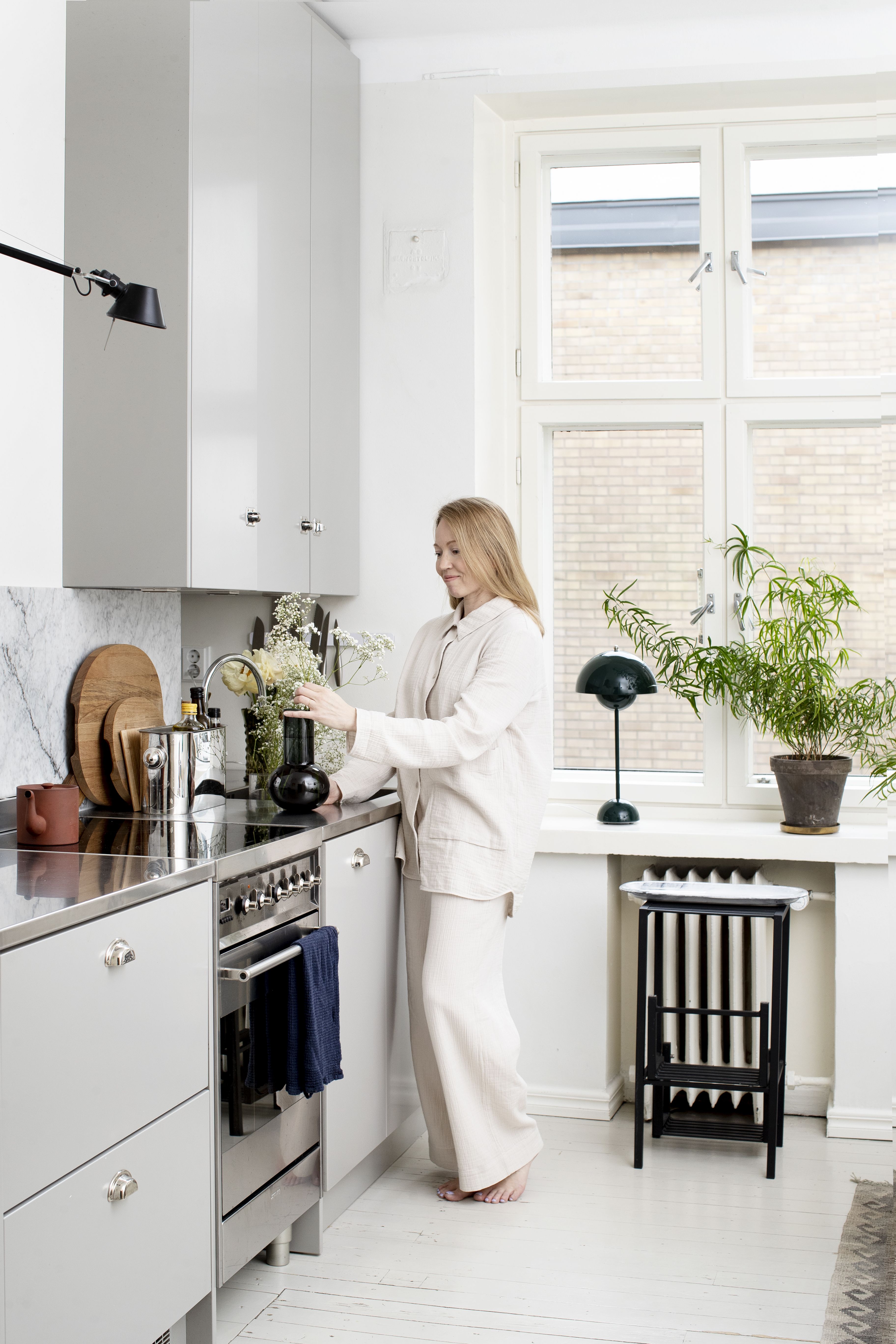 Asumme sisäpiha-asunnossa, ja pihamme ainoa puu kaadettiin joitakin vuosia sitten. Siksi olemme kasanneet olohuoneen ikkunalaudan täyteen viherkasveja. Kasvien avulla luontosuhdetta voi vaalia keskellä kaupunkia kerrostalossa. Ne ovat vähän kuin lemmikkejämme. En ole viherpeukalo, joten kasvimme ovat helppohoitoisia. Sisustussuunnittelijaystäväni suositteli erilaisia parsakasveja, ne toimivat. Osa kasveista muutti mukanamme jo edellisestä kodistamme, eli jotain olen tehnyt oikein. Perjantai on kastelupäivä. Ostan mielelläni myös leikkokukkia kotimme lähellä olevasta Bud Helsingistä ja Inbloomista.
