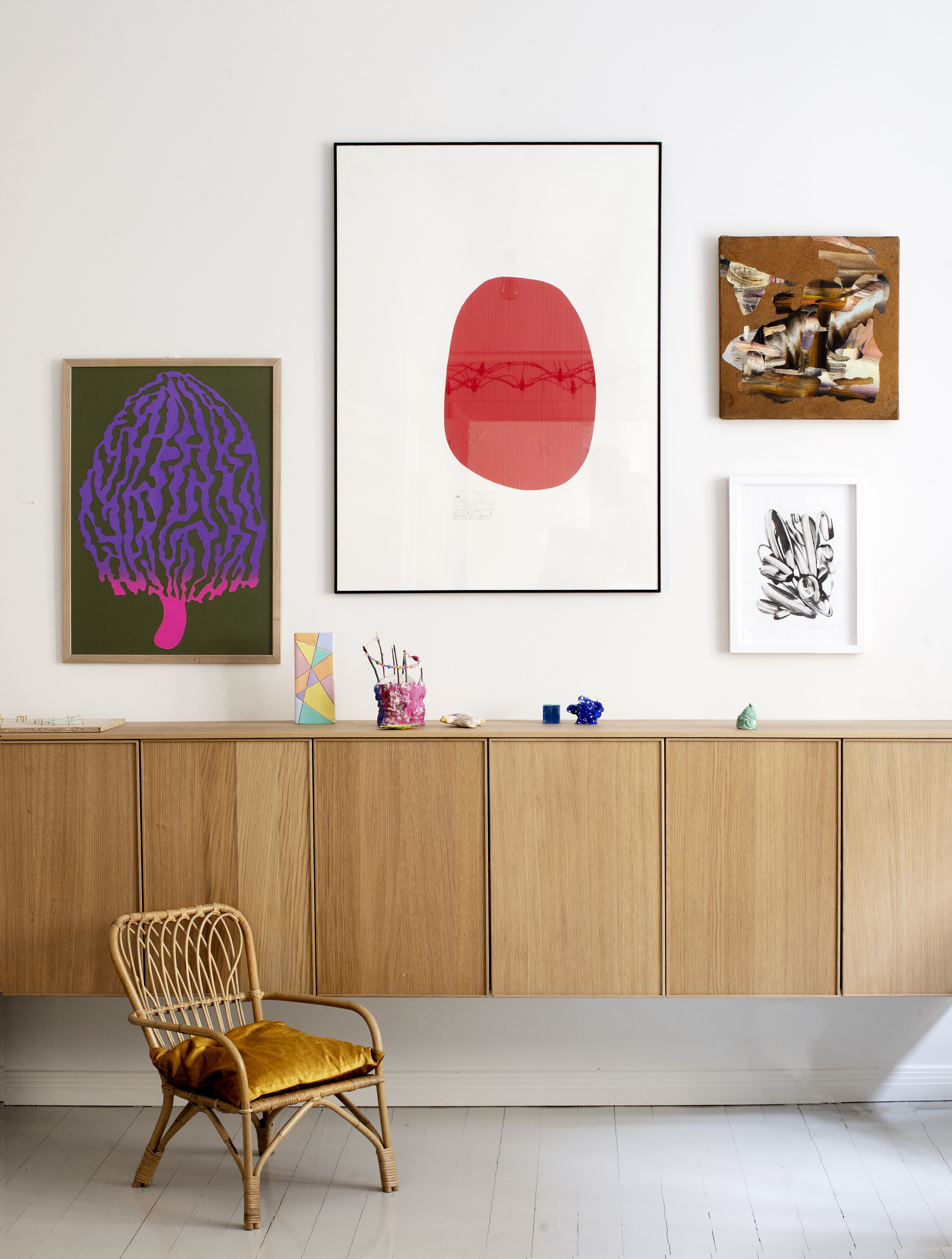 Vaikka olemme asuneet asunnossamme jo kymmenen vuotta, taulut ovat löytäneet lopullisille paikoilleen vasta hiljattain. Halusimme miettiä rauhassa, minne teokset sopivat. Niillä on iso merkitys kodin persoonassa ja tunnelman luomisessa. Janne Kaitalan Sisäkumissa hurmasivat värit. Keittiössä oleva Emmi Tavelan Banaanit ja kesäkurpitsa kulhossa miellytti esteettisesti. Lasikulho muistutti työstäni Iittalalla. Taulut ovat elämän suuntaviivoja, muistoja.
