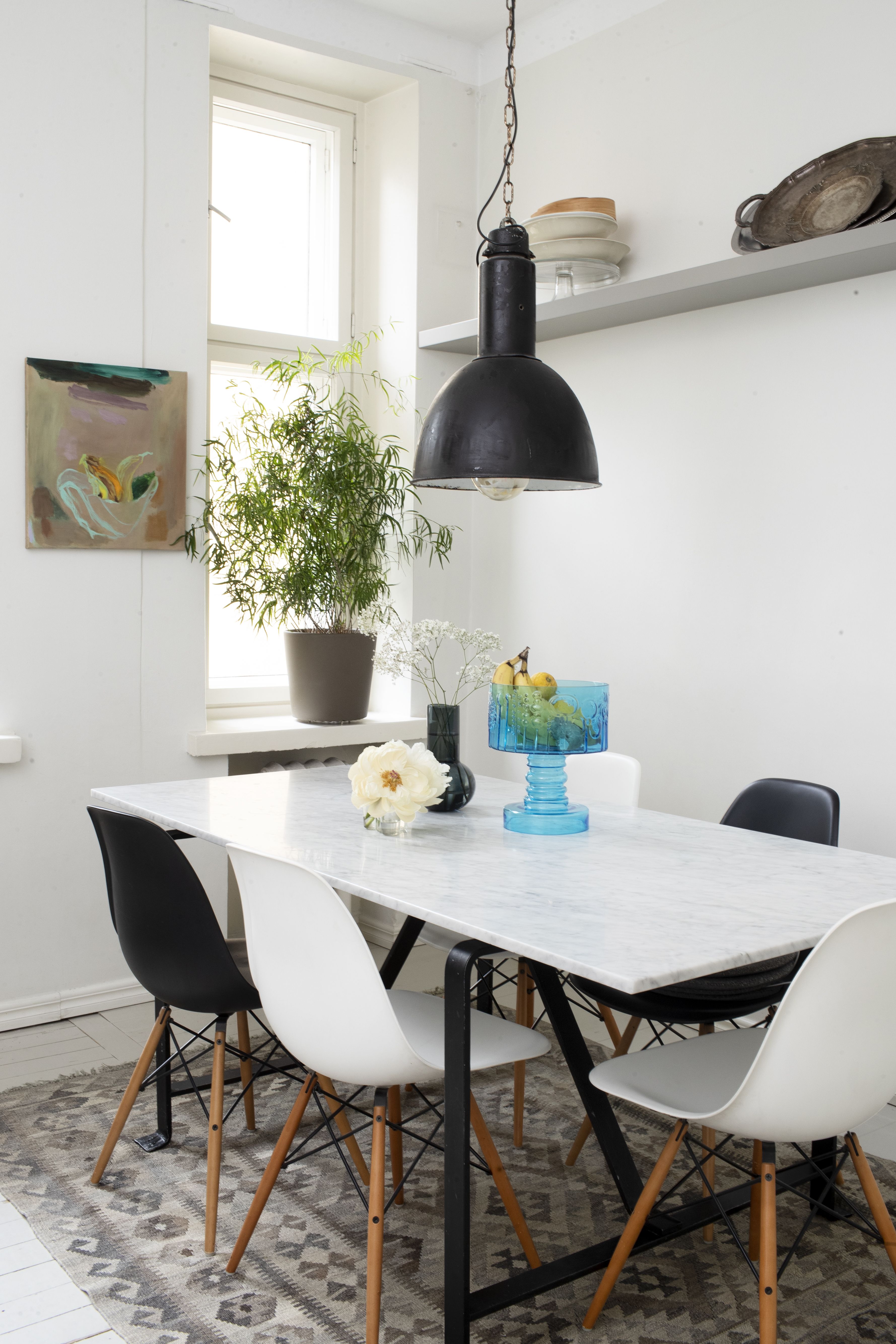 Keittiö on kodin sydän -sanonta pitää kohdallamme paikkansa. Yritämme arkisin pitää kiinni periaatteesta, että syömme illallisen yhdessä saman pöydän ääressä. Keittiömme edustaa mix and match -ajattelua. Emme kerää mitään tiettyä astiasarjaa, vaan sekoittelemme kippoja ja kuppeja keskenään. Marmoripöytä löytyi aikanaan Punavuori kierrättää -ryhmästä ja kelim-matto Ullanlinnassa sijainneesta sisustuskaupasta. Kutsumme luvattoman harvoin ystäviämme kylään. Kun näin lopulta tapahtuu, tunnelma on erityinen: kupliva ja odottava. Kokeilemme puolisoni kanssa uusia reseptejä ja teemme ruoan yhdessä. Illallisen jälkeen lupaamme, että teemme tätä useammin.