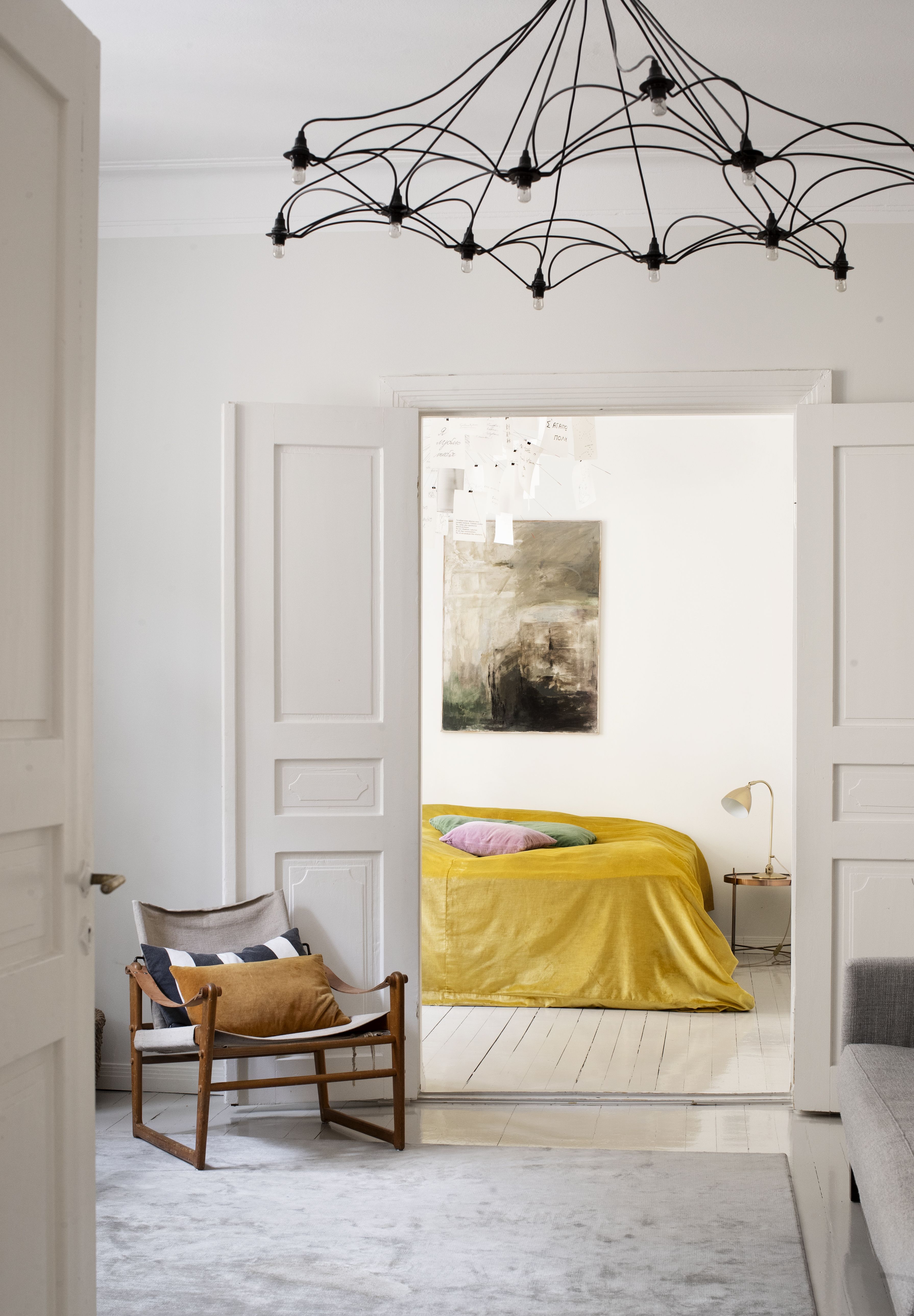 Asuntomme tilan tuntu hurmasi ensinäkemällä. Kun ovet ovat auki, makuuhuone, olohuone ja lastenhuone ovat kuin yhtä avointa tilaa. Valo ei kuitenkaan pääse sisään suoraan, vaan se heijastuu keltaisen naapuritalon kautta. Tuntuu kuin eläisimme aurinkovarjon alla. Valo on lämmin ja kuulas, se sopii meille. Sanon aina, että ikkunoistamme ei avaudu hulppeaa näkymää, mutta kotimme toimii maisemana. Valon ja varjojen leikkiä on ihana seurata. Kun muutimme, meillä oli yksi lapsi. Nyt lapset jakavat huoneensa. Jossain vaiheessa voi tulla ajankohtaiseksi muuttaa, mutta ei vielä. Viihdymme niin hyvin.