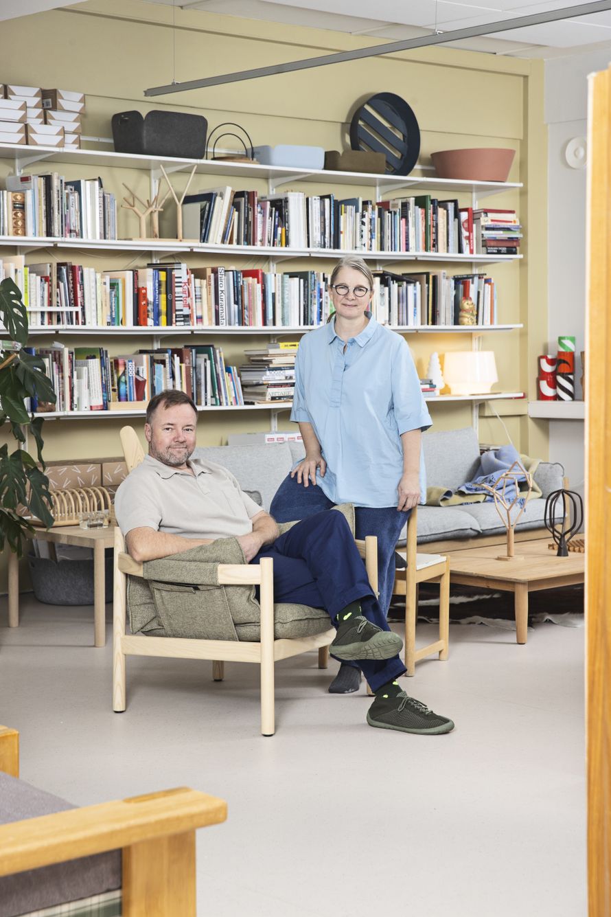 Meillä on pieni tuoliongelma, sanoo suunnittelija Julie Tolvanen, kun hän esittelee Studio Tolvasen upouuden toimiston sisustusta. Tuoleja voi nopealla silmäyksellä laskea tilasta parikymmentä, mutta se on positiivinen ongelma. Osa on Julien ja hänen puolisonsa Mika Tolvasen suunnittelemia, mutta useimmat ovat muiden suunnittelijoiden tuotantoa 1950-70-luvuilta.