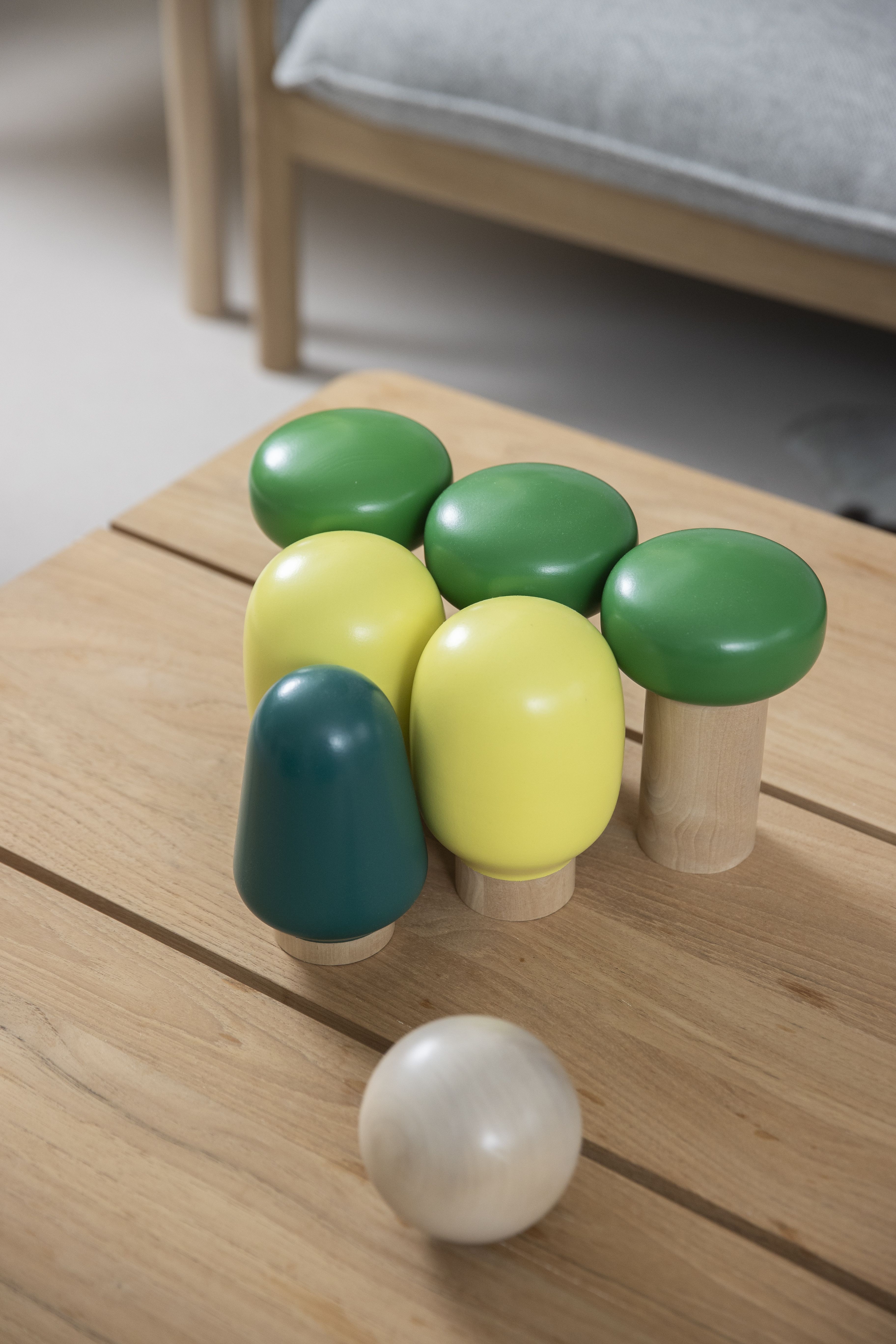 Finnish Design Shop lanseerasi 20-vuotisjuhlavuotensa kunniaksi kokoelman uusia puisia pelejä ja soittimia. Studio Tolvanen suunnitteli Metsäpallo-pelin, jossa kaadetaan puukeiloja.