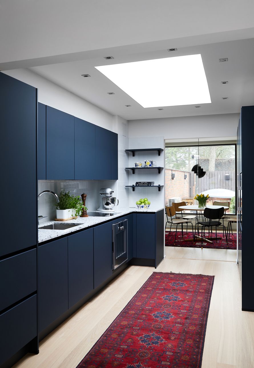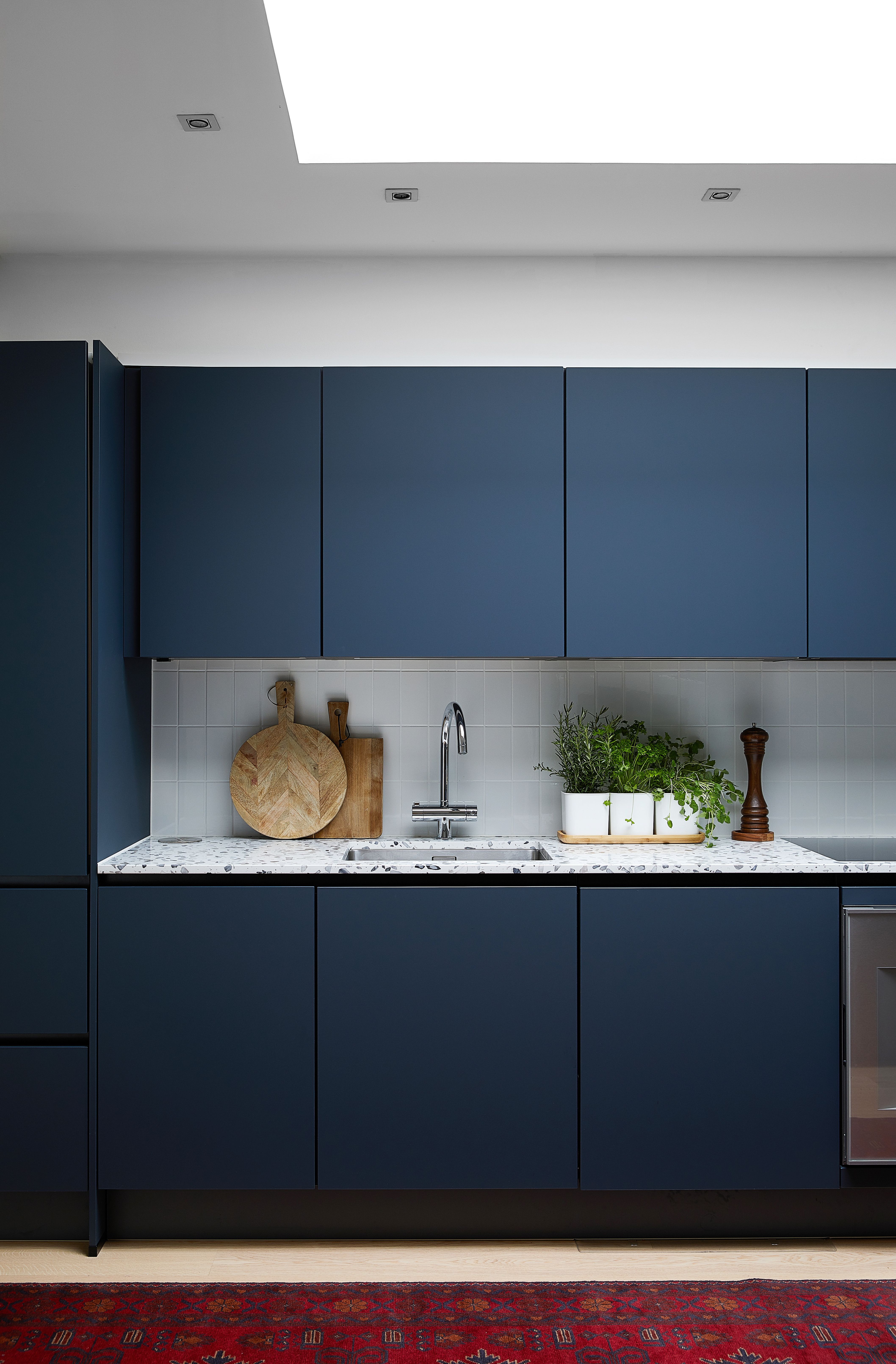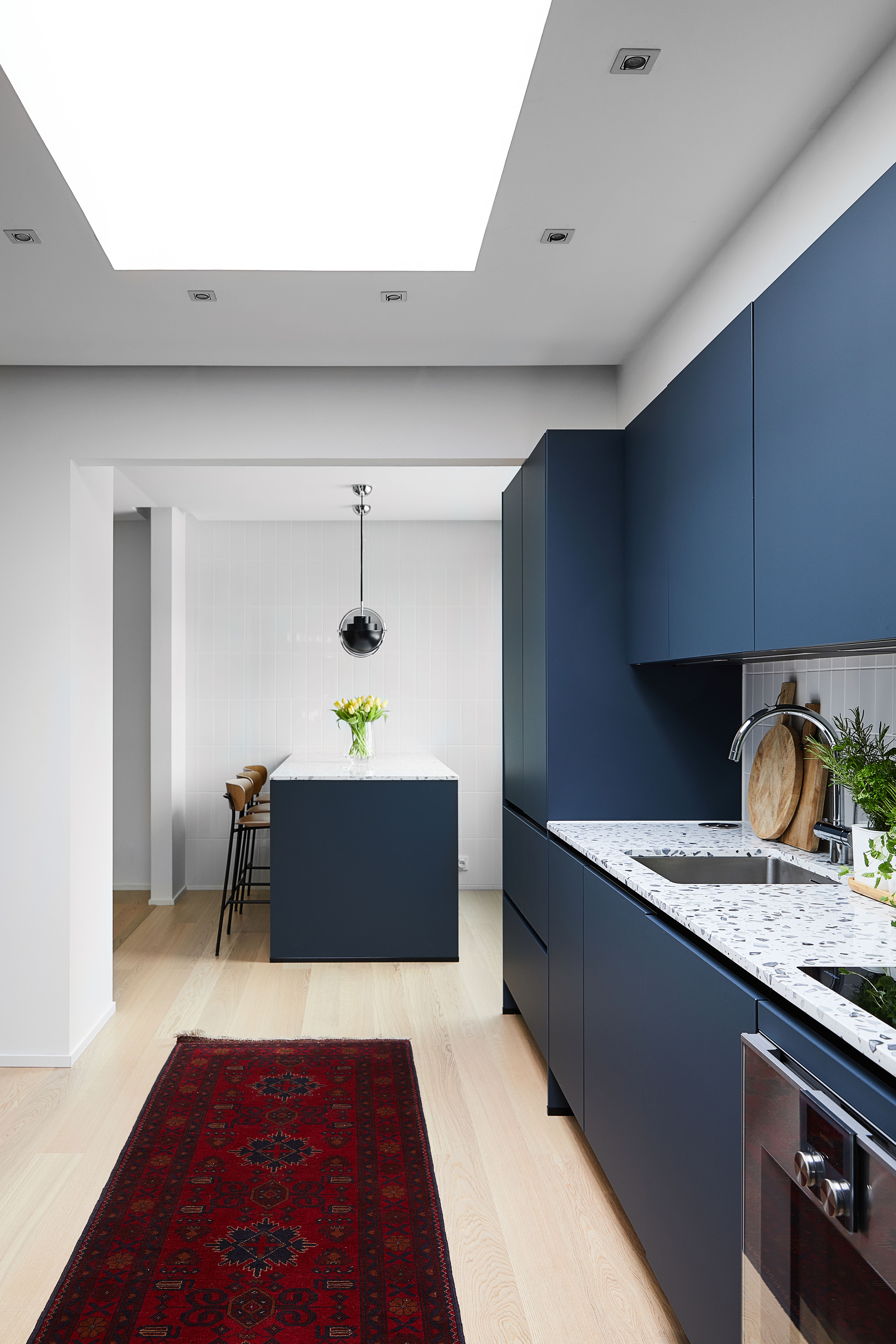 Tommin ja poikien rivitalokodin keittiö päivitettiin reippaan siniseksi ja talon arkkitehtuuriin istuvaksi.