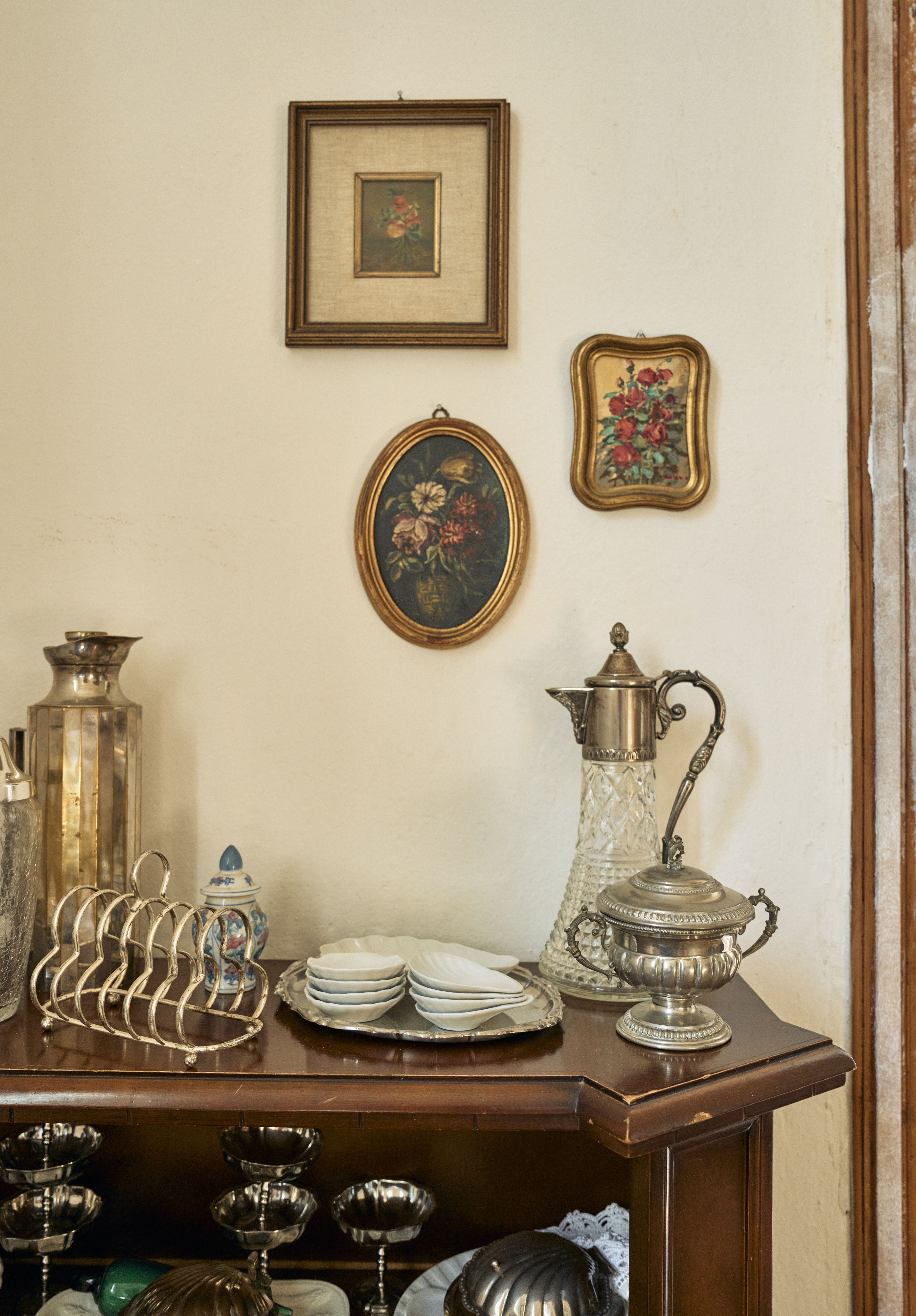Monet löydöt jäävät myös meidän omaan kotiimme. Kun muutimme, talossa oli huonekaluja eri aikakausilta. Osa niistä jätettiin, osa vietiin pois, ja tilalle tuotiin meille rakkaita tavaroita Suomesta. Nyt kodissamme yhdistyy italialainen vanha estetiikka ja meille merkitykselliset esineet.