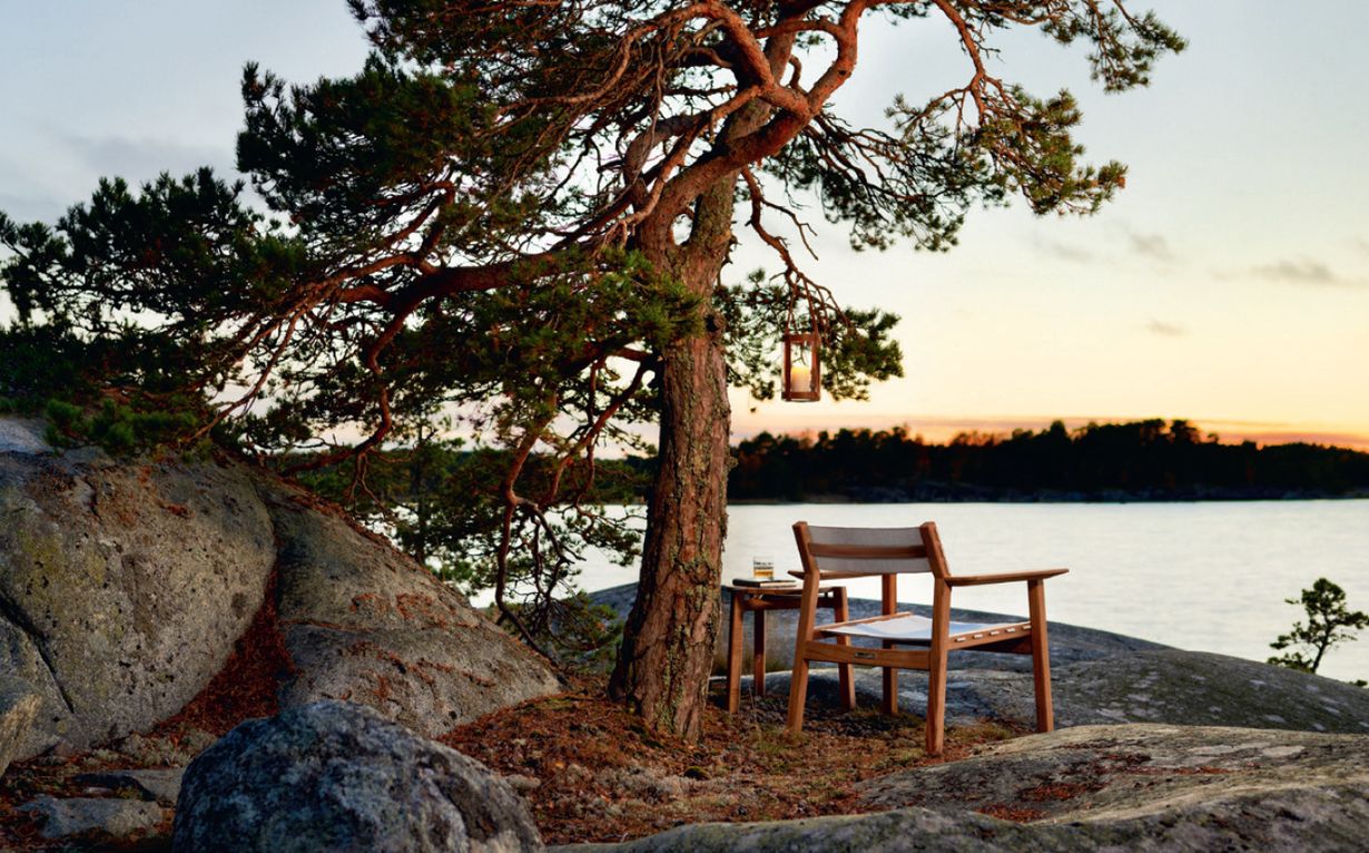 Safarituoli istuu hyvin pohjolan merimaisemaan. Kuvan tuoli Skargaarden, tiedustelut Lanna Möbler.
