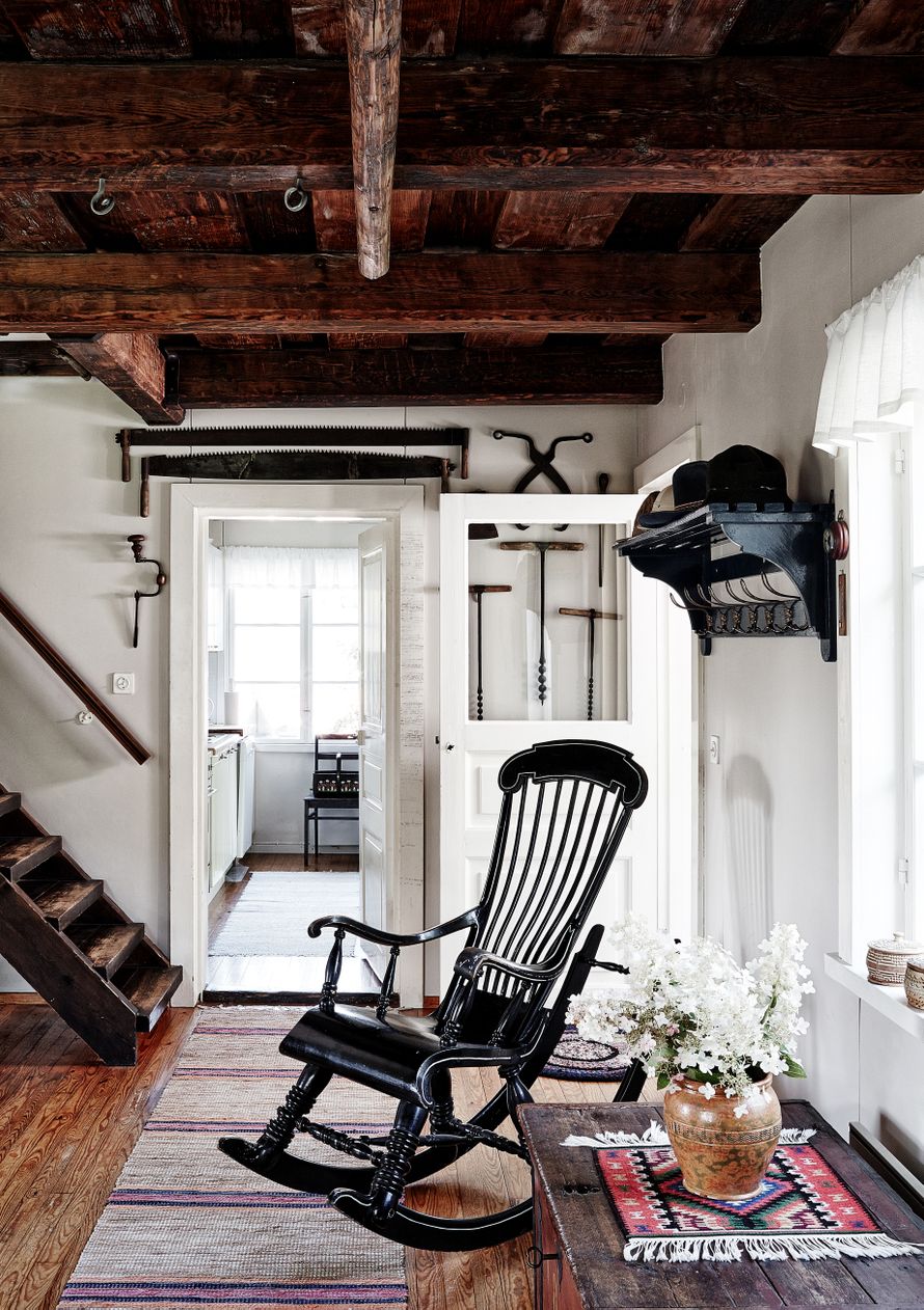 Talon keinutuolit ovat perheen aarteita vanhempien lapsuudesta. Tuvan portaikko johtaa yläkertaan ja ovi keittiöön. Päätalon keittiö on remontoitu 2000-luvulla.