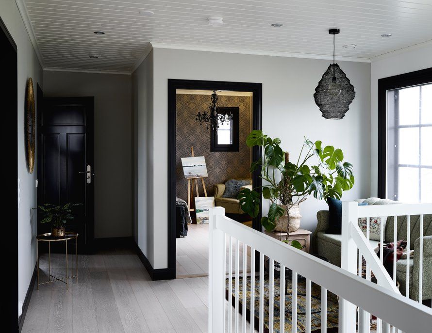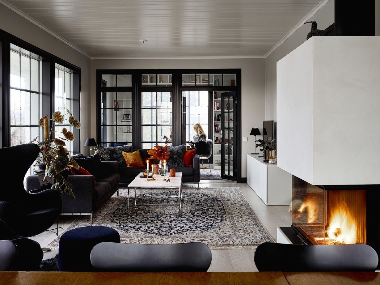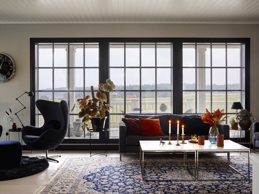 Tämän valkoisen talon henkeen sopivat mielestämme hienosti ryhdikkäät mustat ikkunat ja ovet. Taloa suunniteltaessa oli tärkeää tunne siitä, että maisema tulee lähes sisälle asti ja ikkunoista tulvii tiloihin paljon valoa. Mustat ikkunat kehystävät hienosti maisemaa. Musta antaa mukavasti muutenkin särmää sisustuksen väripalettiin. Siinä on valkoisesta mustaan sisältäen kaikki harmaan sävyt lämmitettynä tammilattialla ja muutamalla tammikalusteella.