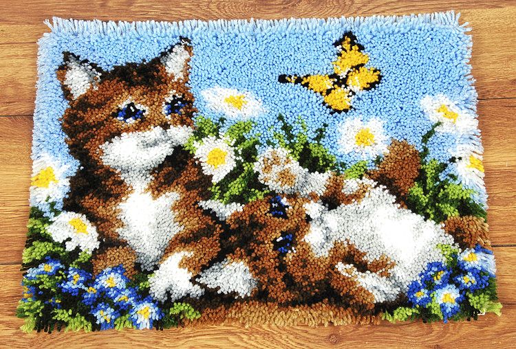 Käsityöperinteet kunniaan. Tee Leikkisät kissanpojat -ryijymatto itse, noin 53 x 39 cm, 67,50 e (sisältää langat ja koukun), Margaretha.