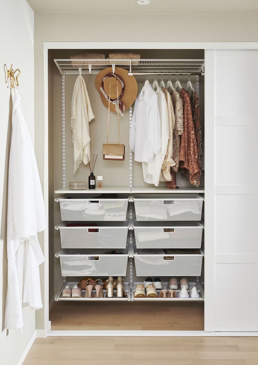 Pysähdy miettimään arkeasi ja suosi vaatekaapissa itsellesi mieluisimpia säilytystapoja. Jos viikkaaminen turhauttaa, asenna vetolaatikoiden ja hyllyjen tilalle tankoja. Kun käytössä on paljon hyllytilaa, jätä niille noin neljäsosa tyhjää tilaa penkomisvaraksi. Koko tilan saa hyödynnettyä, kun hyllyt korvaa vetolaatikoilla, joissa kaiken näkee yhdellä vilkaisulla.