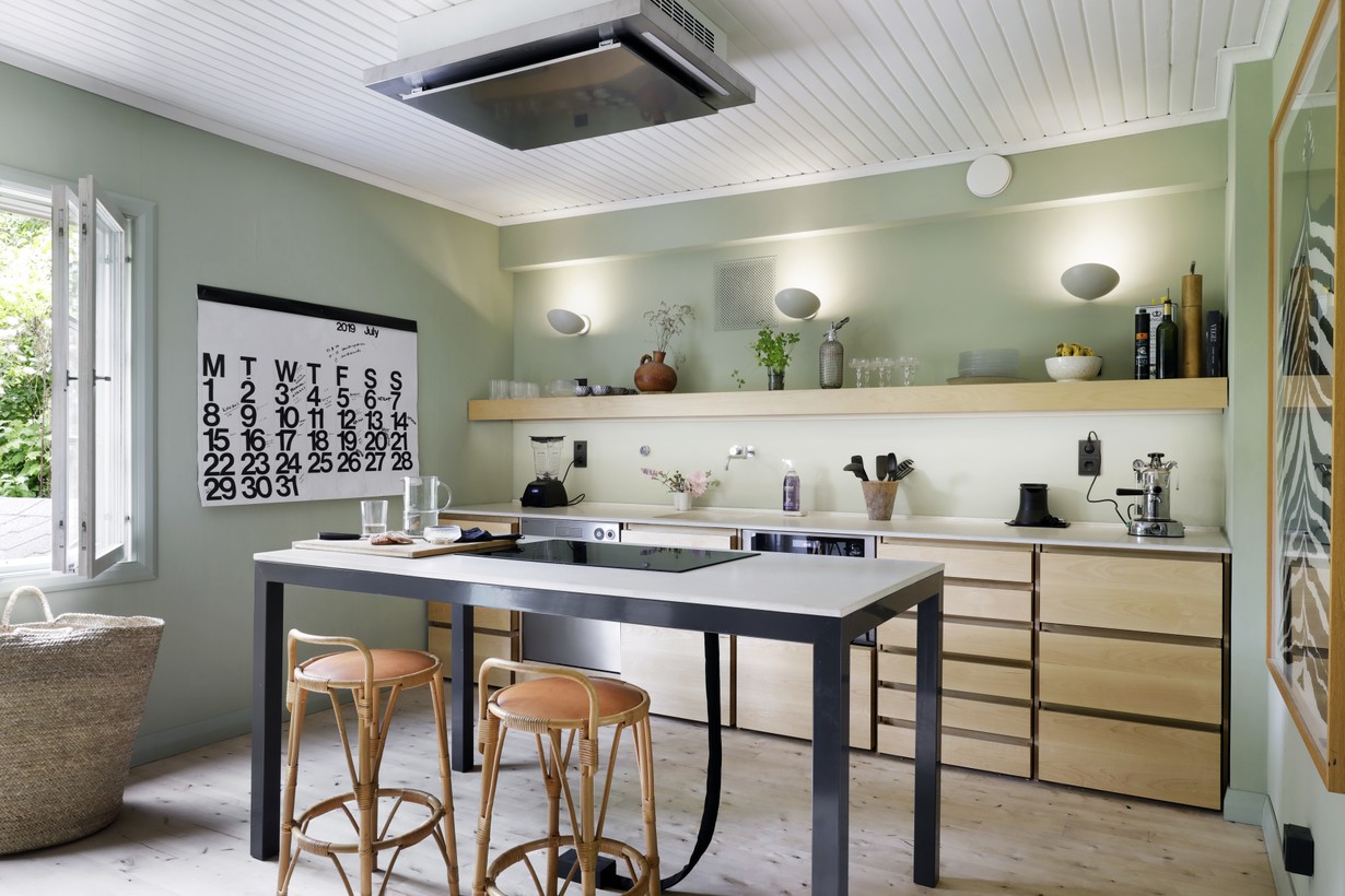 Purkutöissä paljastui talon alkuperäistä värimaailmaa, josta otimme ideoita. Asuimme aiemmin Tanskassa ja siellä olimme ihastuneet Karen Blixenin kodin vihreään keittiöön, jonka hän oli värittänyt ajatuksenaan tuoda puutarha sisälle. Ajatus inspiroi meitä ja niinpä etsimme keittiöömme meille sopivan vihreän sävyn. Seinien värejä valitessamme testasimme niin montaa sävyvaihtoehtoa, että remontoijat nauroivat meille.