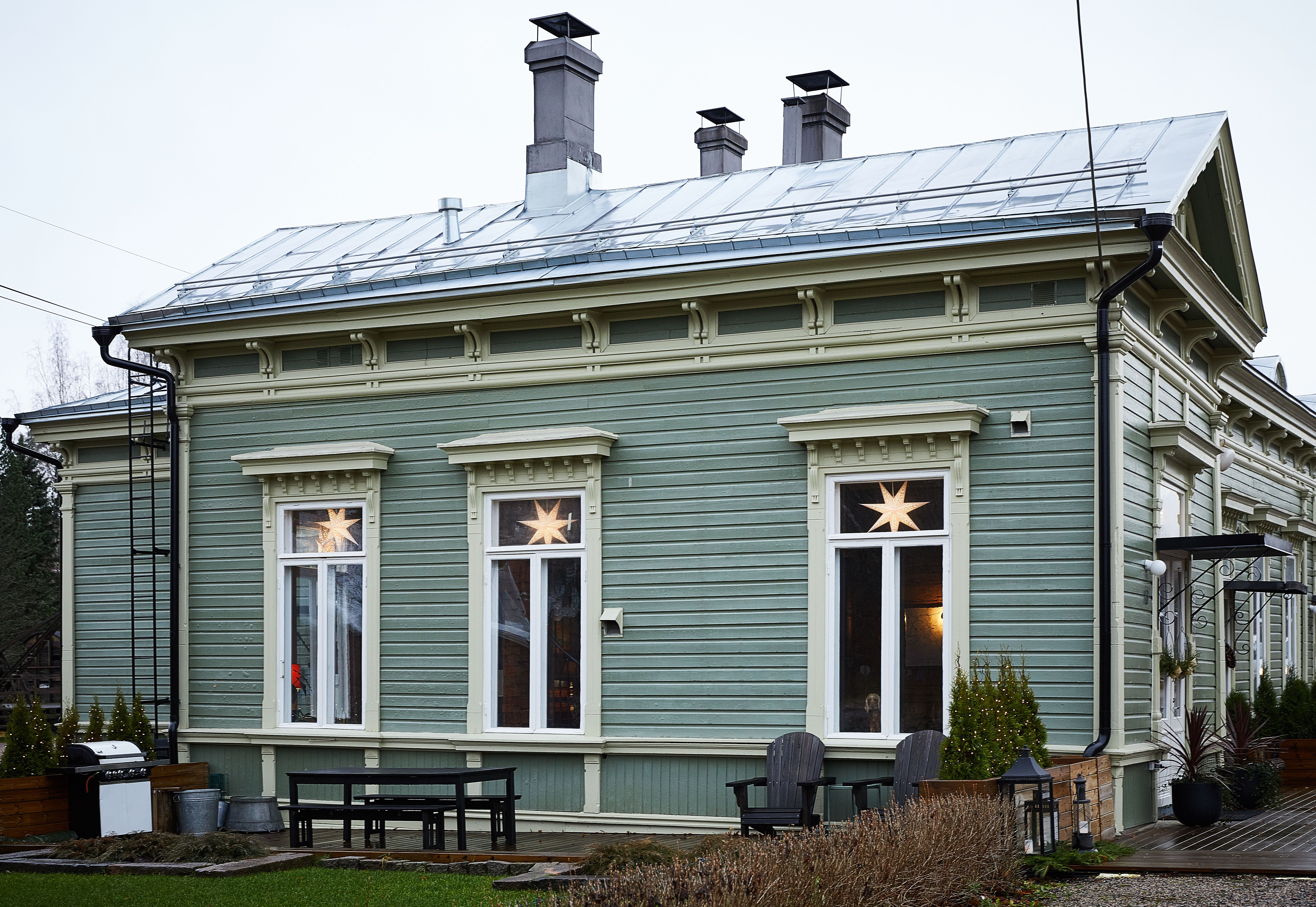 Kaikki tehtiin säilyttäen vanhaa niin paljon kuin mahdollista. Kaivoimme muun muassa skalpelli-veitsellä huolellisesti esiin alkuperäisen sävyn ulkoseinistä, että saimme ulkoverhouksen restauroitua alkuperäiseen asuunsa. Onneksi hirsirunko oli hyvässä kunnossa, jouduimme uusimaan vain nurkkahirsiä. Pystyimme myös säilyttämään alkuperäiset ulkoikkunat ja uuneja. Talon lattiat puolestaan jouduimme uusimaan kaikki. Ne olivat betonipinnalla, kun ostimme rakennuksen. Vanha betoni piikattiin pois ja asennutimme tilalle lisäeristyksen ja talotekniikan. Lopuksi paikoilleen asennettiin uudet lautalattiat. Remontin valmistuminen oli minulle unelmien täyttymys. Rakastan vanhan talon sielua, ja se näkyy ja tuntuu kotimme tunnelmassa.