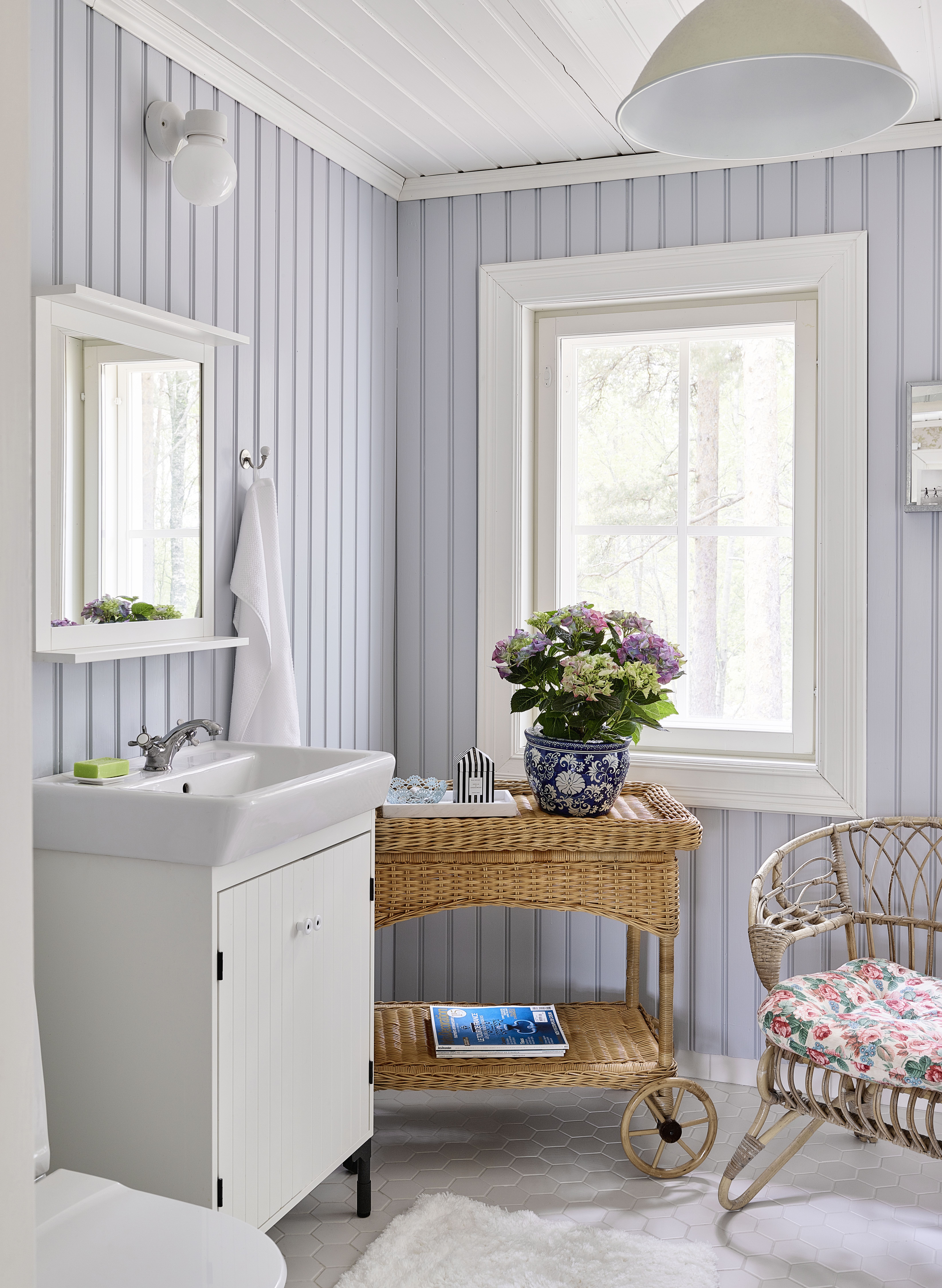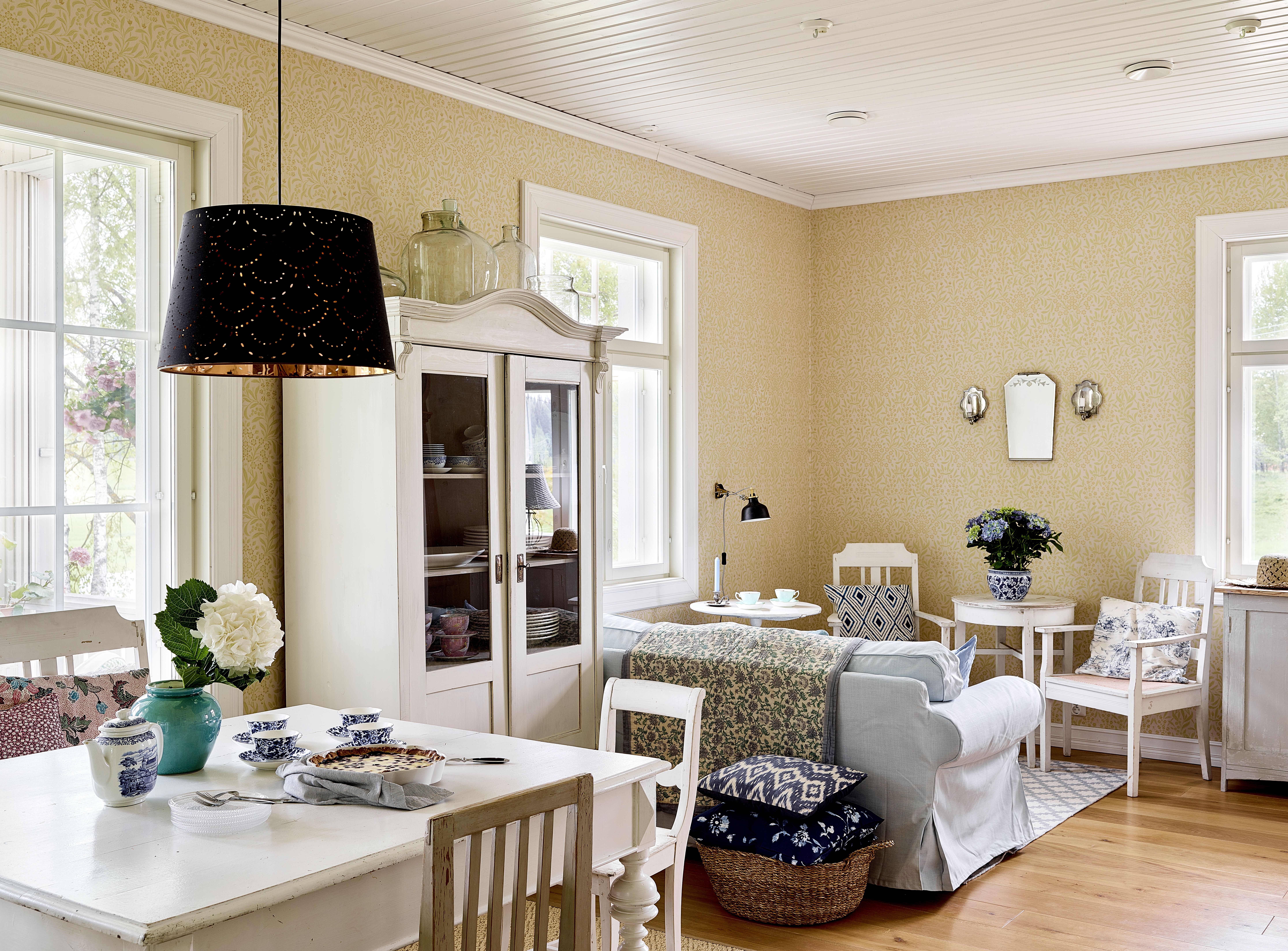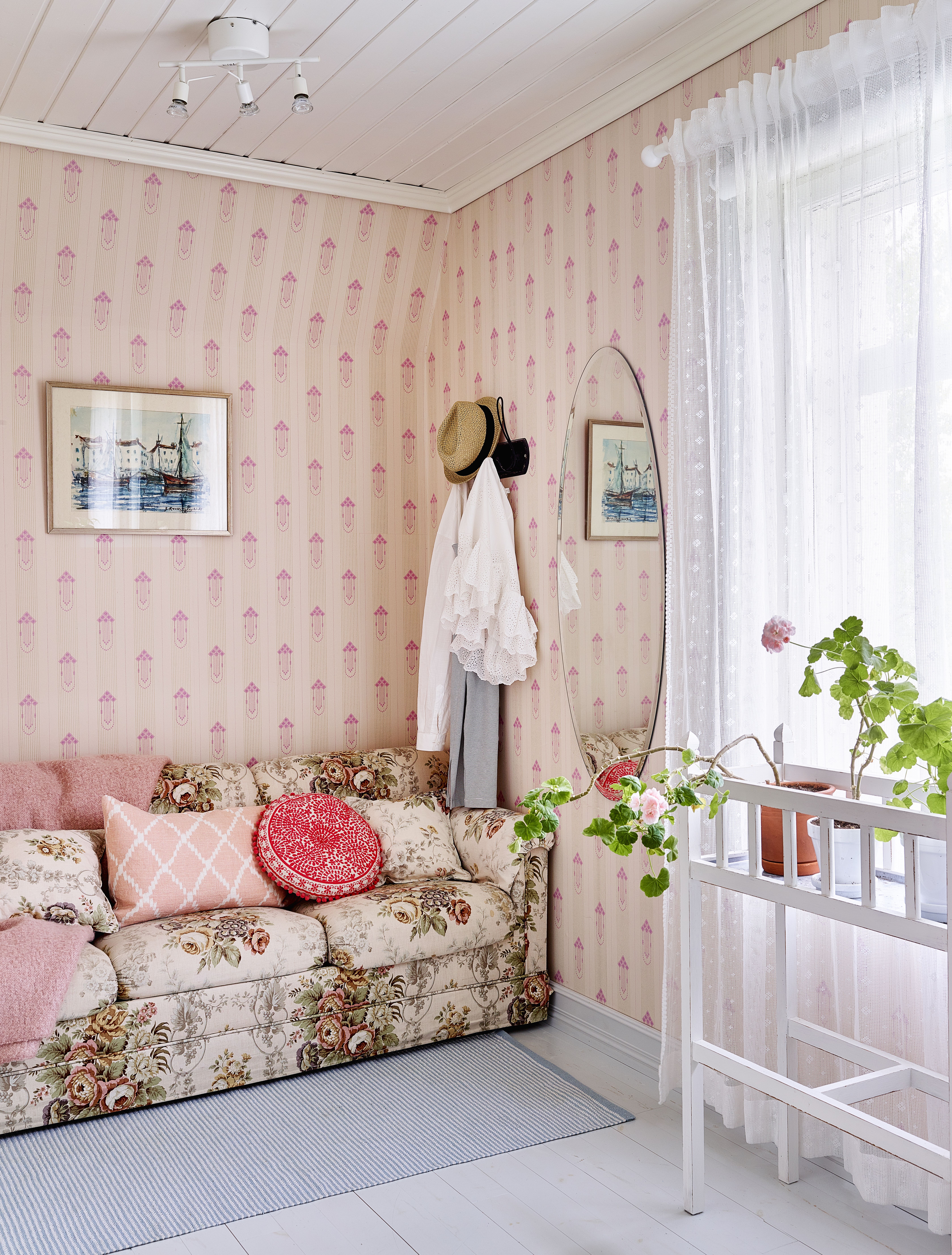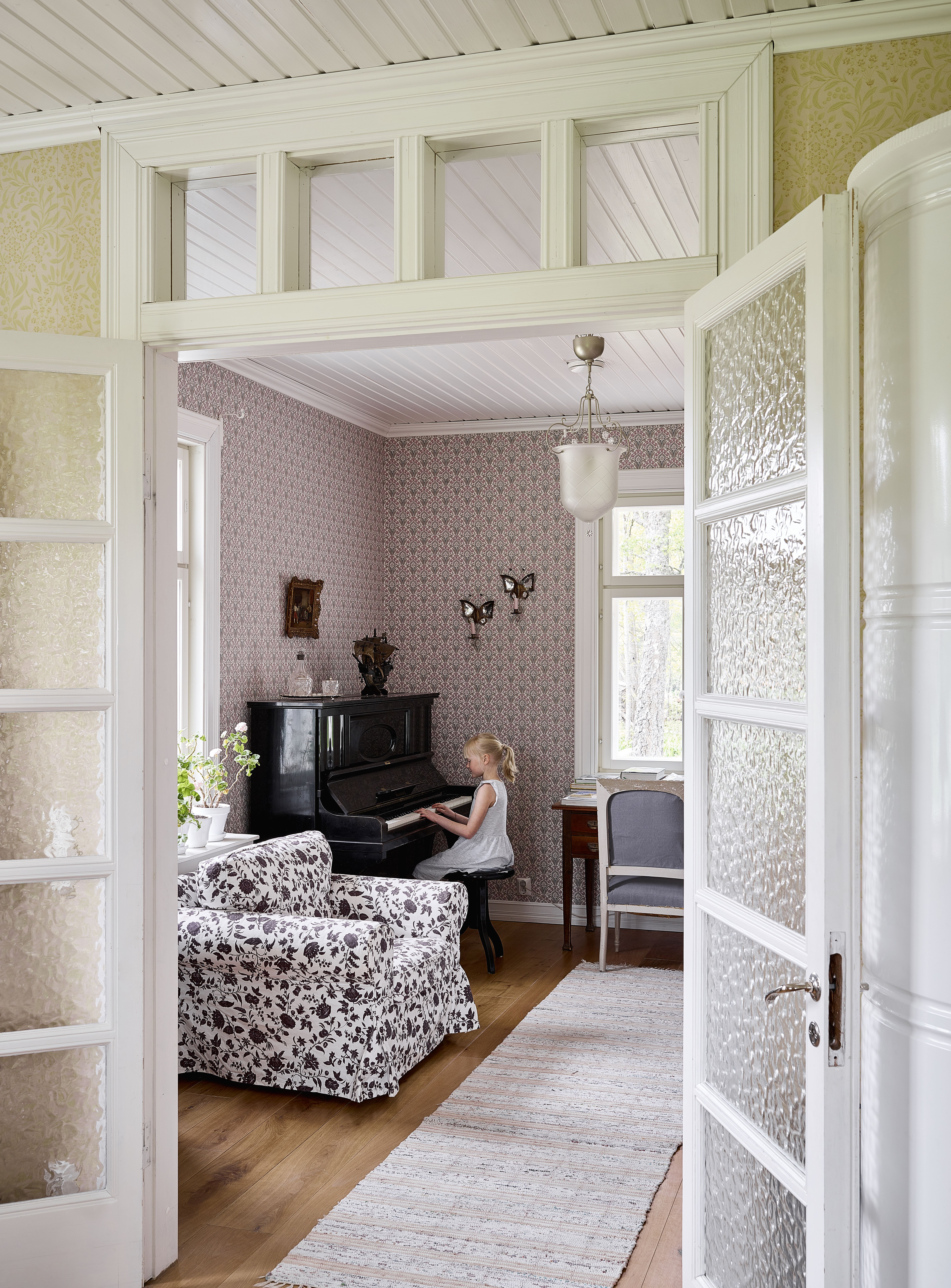 Jo ennen suurta tapettibuumia Helka tiesi, että hän halusi kotinsa seinille tapetit. Huvilan seiniä koristavatkin herkät pikkukukat, näyttävät ruusut ja hyasintit sekä raikkaat apilat. Myös puulattiat olivat itsestäänselvyys. Alakerrassa puupinta näkyy, mutta yläkerrassa lattiat on maalattu helmenharmaiksi, kuten vanhoissa taloissa.