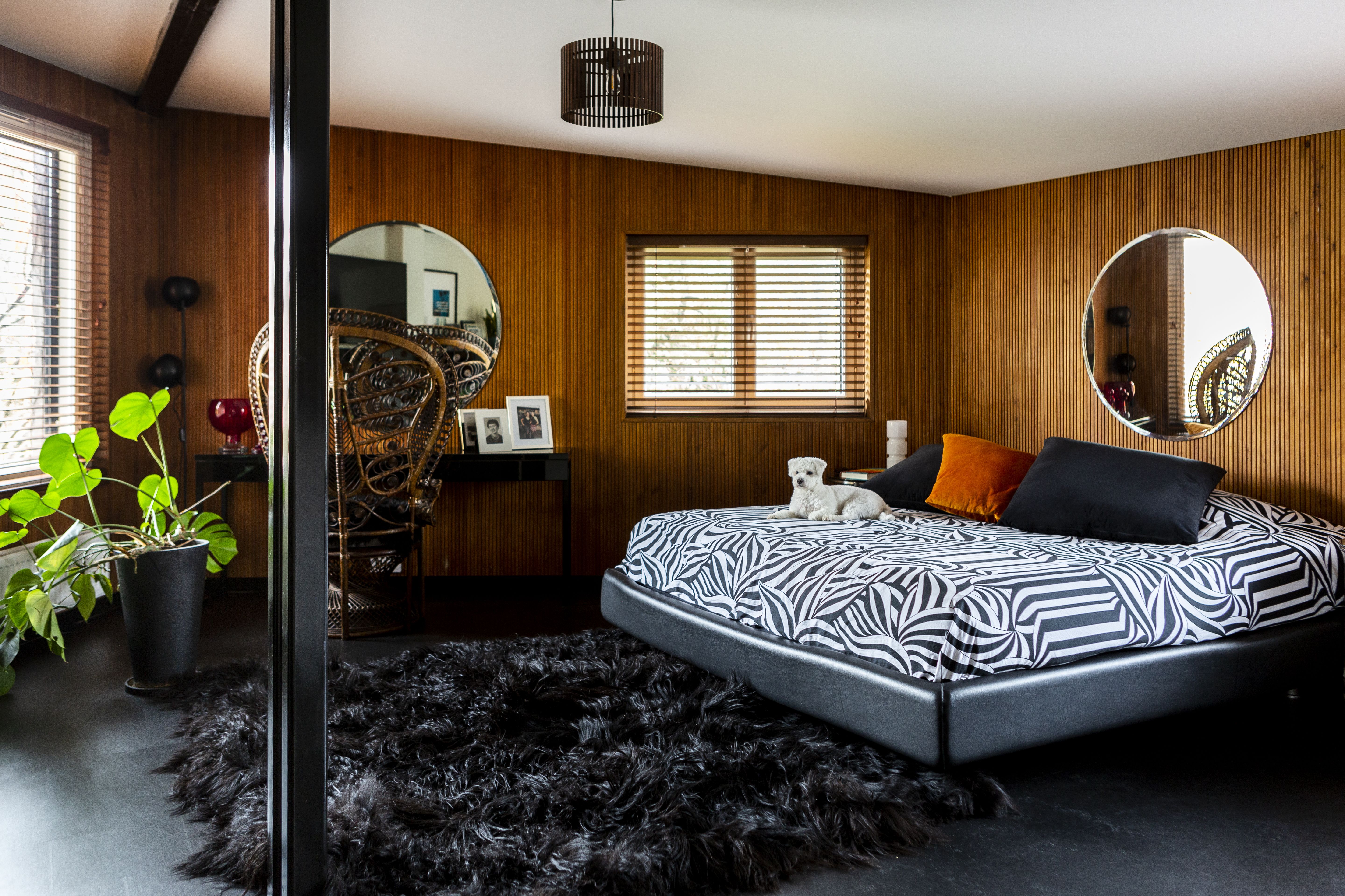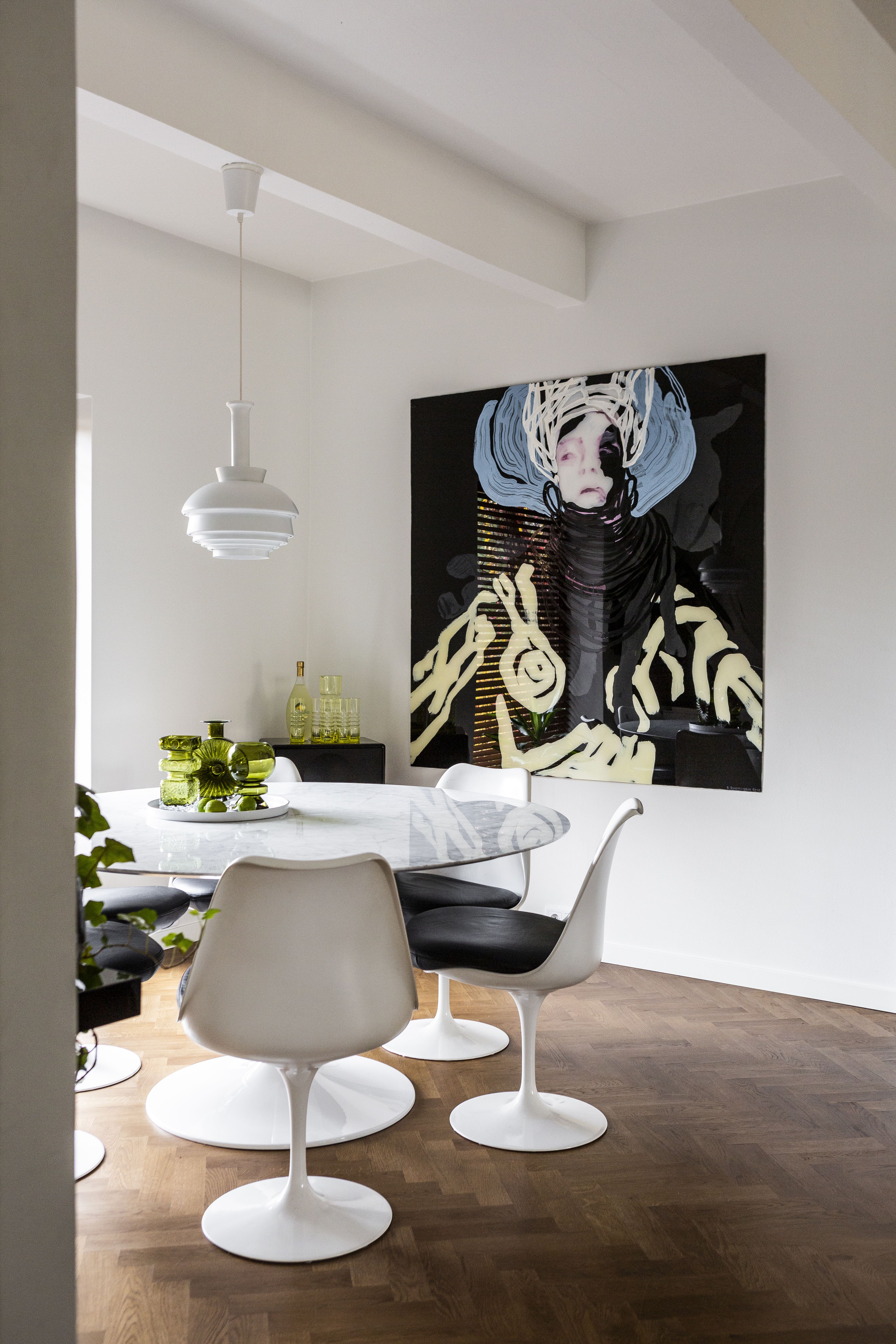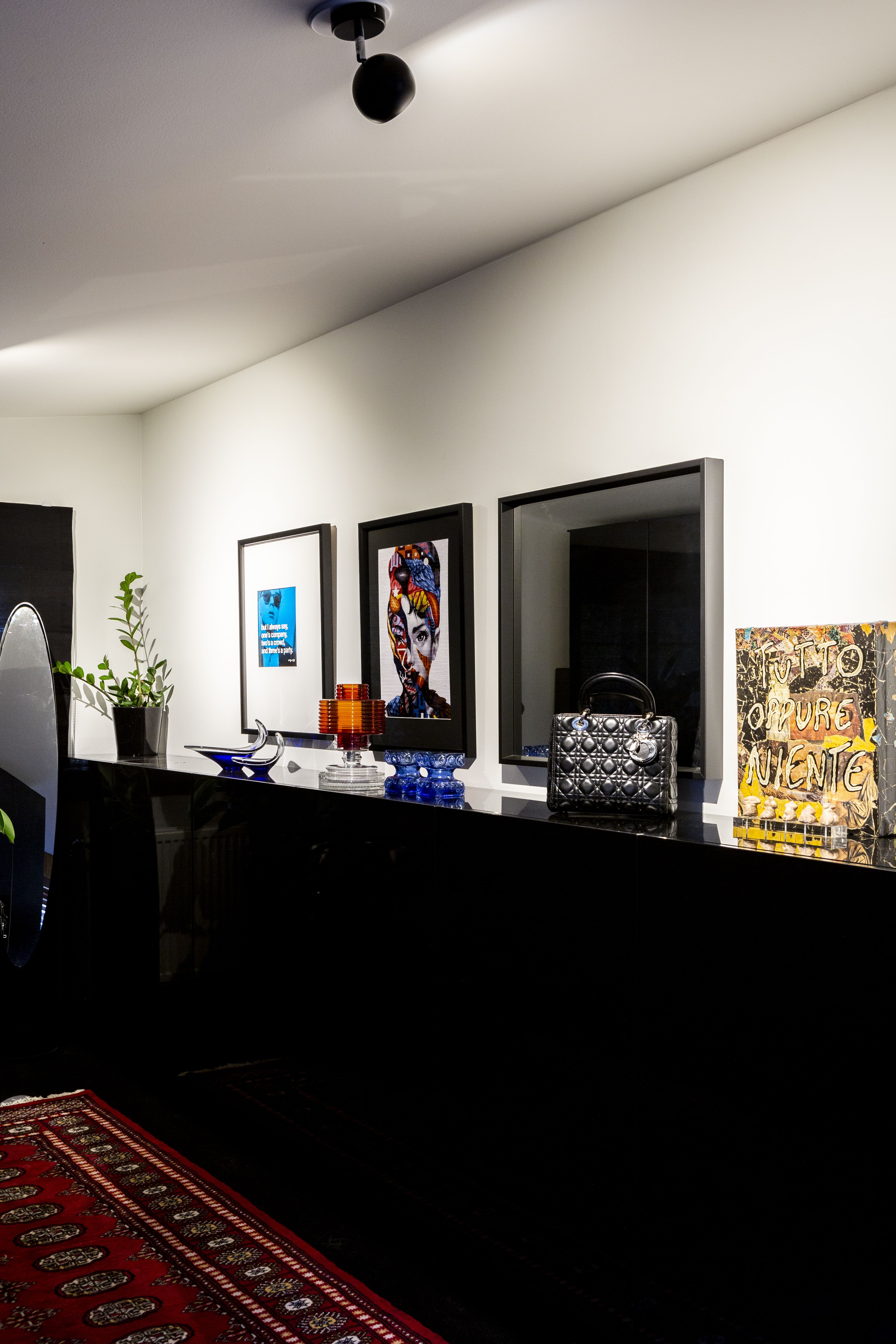 Särmikkään mustavalkoinen koti saa väripilkkunsa taiteesta ja designlasista