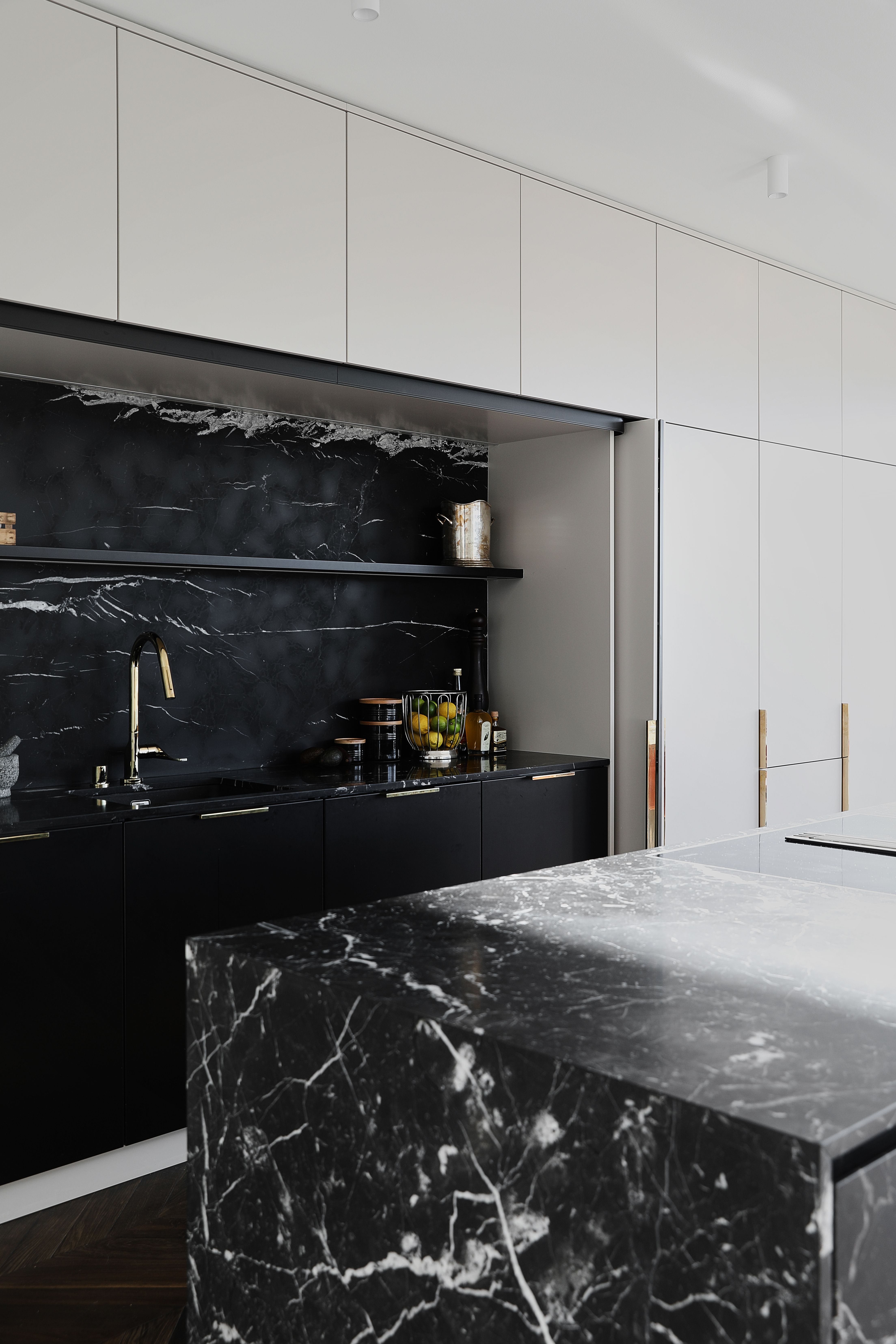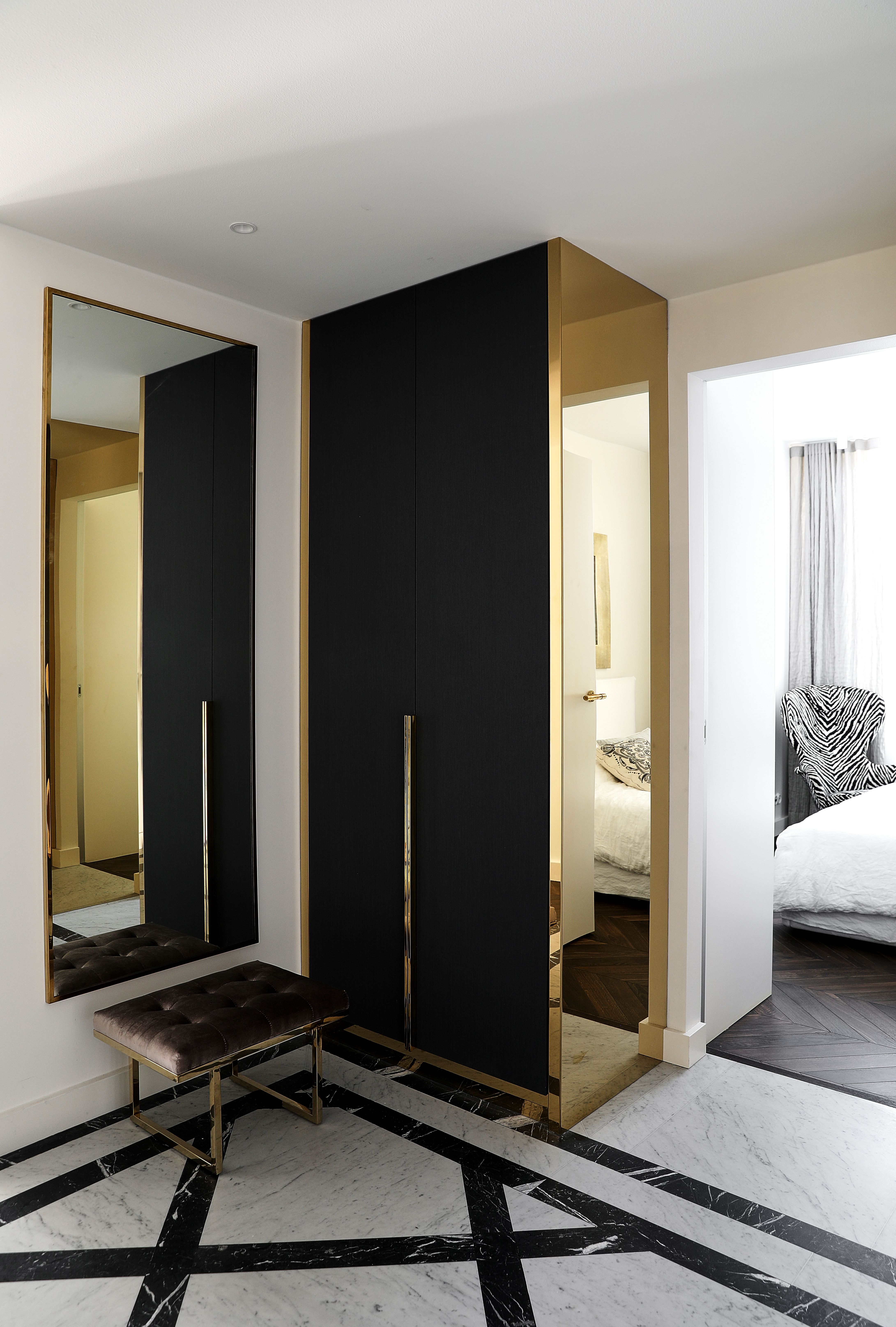 Kodin erikoisuuksiin kuuluu sisäänkäynti hissillä suoraan eteiseen. Kaapistot ja kaksivärisen marmorilattian suunnitteli JOARC Architects.