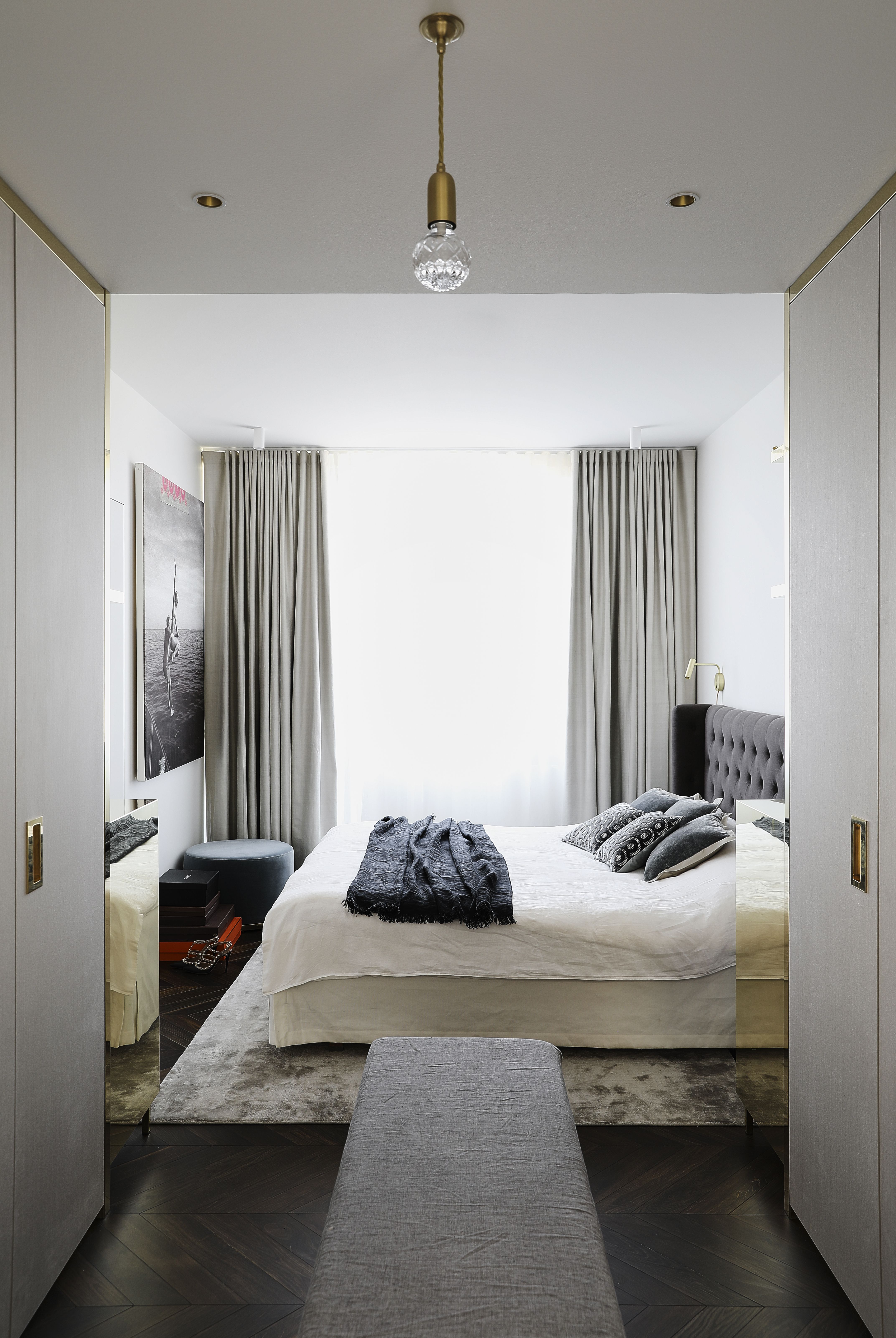 Asuntoon haluttiin vain kaksi makuuhuonetta, sillä lapset asuvat kotona enää satunnaisesti. Verhot teetettiin Vallila Interiorilla. Rahi ja valaisimet Zarro.