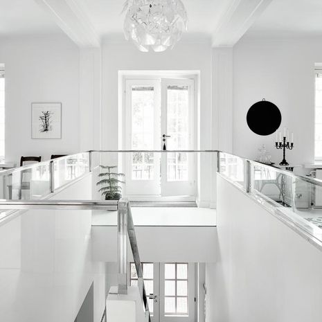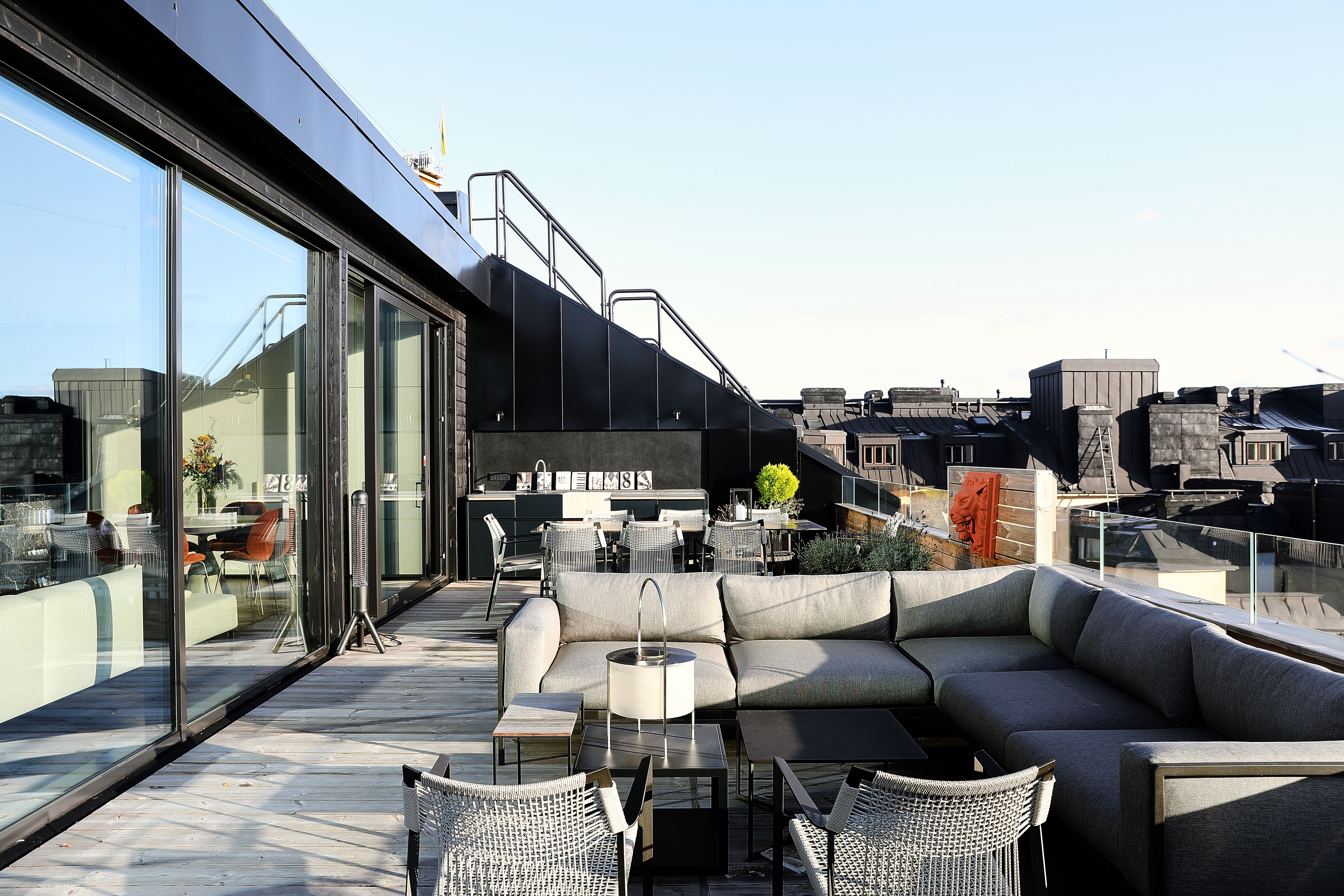 Grand Residencen asunnot ovat pääosin tuohon historialliseen, 1889 valmistuneeseen rakennukseen saneerattuja, ja tämä uudempi puoli on historiallisen pihasiiven tilalle aikoinaan rakennetussa osassa. Viidennen kerroksen ylle rakennettuun lisäkerrokseen suunniteltiin penthouse-asunto, jota ympäröi sataneliöinen kattoterassi. Tiesin, että asunto on ainut laatuaan, joten päädyimme ostamaan sen itsellemme. Terassi on ainoa tässä kokoluokassa, talossa on tämän lisäksi muutama pienempi kattoterassi. Asunnossa on hauskoja yksityiskohtia: ala-aulasta kuljetaan hissillä suoraan kodin eteiseen ja terassilta nousevat tikkaat vielä ylemmäs talon katolle, jonne pääsee ihailemaan näkymää yli Helsingin kattojen. Kodin moderni muotokieli jatkaa aiempien kotiemme tyyliä.