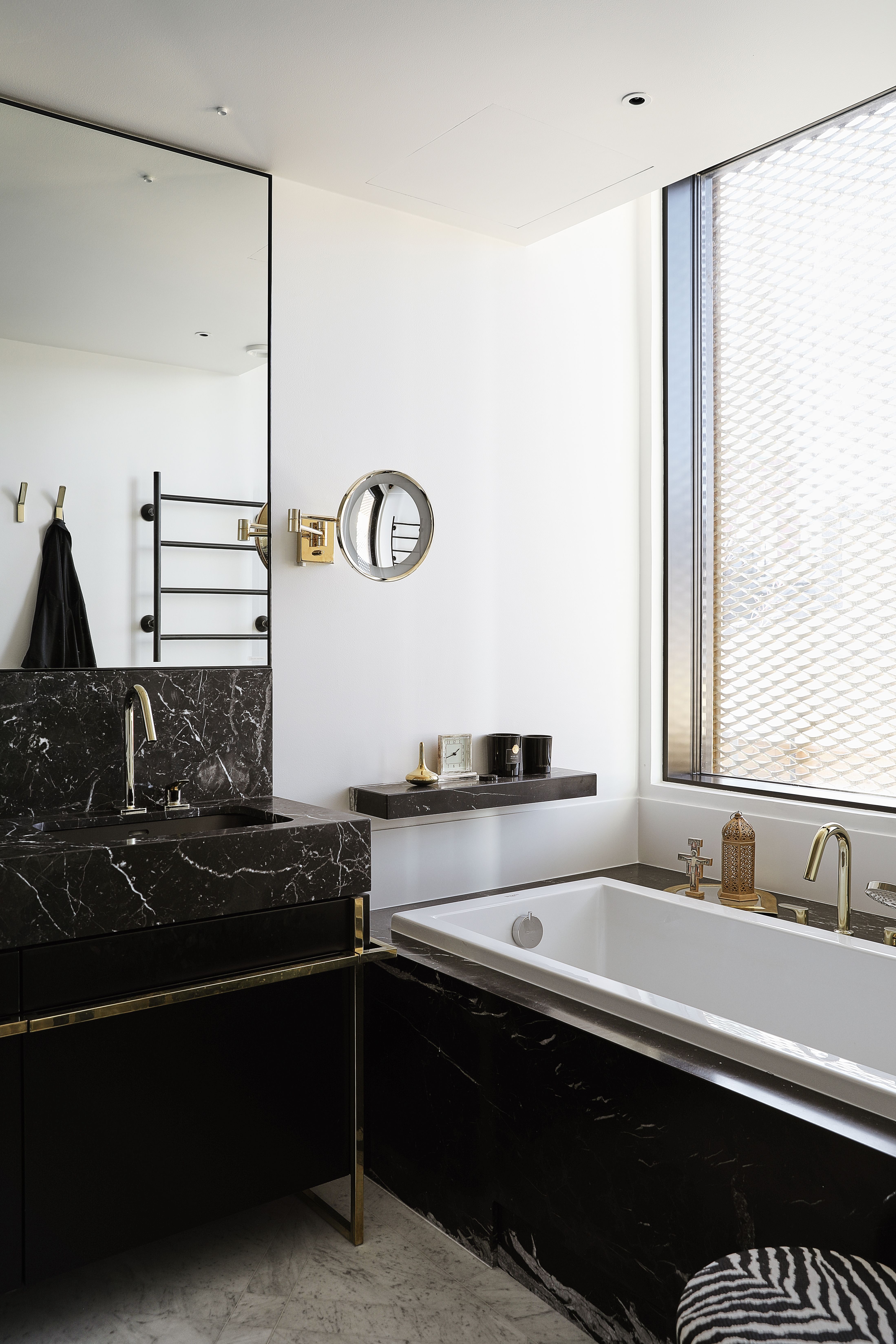 Makuuhuoneen yhteydessä on upea kylpyhuone, jonka marmoriset kalusteet suunnitteli JOARC Architects ja valmisti Ergo-Kalusteet. Kylpyamme Duravit, hanat Axor Citterio. Meikkipeili on Zarrosta.