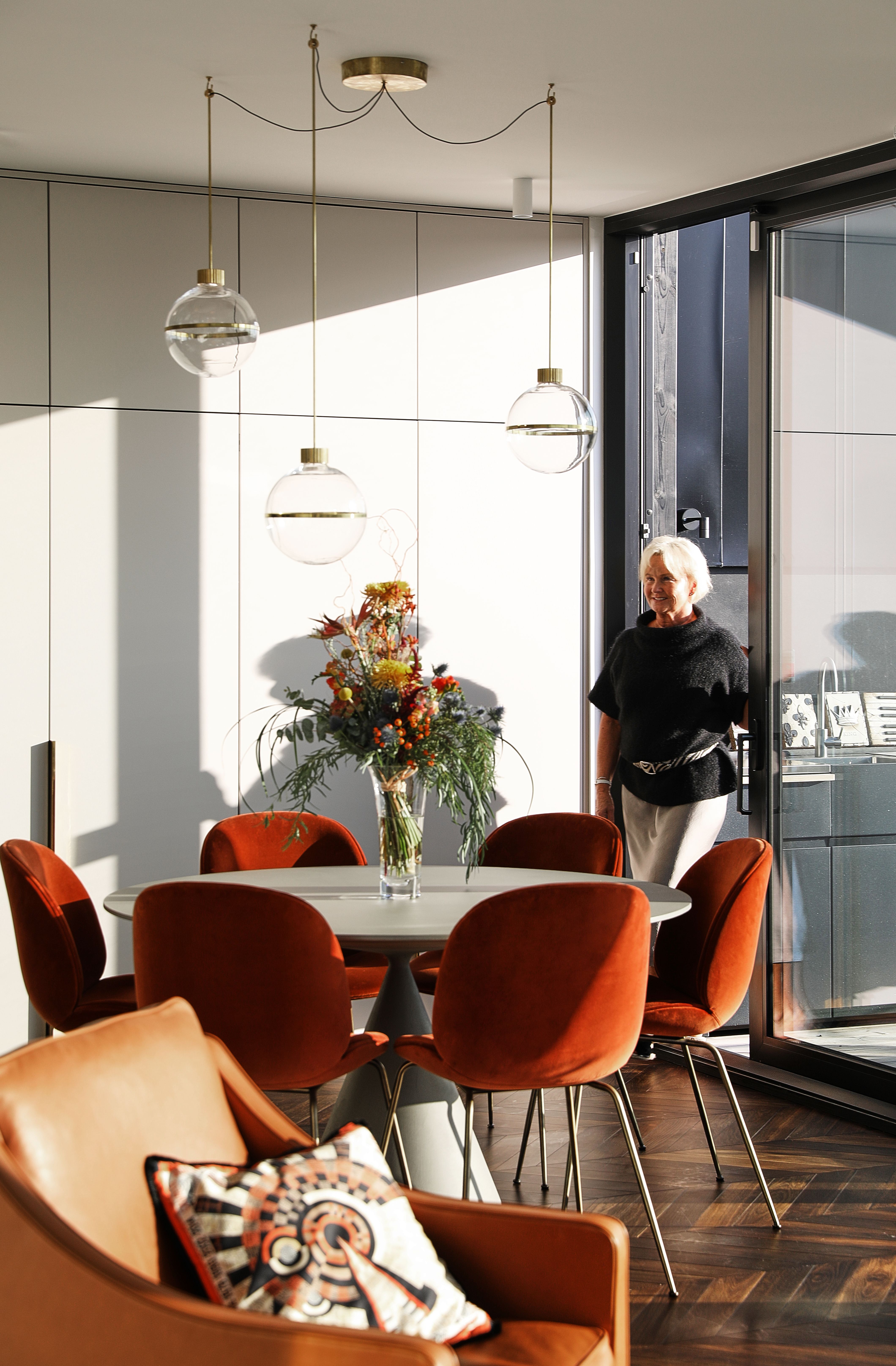 Kati halusi ruokapöydän ylle uniikit valaisimet, joiden suunnnittelusta vastasivat Joanna Maury ja Håkan Långstedt. Kukat sitoi Katin luottokukkakauppa Form&Flora. Gubin tuolit ovat Nomartista ja pöytä Desalton Clay, Vallila Interior.
