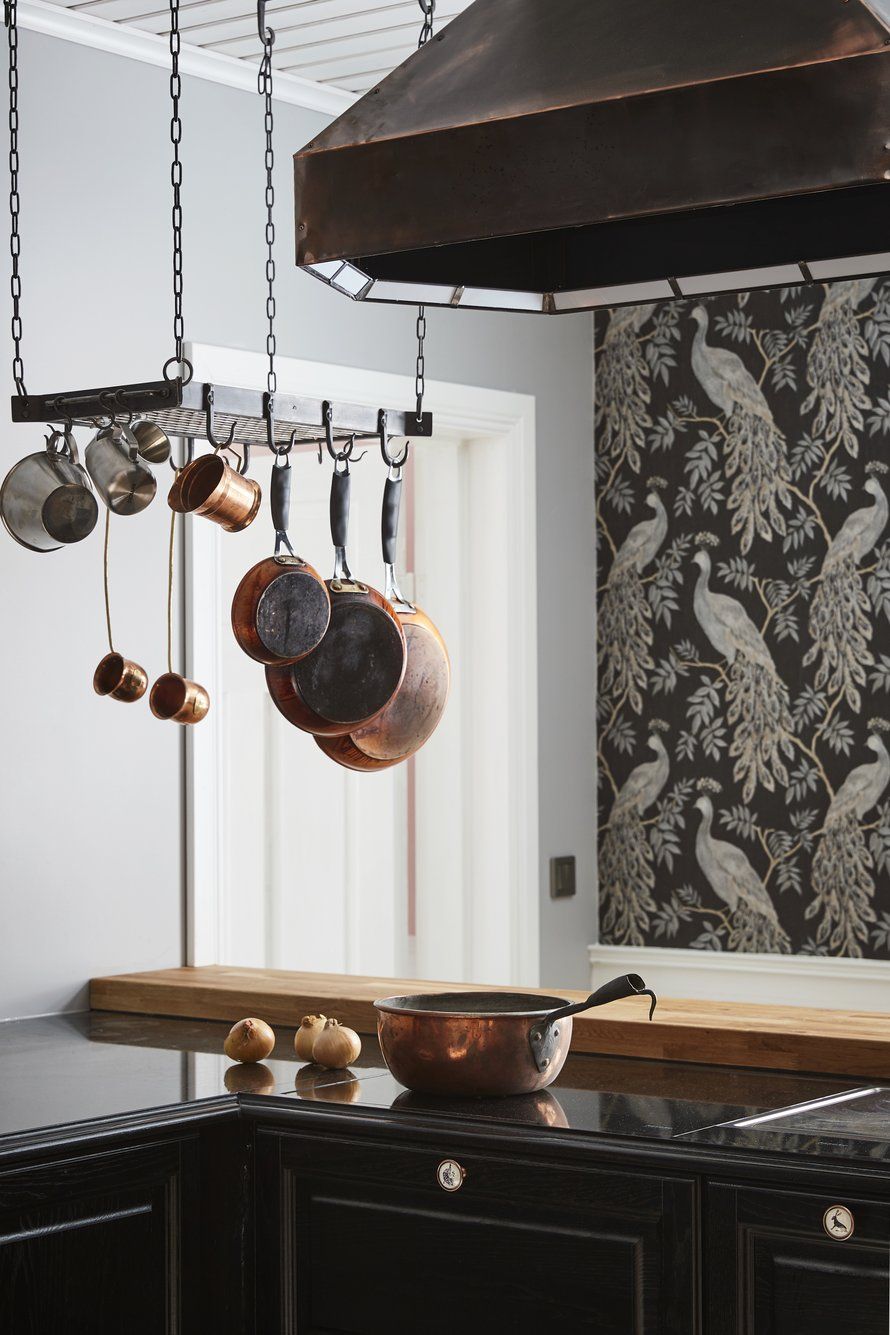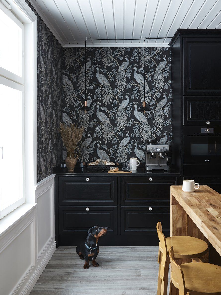 Satavuotiaan hirsitalon keittiössä mennyt aika ja huippumodernit laitteet kohtaavat. Välkehtivä lintutapetti ylevöittää arjen.