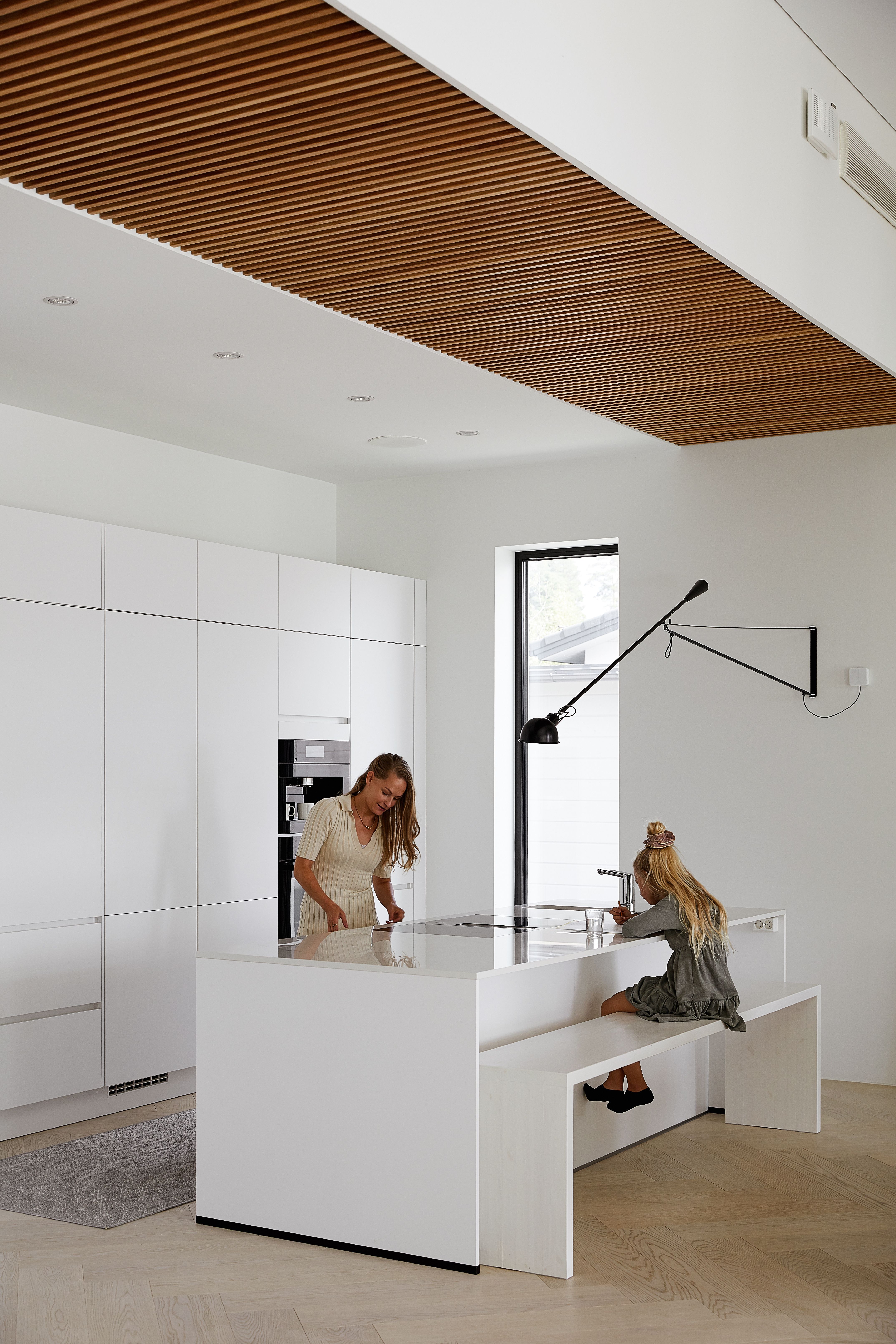 Keittiöstä halusimme mahdollisimman selkeän, ja kaikki integroitiin valkoisten ovien taakse. Saarekkeen ääressä olevan penkin Henry teki toiveideni mukaan itse. Suunnittelin keittiöön myös pienen mustan rimaseinän antamaan näkösuojaa, ja se on seuraavana toteutettavien projektien listalla.