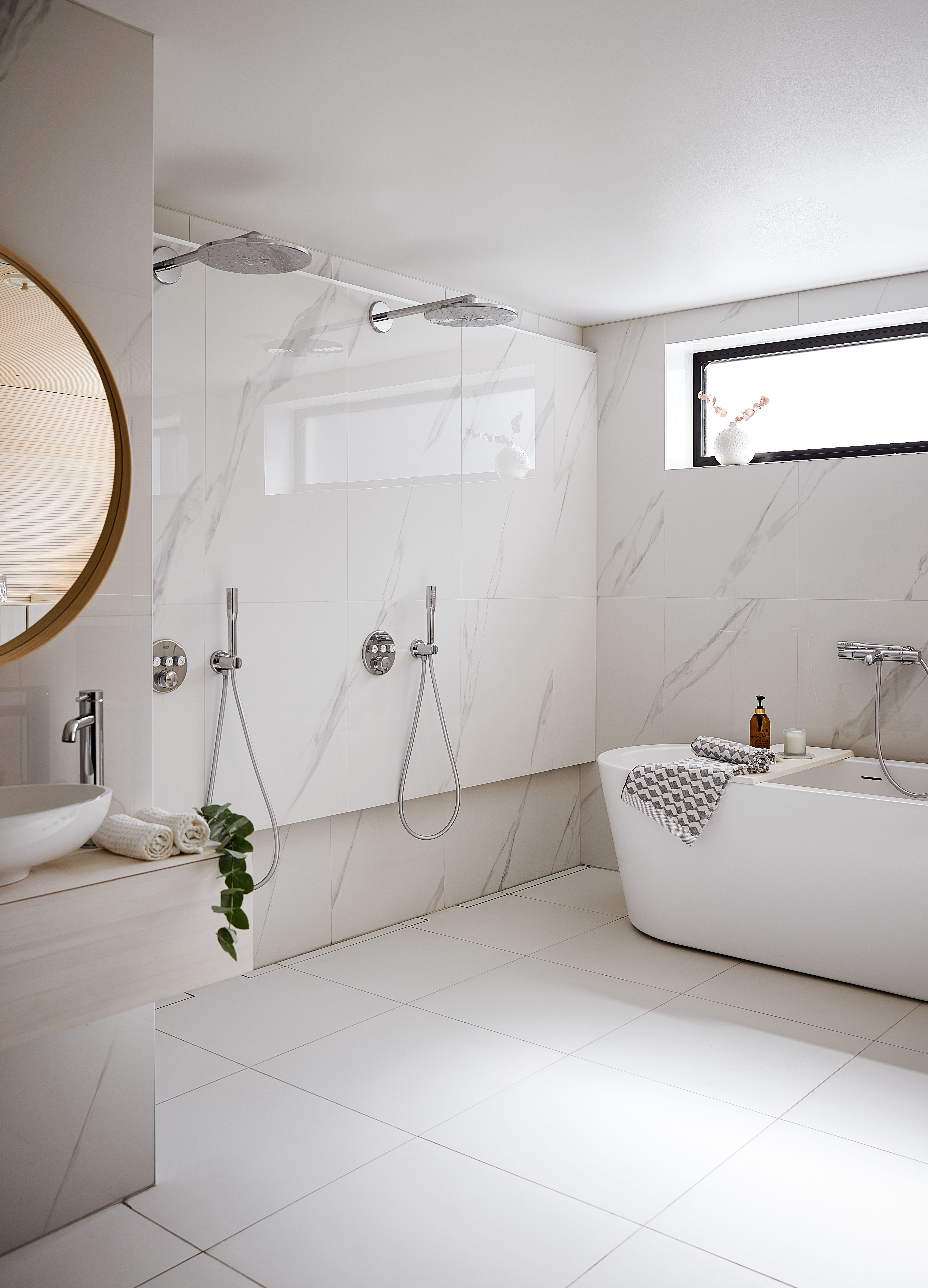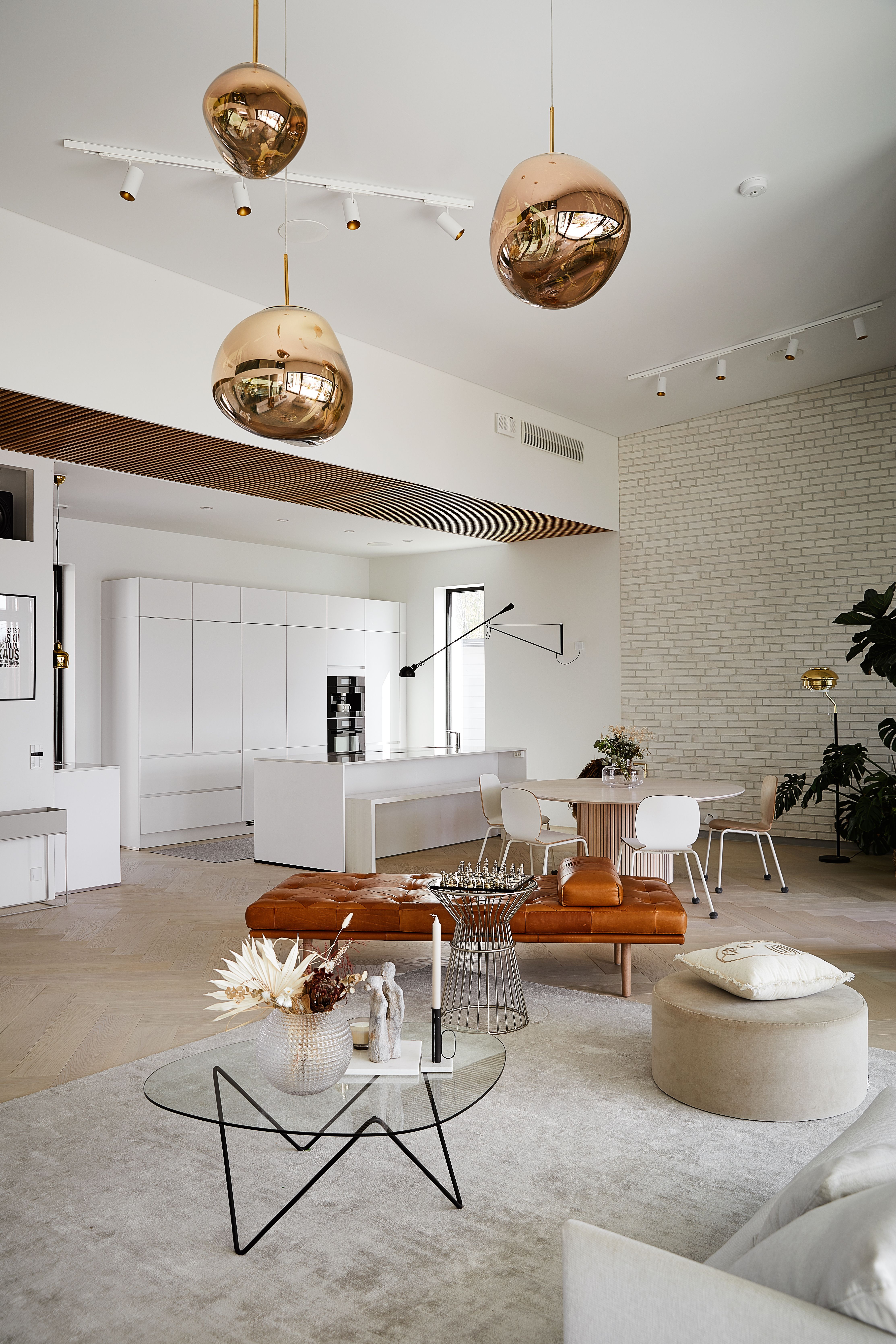 Halusin kotiimme persoonallisia yksityiskohtia ja siinä onnistuimme. Sisustus on minulle osa persoonaani, ja tykkään ajatella pinnallisetkin asiat syvällisemmin. Esimerkiksi oleskelutiloissa on korkea tiiliseinä, johon lisäsimme entisestään rosoisuutta paiskimalla tiiliä betoniin. Ajattelen, että rosoisuus tekee tiilistä ainutlaatuisia, aivan kuten ihmisistäkin. Tammirimakatto led-valoineen rikkoo sopivasti muuten niin särmää ja vaaleaa kokonaisuutta.