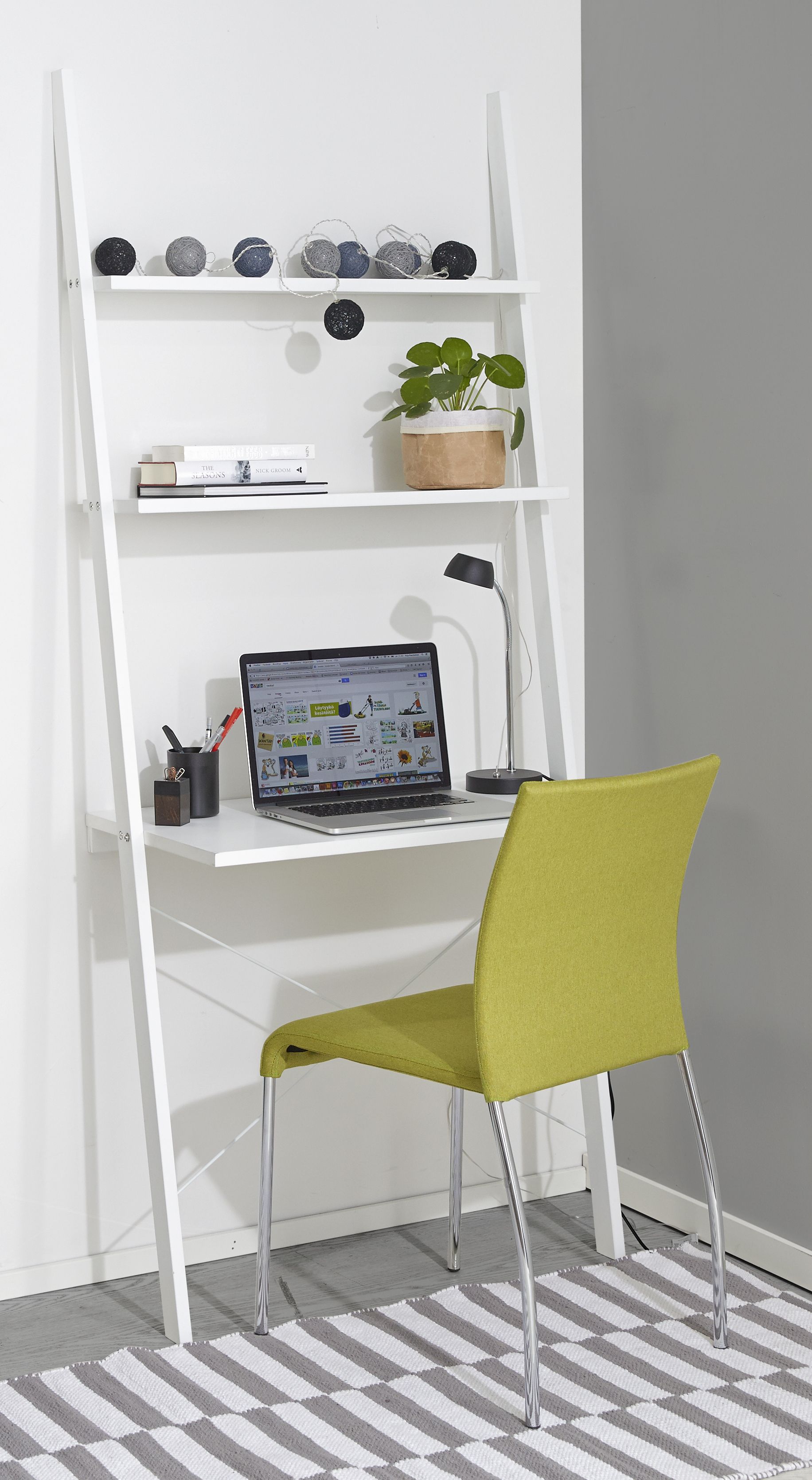 Työpöydäksi käy siro hyllykkö, jossa on työtaso. Min-läppärihyllykkö 69,90 e, Hobby hall.
