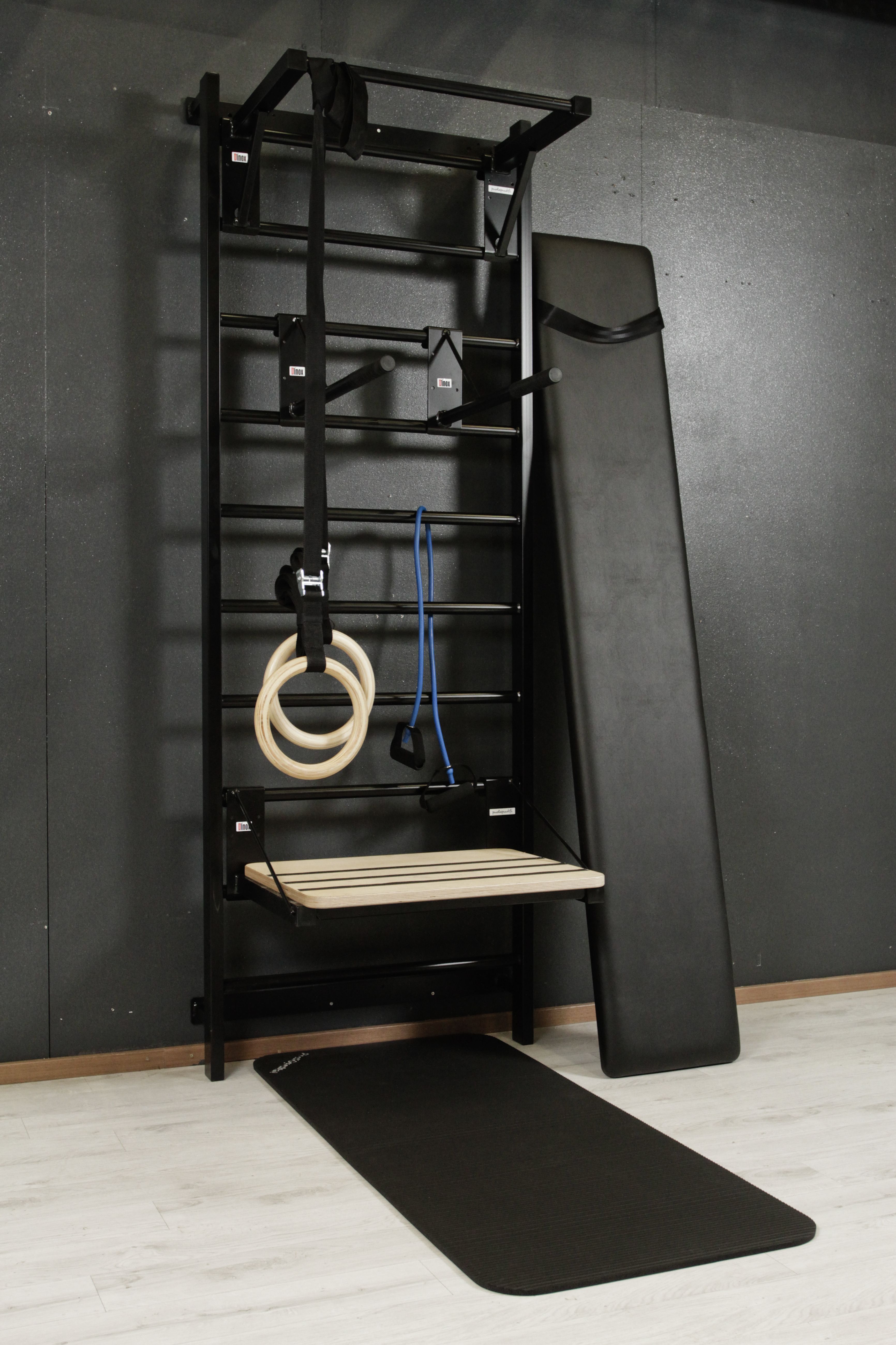 Puolapuut seinään ja jumpparenkaat kattoon. Leuanvetotanko ovenkarmeissa. Tilaa ei paljoa tarvita, sillä tanssipaikan voi tehdä isolla peilillä ja jumppamatolla. Balettikoulun tunnelman saat vielä lisäämällä porraskaiteen peilin eteen.