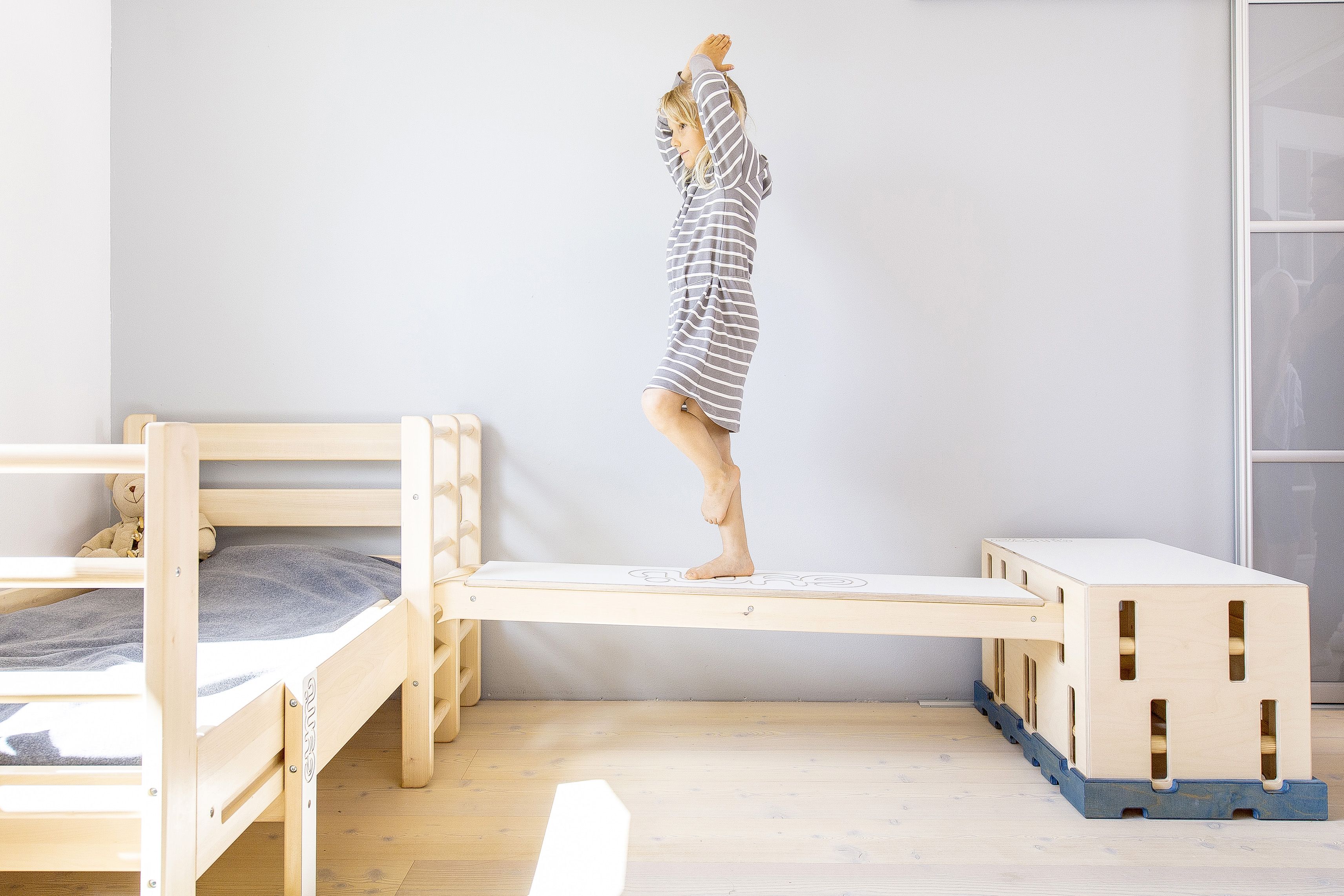 Moneksi muuntuvat lastenhuoneenkalusteet syntyivät lasten todellisesta tarpeesta päästä liikkumaan jumppasalien ulkopuolellakin. Christina Nurmen suunnittelema Gymi-kalustesarja on suomalaista käsityötä.