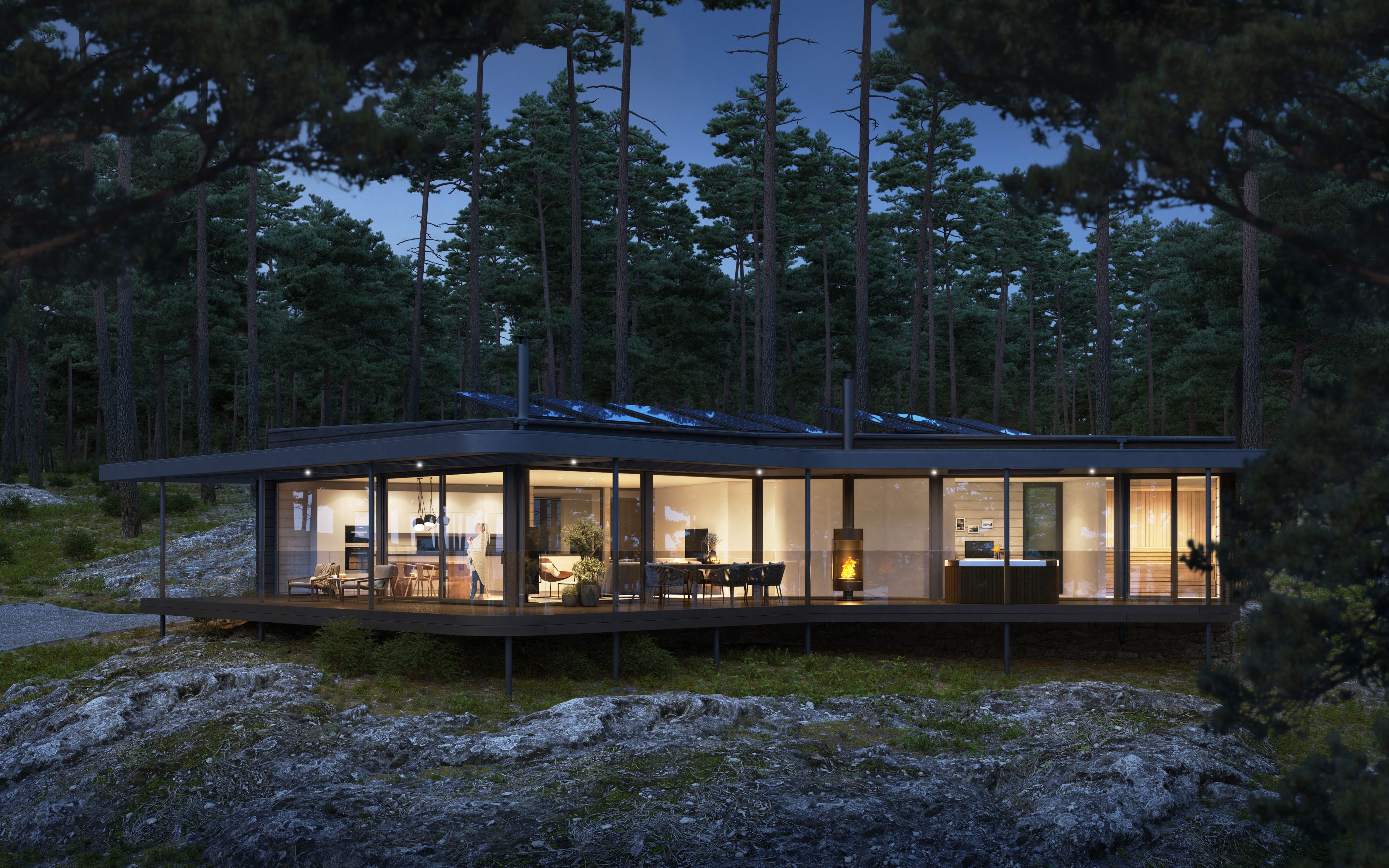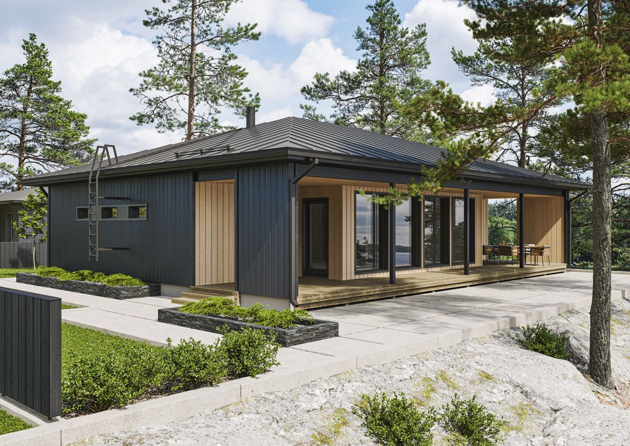 Myös Kannustalon Auma on saanut inspiraationsa talomalliin Japanista. Minimalistinen aumakatto ja lähes 50-neliöinen lasitettu ja avattava terassi tekevät ilmeestä modernin.