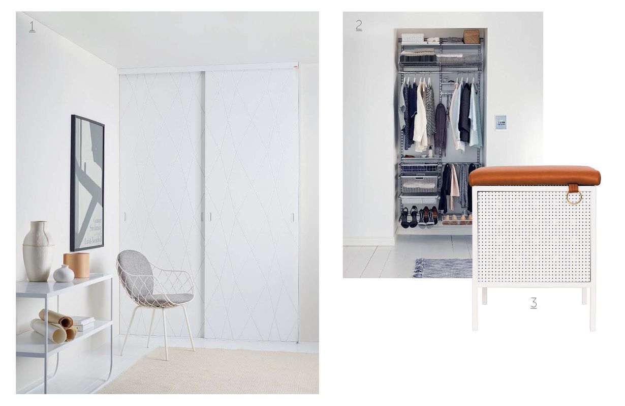 Eteisen säilytystä ei kannata rakentaa monien erillisten säilytyskalusteen varaan vaan tehdä yksi toimiva säilytysjärjestelmä ovien tai liukuovien taakse. Se kätkee sisäänsä irtotavaran.