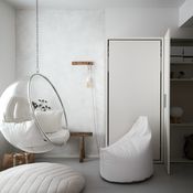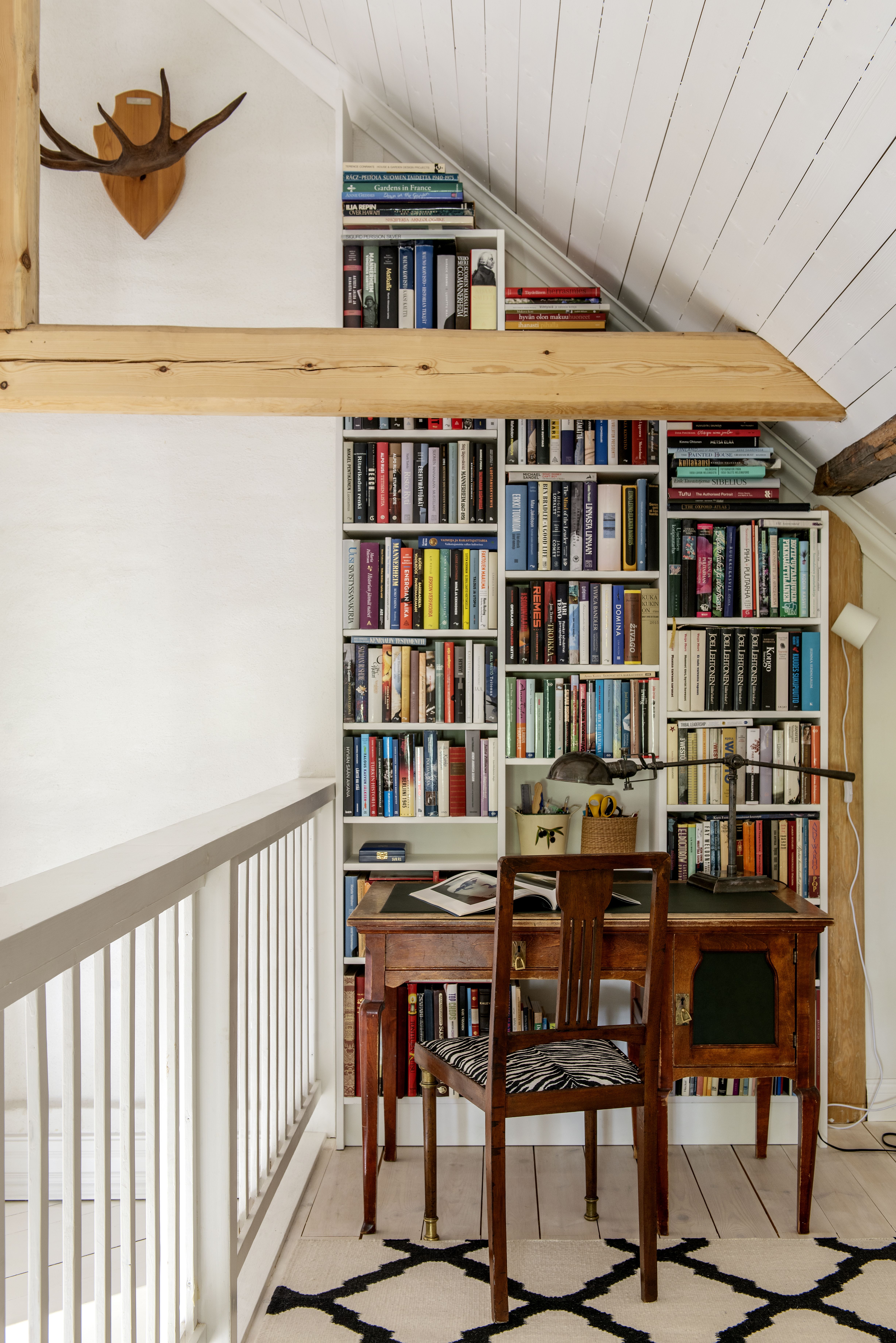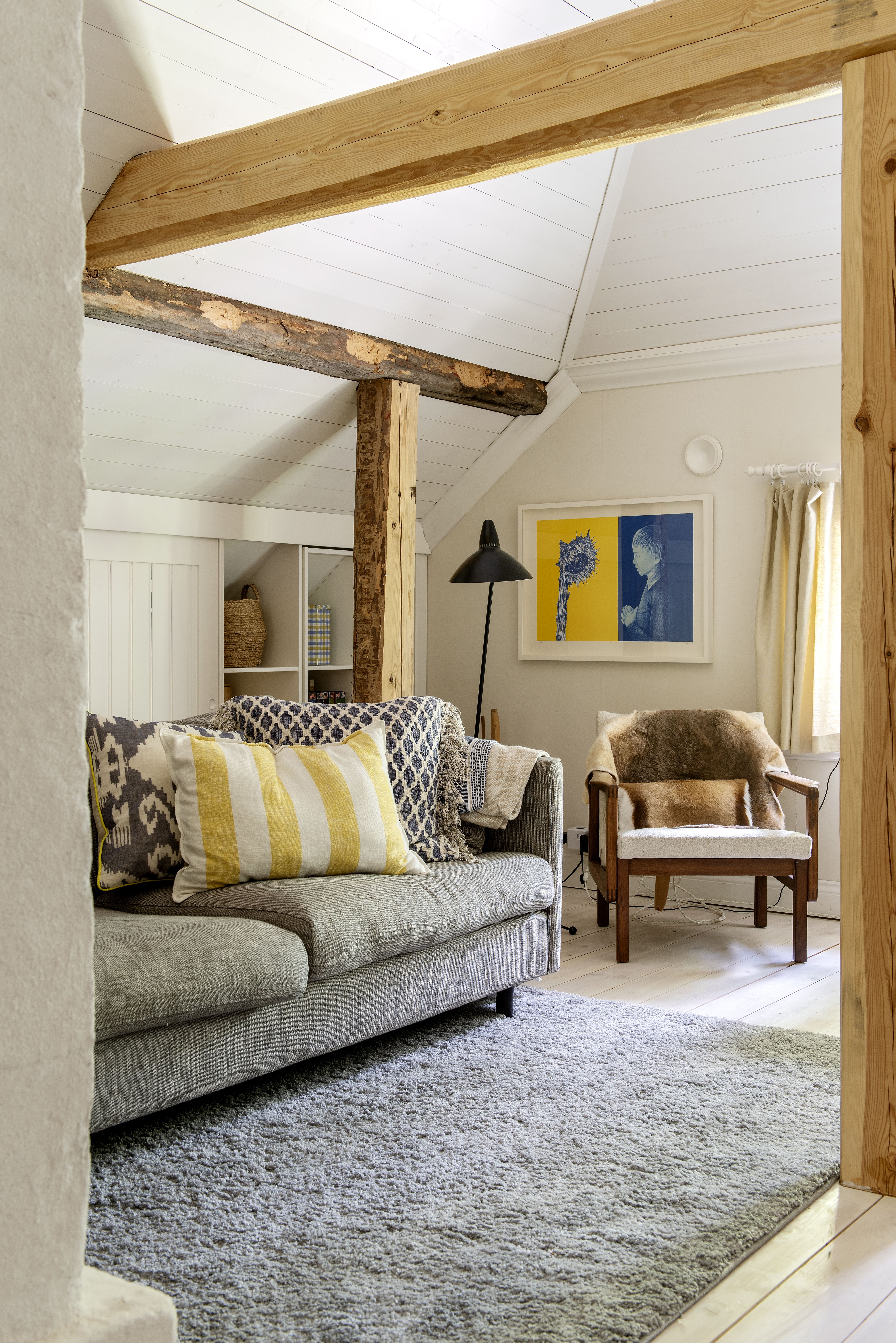 -Saimme yläkerralle enemmän käyttöä, kun tv-huone siirrettiin sinne. Kari ideoi yhdessä Saksassa asuvan tyttärensä kanssa vinon katon alle myös tilavat säilytystilat kirjahyllyineen. Ne toteutti taitava hausjärveläinen puuseppä. Vinon katon alle mahtuu nyt paljon säilytettävää, muun muassa lukuisat vierasvuodevaatteet, Marianne sanoo.