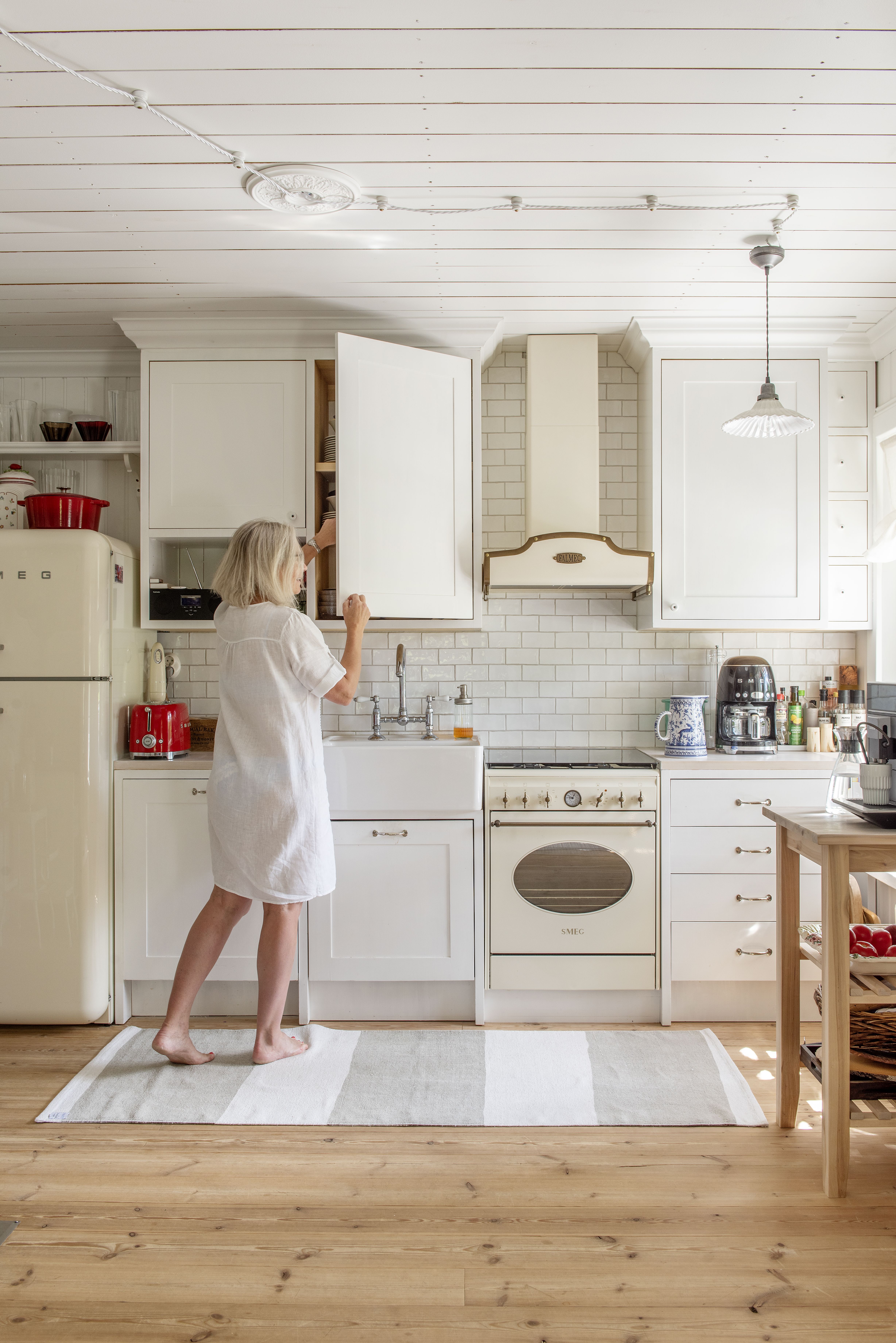 -Kalusteillamme on monta hauskaa tarinaa. Ruokasalin kattokruunu löytyi antiikkiliikkeestä Tallinnasta ja se matkasi purjeveneessä Suomeen. Portaikon kattokruunu taas on tuotu Amerikasta ollessani vielä teini-ikäinen. Olin mukana lentokapteeni-isäni työmatkalla ja löysimme valaisimen, jonka sain myöhemmin isältäni lahjaksi nykyiseen kotiin. Keittiön apujakkara on vaarini 1950-luvulla Washingtonista ostama ja Suomeen muuttokuormassa päätynyt, Marianne sanoo.