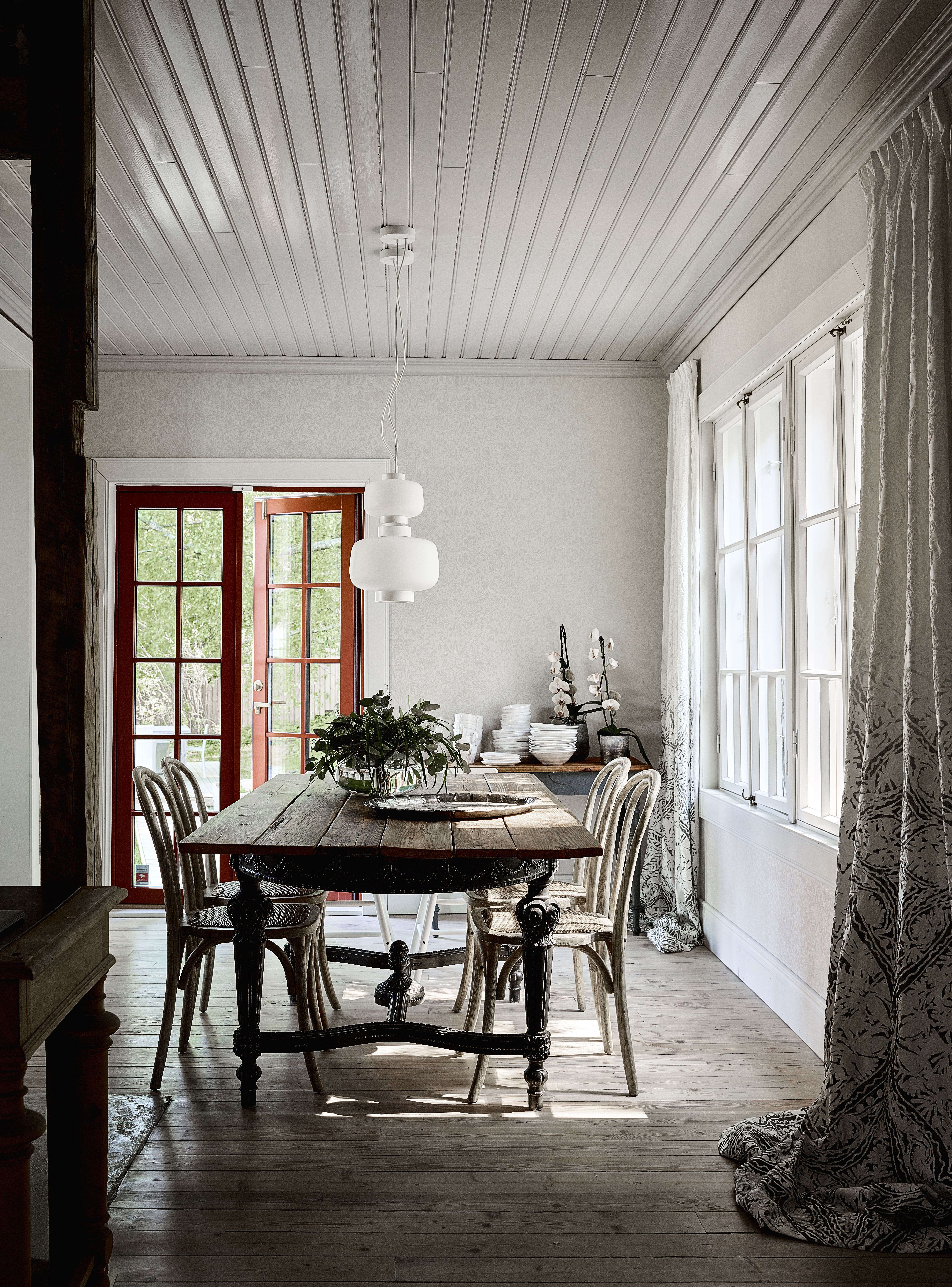 Ruokasalista on kulku pihalle. Punasävyiset pariovet antavat särmää muuten vaalealle tilalle. Upea pöytä on Nooran ideoima ja tuolit second hand -löytöjä.