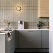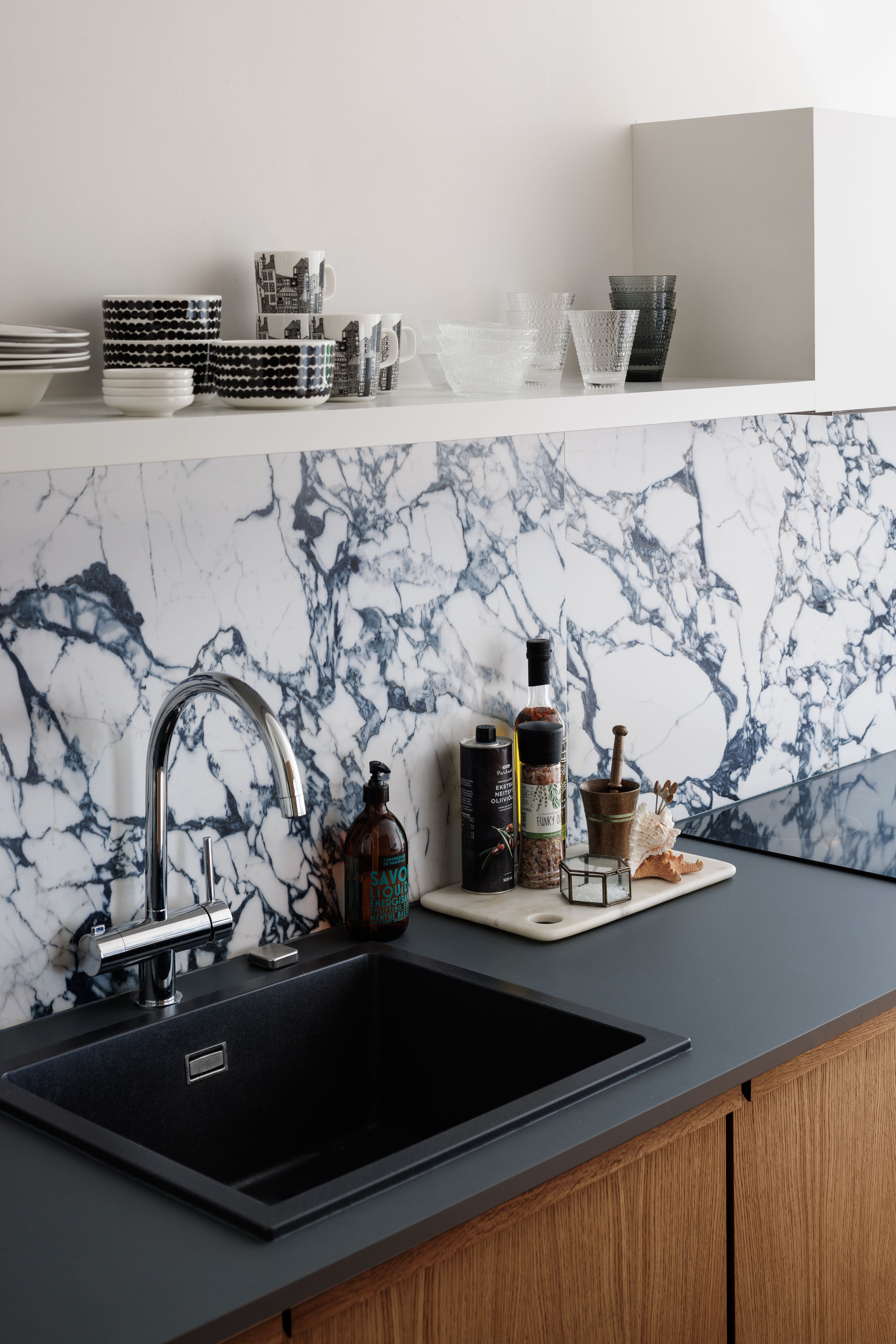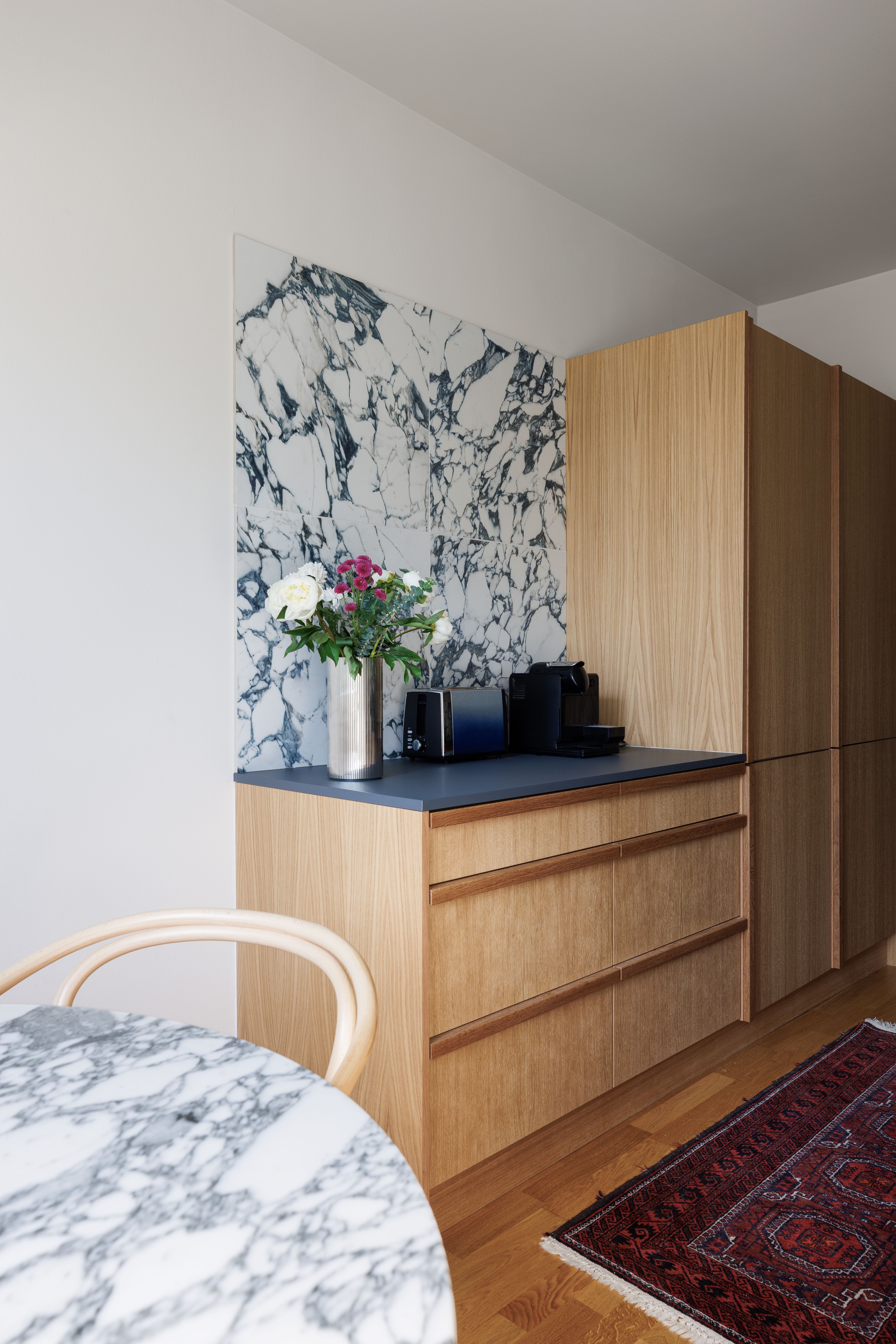60-luvun Calacatta Viola -marmoripöytä on lempihuonekaluni ja sain siitä idean seinien marmorikuosiseen laatoitukseen. Leikkautin laatat suoraan oikeaan kokoon ABL-leikkaamossa, jonka jälkeen ne oli helppo asentaa seinille itse. Koska keittiössä oli jo paljon puuta ja kiveä, valitsimme tasomateriaaliksi helppohoitoisen Fenix-laminaatin laattoihin sointuvassa siniharmaassa sävyssä. Pistorasiat asensimme tasoihin, jotta yhtenäistä laattapintaa ei tarvinnut rikkoa.