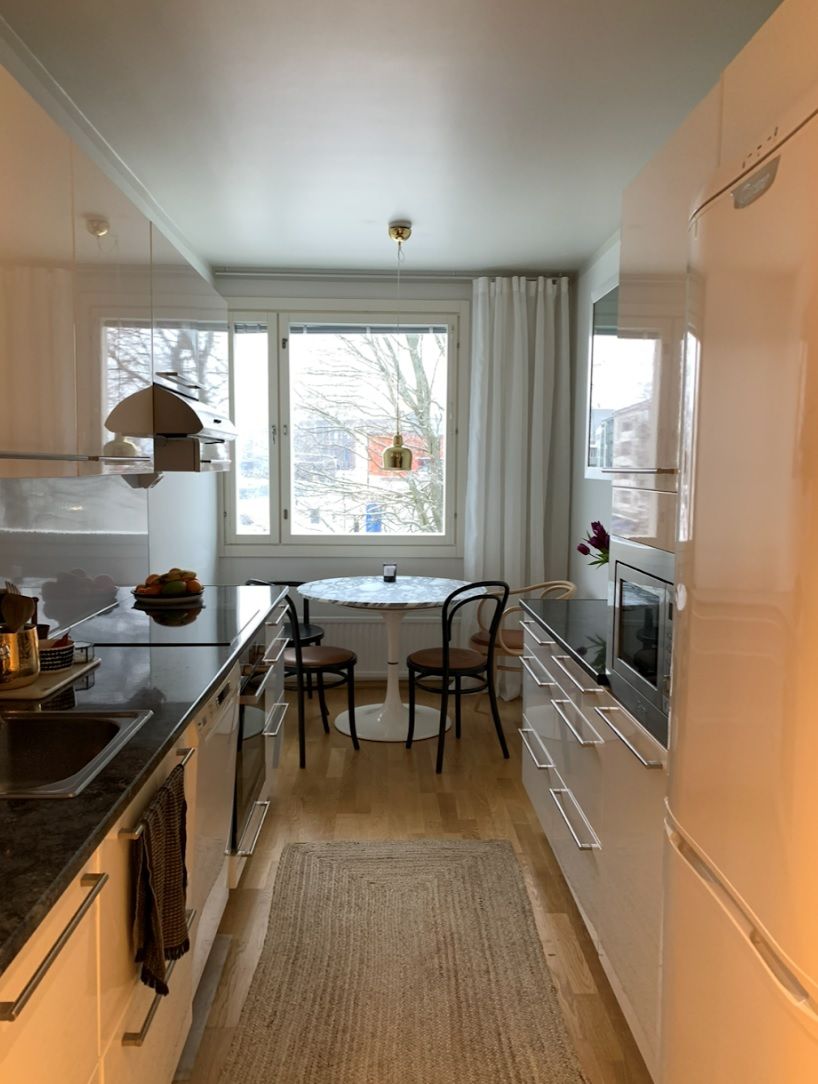 Herttoniemessä sijaitsevan kotimme keittiö kaipasi uudistusta. Edellisen omistajan tekemät materiaalivalinnat tuntuivat omaan makuumme liian geneerisiltä ja viimeistelemättömiltä. Lisäksi erillinen keittiö kapeahkossa huoneessa tuntui yläkaappien kanssa ahtaalta ja epäkäytännölliseltä.