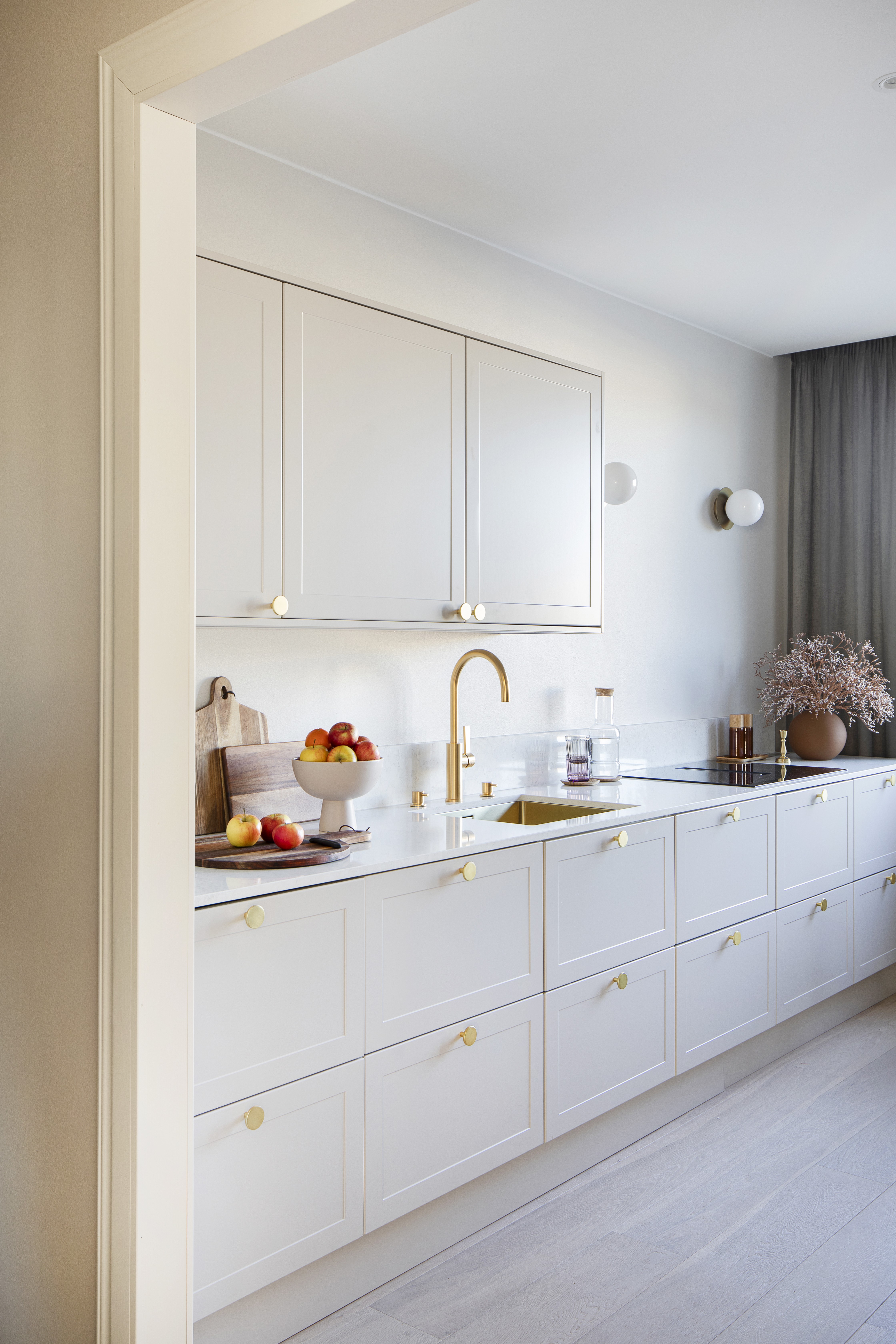 Vesipiste säilyi vanhalla paikallaan, ja sen yhteyteen saatiin integroidut astian- ja pyykinpesukoneet. Vastakkaiselle seinälle rakennettiin korkea kaapistokokonaisuus kodinkoneineen ja aamiaiskaappeineen. Kvartsitasot, kashmir-sävyiset ovet ja harkitut yksityiskohdat luovat rauhallisen ja hengittävän tunnelman.