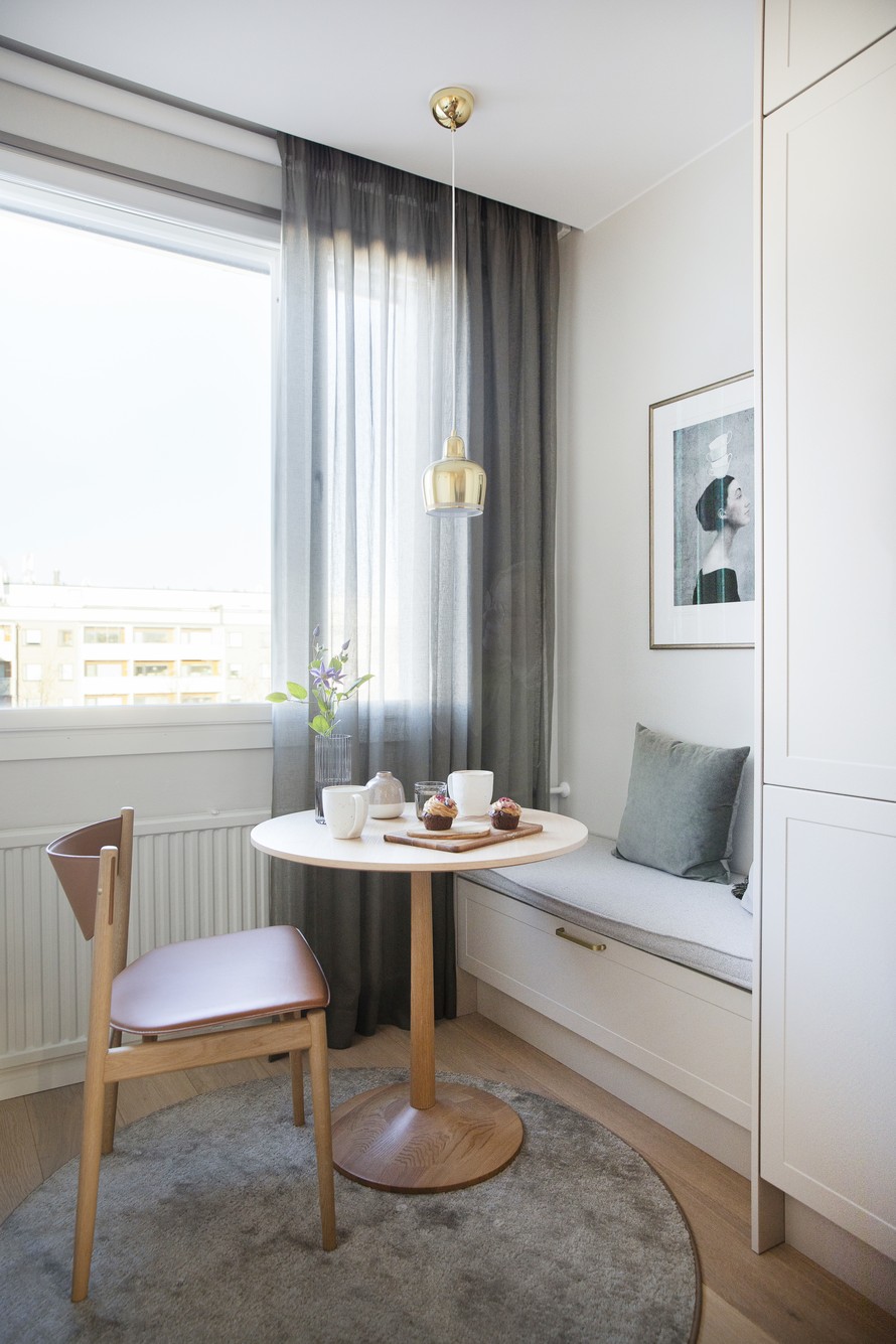 Keittiön sympaattinen yksityiskohta on ikkunan eteen rakennettu istuskelunurkka, josta on tullut asukkaiden lempipaikka koko asunnossa. Ikkunan äärellä on mukana istuskella, seurata kaupungin elämää tai tehdä etätöitä – kuin omassa pienessä kahvilassa.