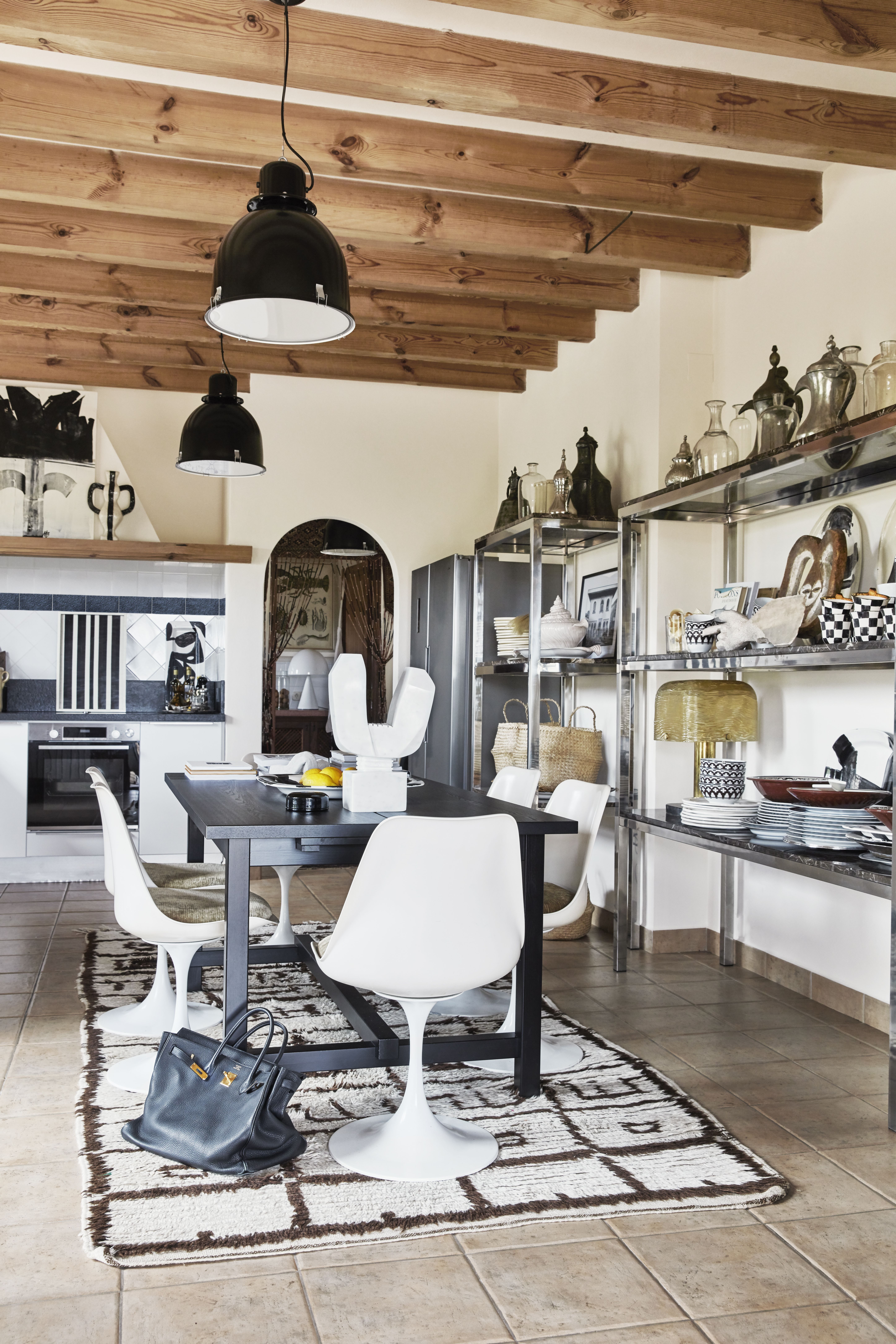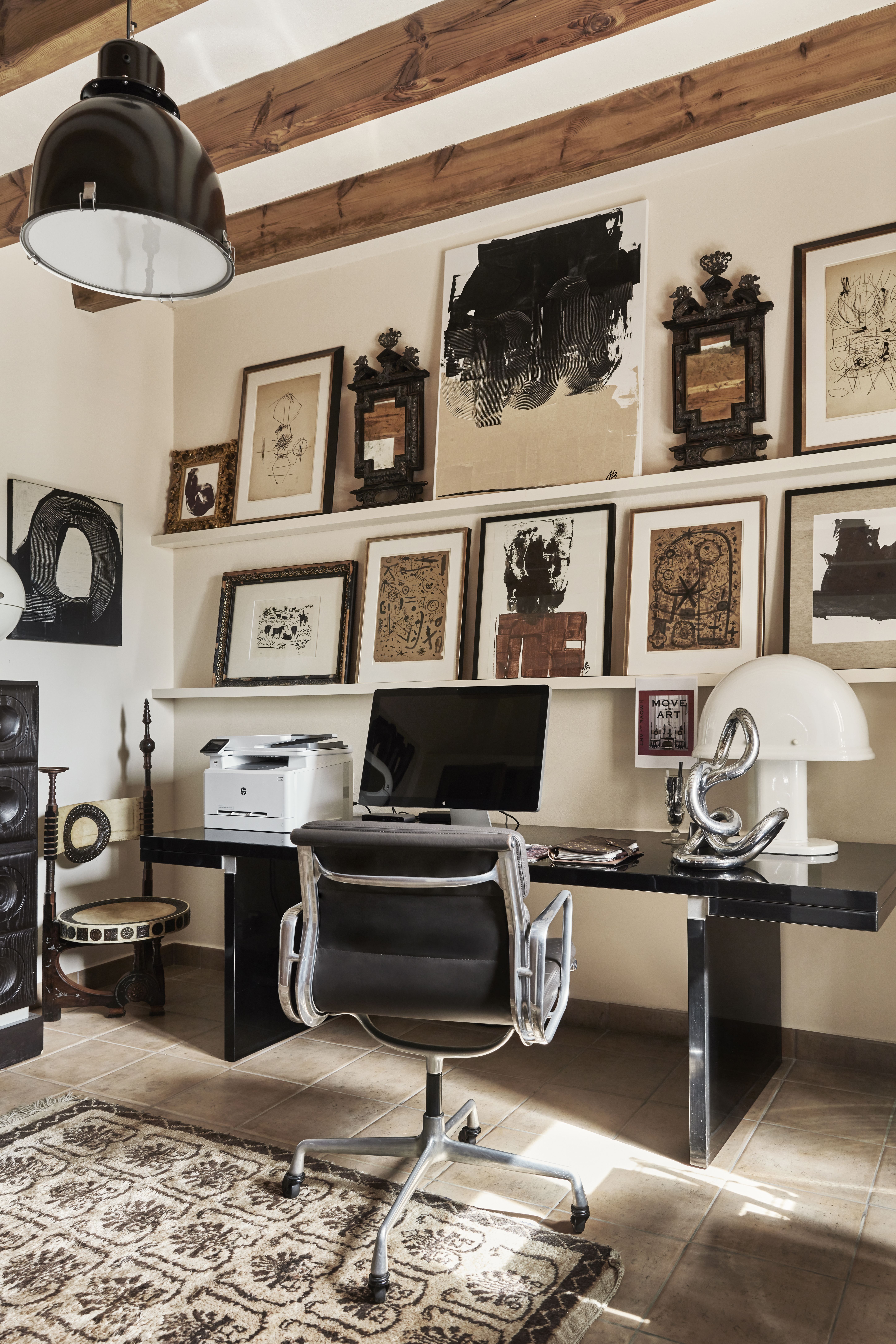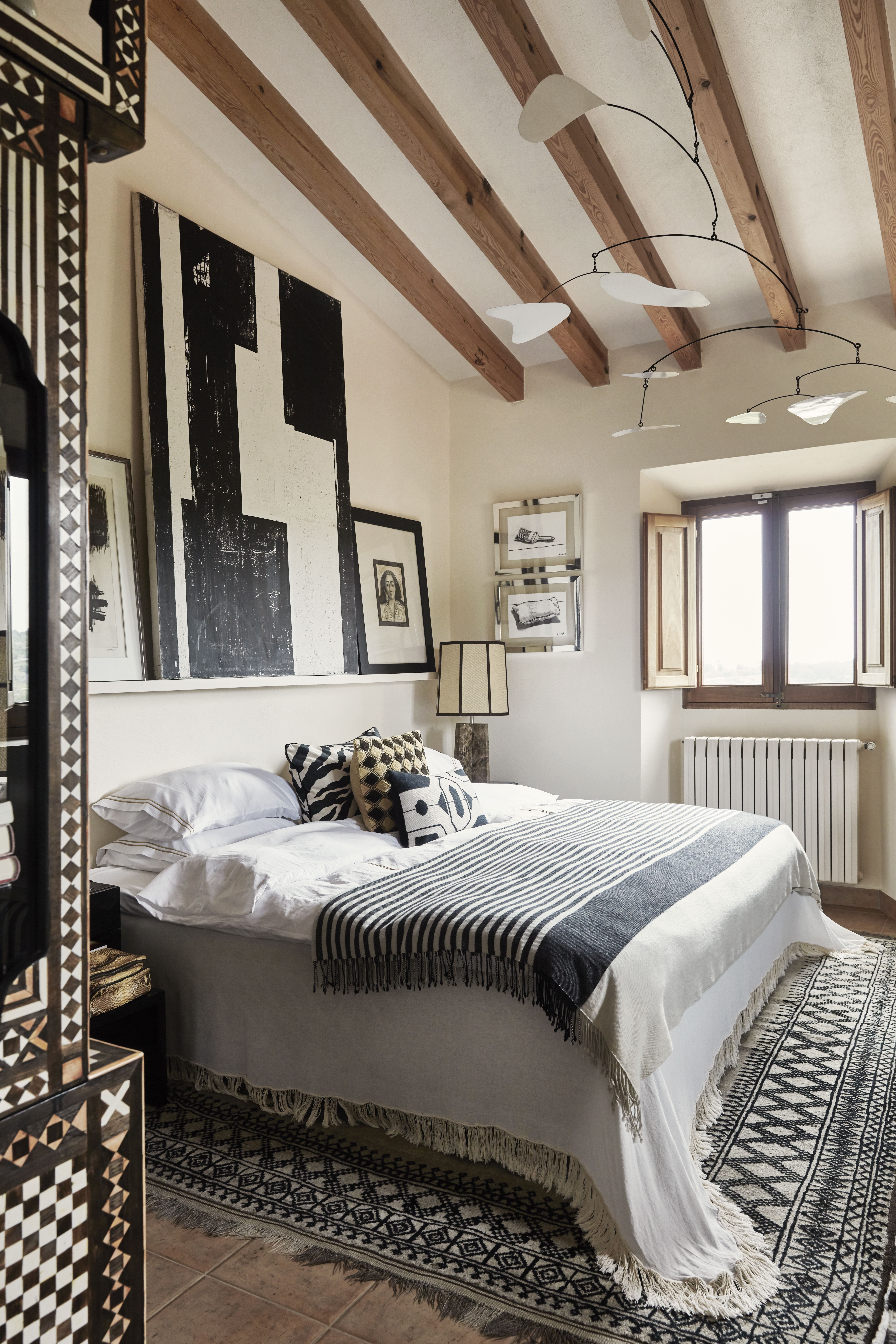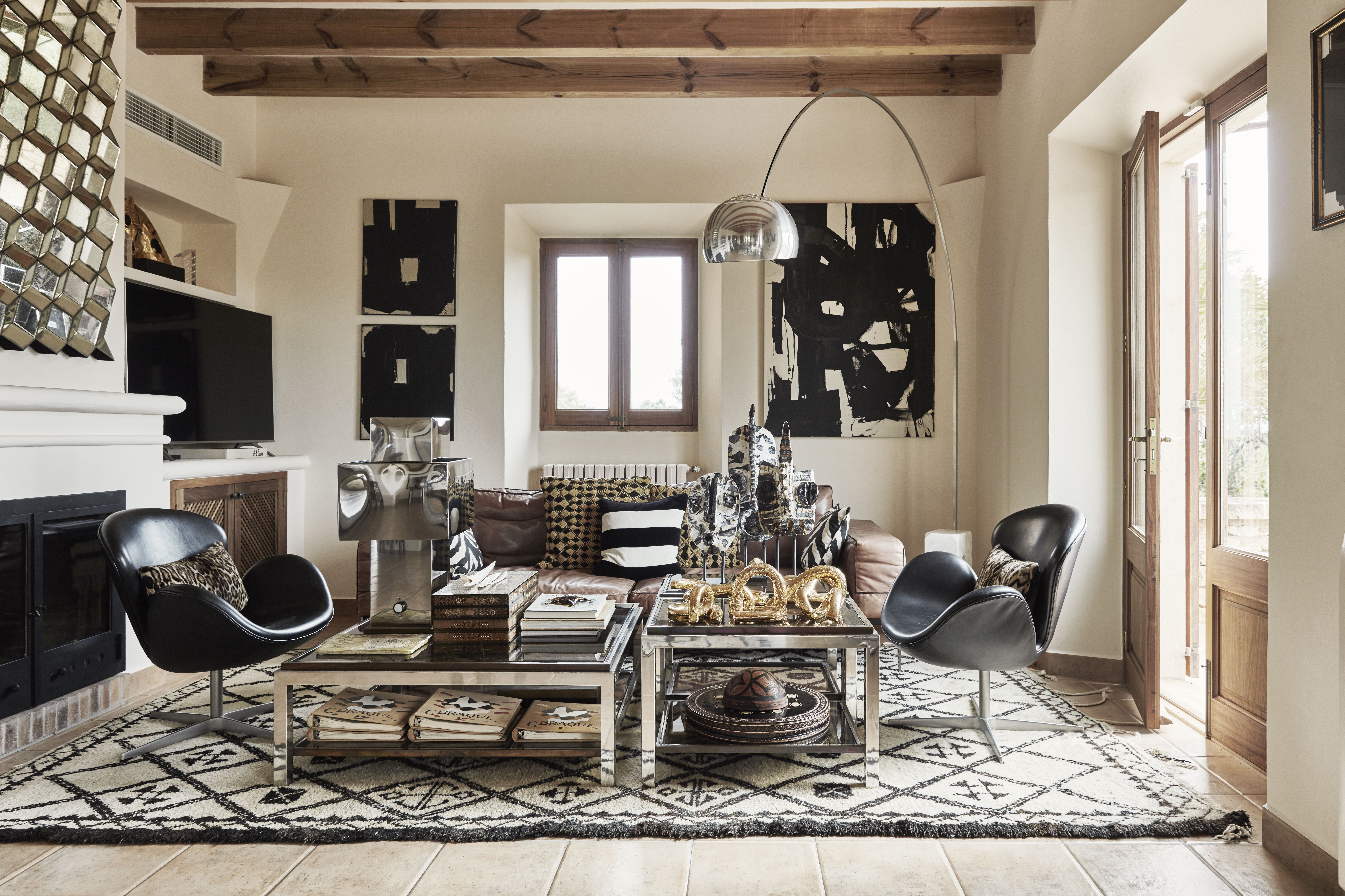 Tinkimätön ote näkyy myös Mallorcalla jo kodin aulassa, jossa vastassa ovat intialaisen palatsin kuviolliset ruusupuupylväät. Ne ovat tehneet matkan Mallorcalle Kööpenhaminan näyttelytilojen ja Italiassa sijainneen huvilan kautta. Malene on tuonut mukanaan myös vintagehuonekalujen kokoelmansa, ympäri maailmaa hankittuja mattoja, veistoksia ja kasvavan taidekokoelman, mukaan lukien hänen omat teoksensa.