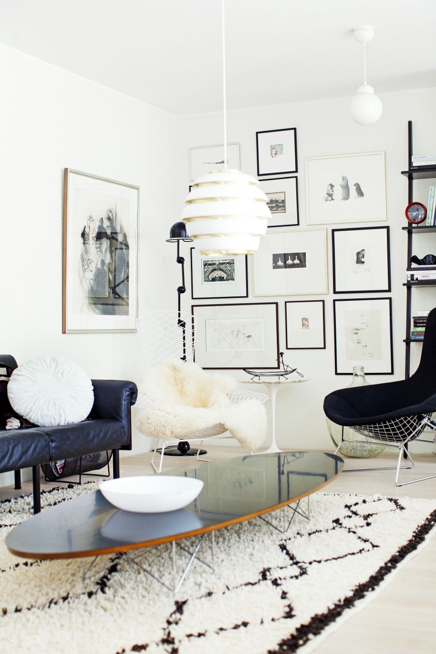 Kotimaiseen grafiikkaan ihastuneet asukkaat ovat koonneet lempiteoksensa sommitelmaksi olohuoneen päätyseinälle. Raikas ripustus, Jieldé-valaisin ja Bertoian Bird-tuolit muodostavat kutsuvan kokonaisuuden.