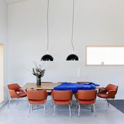 Bertoian Diamond-tuoli, Eamesin Surfboard-pöytä, Eero Aarnion Pallo-tuoli ja Kukkapuron Ateljee-sohva. Espoolaisesta olohuoneesta löytyy design-klassikoita – tässä kodissa todella pidetään designista.