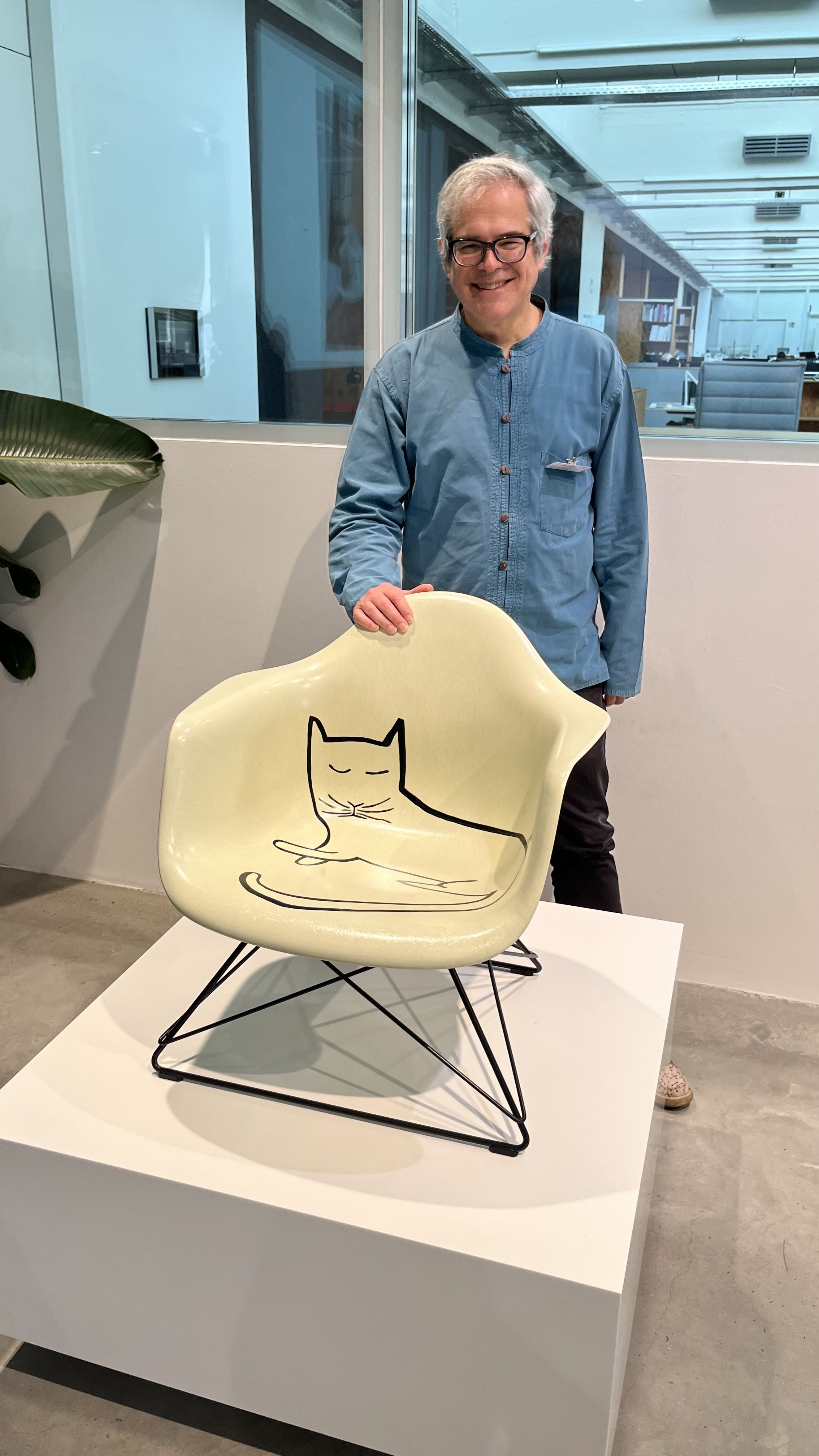 Hän esittelee ikonisen Eames Lounge Chairin ensimmäistä versiota, joka suunniteltiin Herman Millerille vuonna 1956. Kun tuoli vuotta myöhemmin lanseerattiin Vitran kautta Euroopassa, jalkaosa oli jo ehtinyt muuttua.