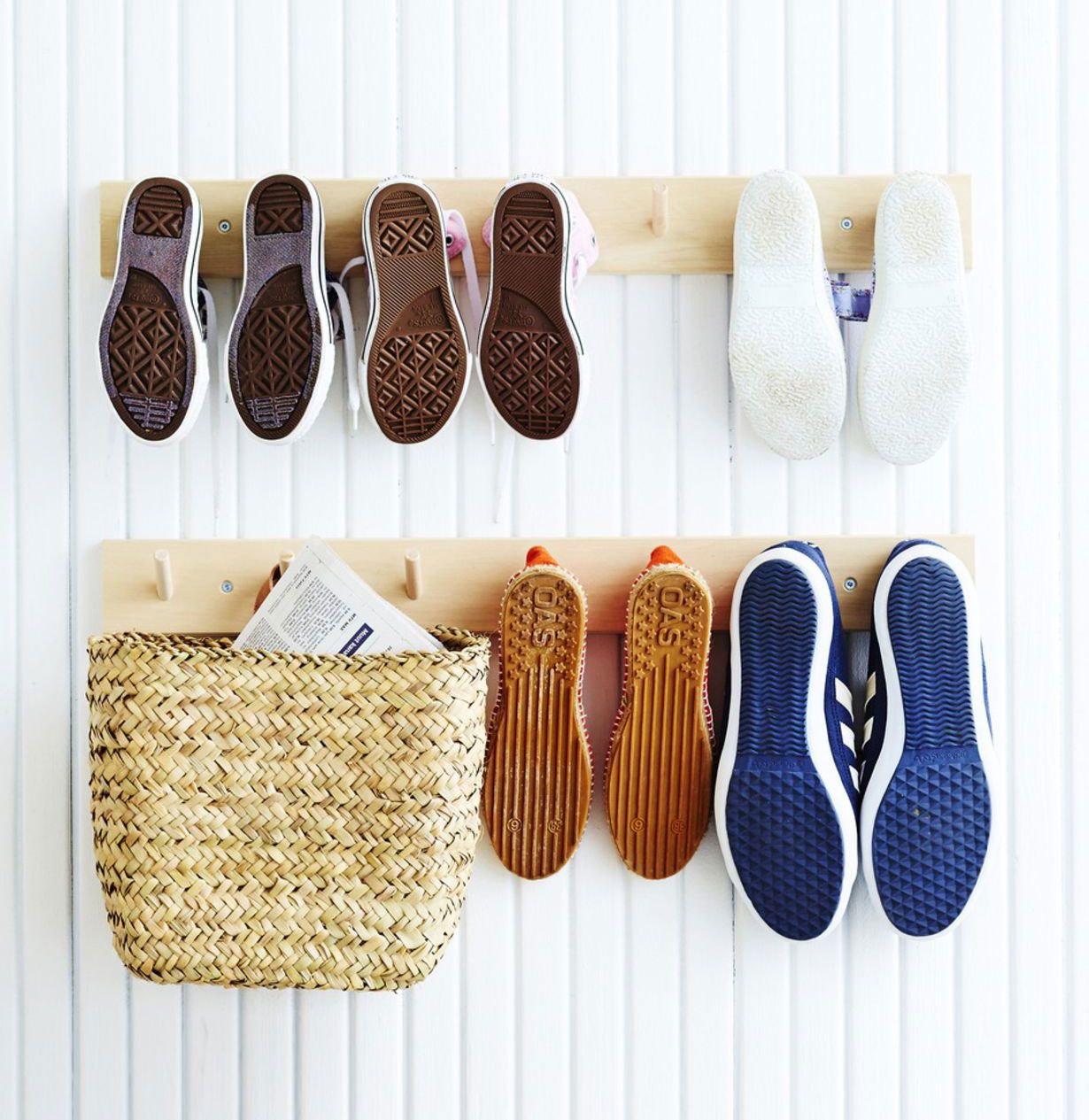 KonMarin mukaan jokaiselle tavaralle pitäisi löytää paikka sydämestämme. Filosofian mukaan voisi eteisessä sisustaa vaikka näin, jolloin perheen kymmenet (vähemmän sydämessä tuntuneet) kengät on pitänyt heittää pois. Kuva: Tuomas Kolehmainen