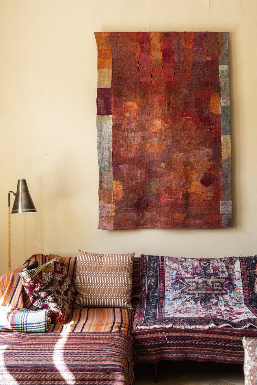 Sylimäinen sohva tuo mieleen Freudin kuuluisan sohvan. Seinälle ripustettua kuvakudosta Inka on jatkanut etnisistä tekstiileistä tutulla vapaalla otteella.